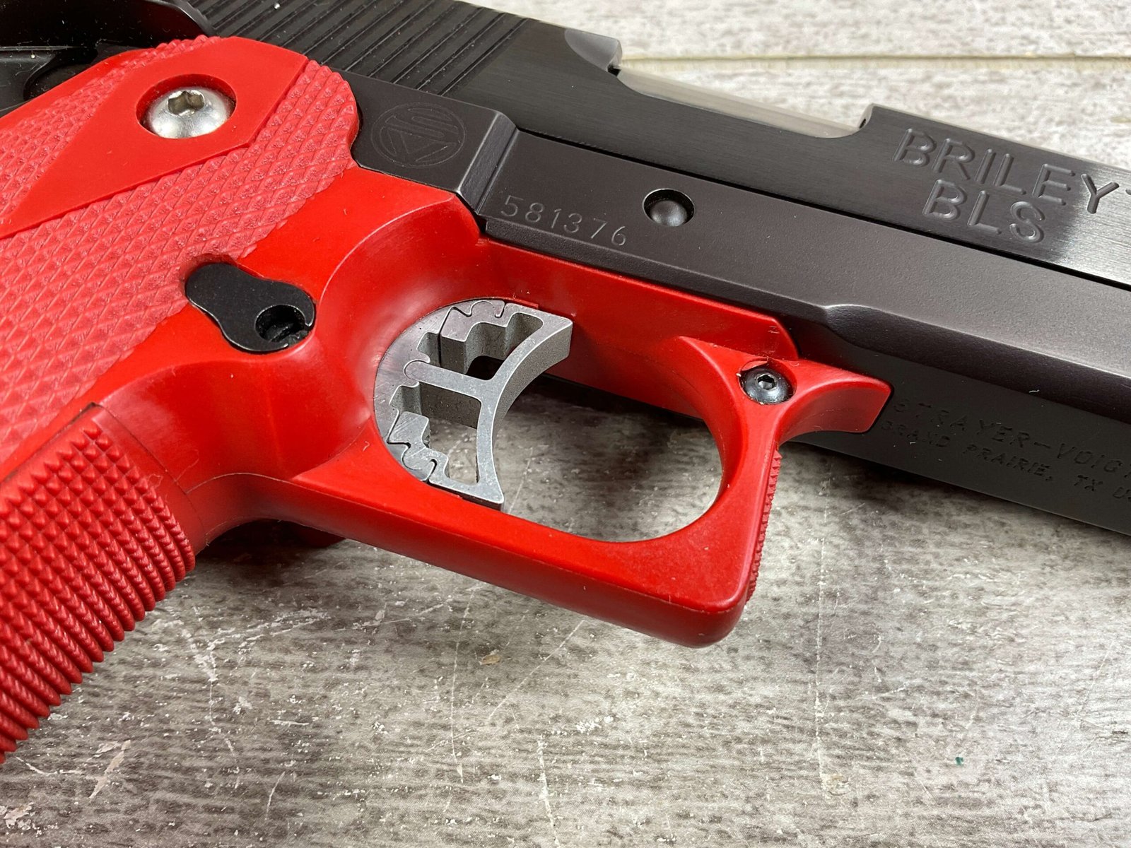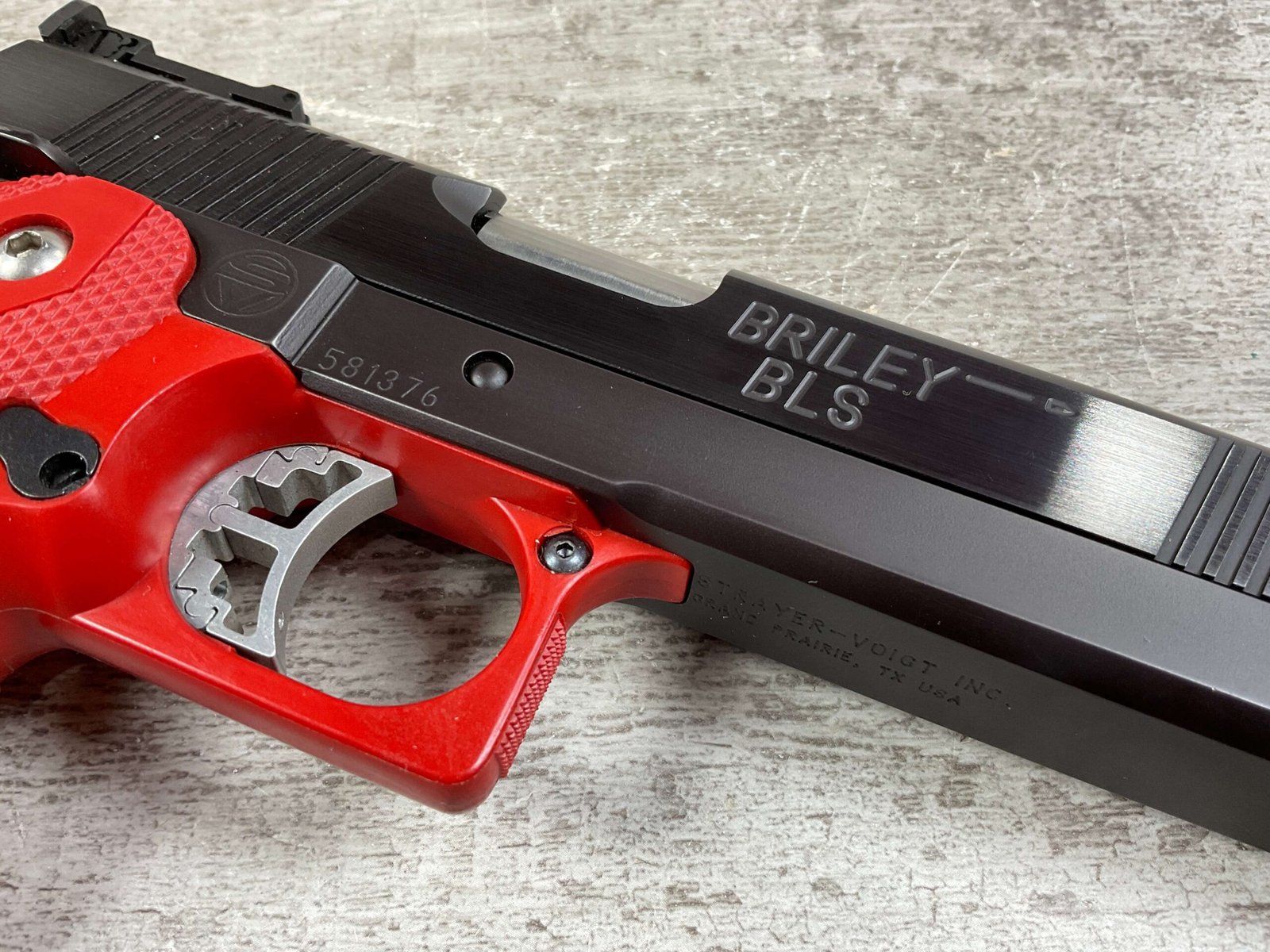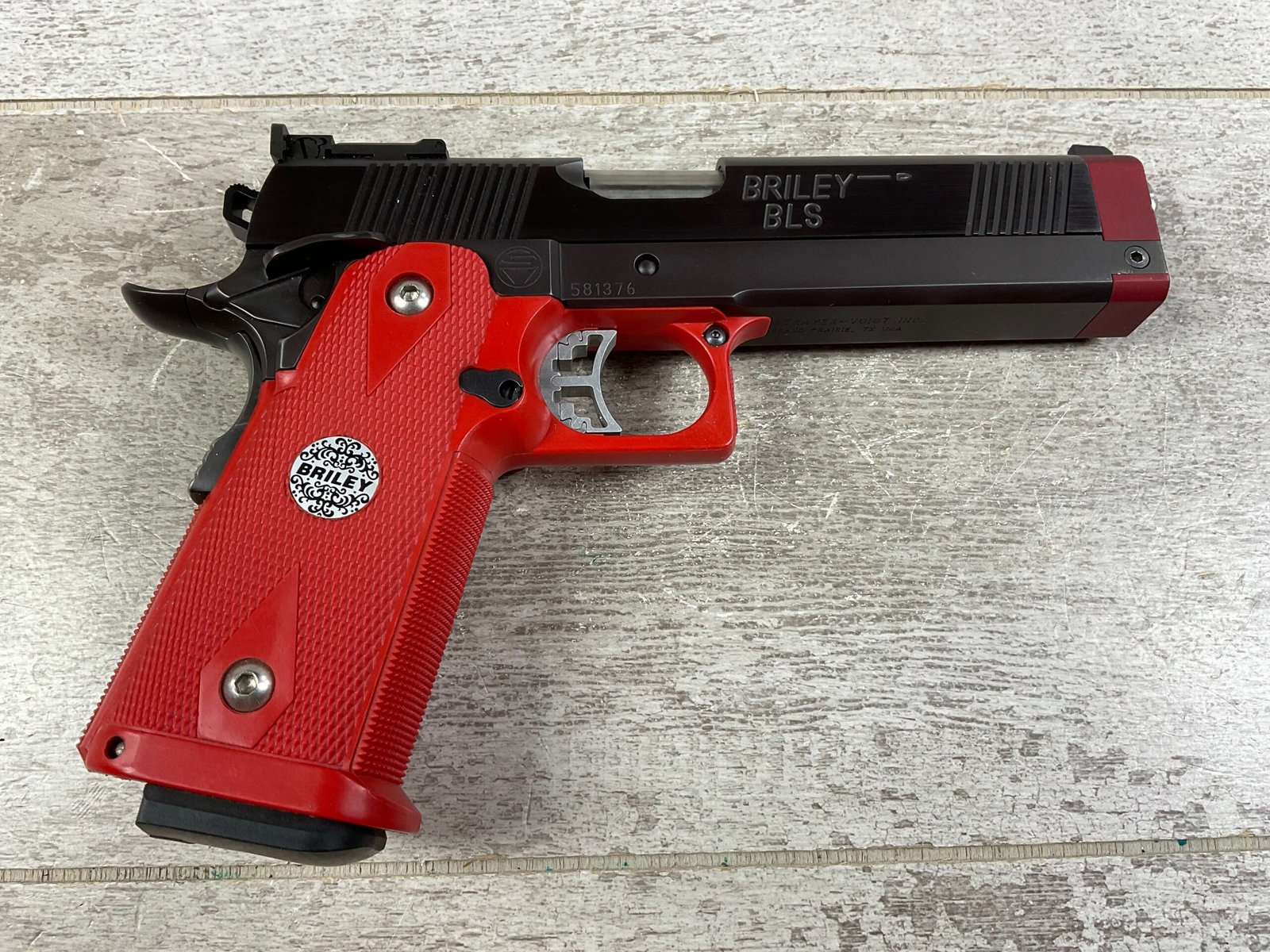 BRILEY BLS 9MM 2011 CUSTOM SEMI AUTO PISTOL, JAMES EARL JONES COLLECTION #581376, VERY CUSTOM, 5″ BRILEY BARREL, BARREL STABILIZATION SYSTEM, VERY CRISP TRIGGER, BEAUTIFUL BLUE FINISH, RED GRIP & TRIGGER GUARD, 1 MAGAZINE, EXTREMELY NICE COMPETITION GUN, CONDITION AS SHOWN IN PICTURES, FROM THE JAMES EARL JONES “FAVORITES” COLLECTION W/ CERTIFICATE OF AUTHENTICITY.
