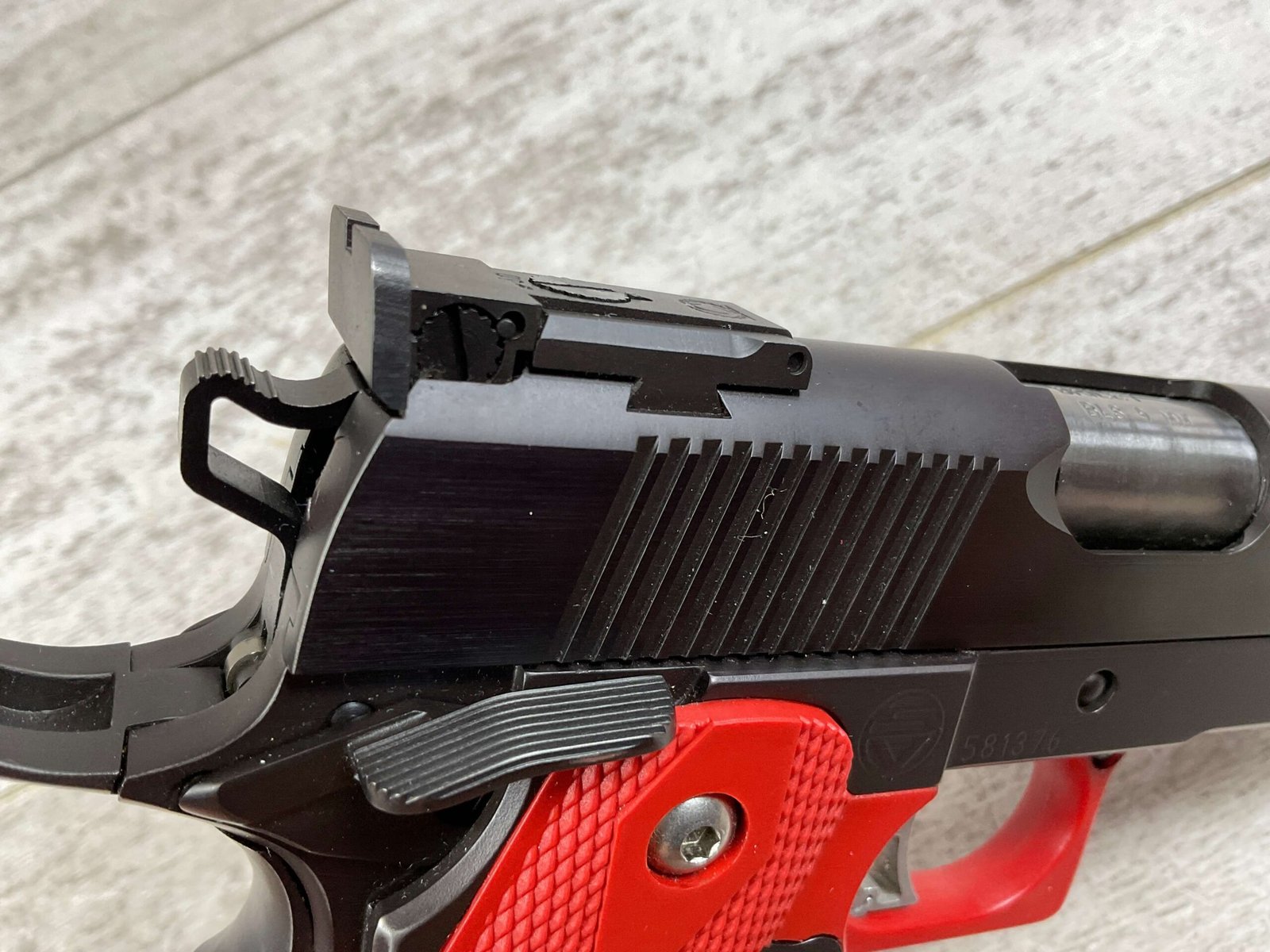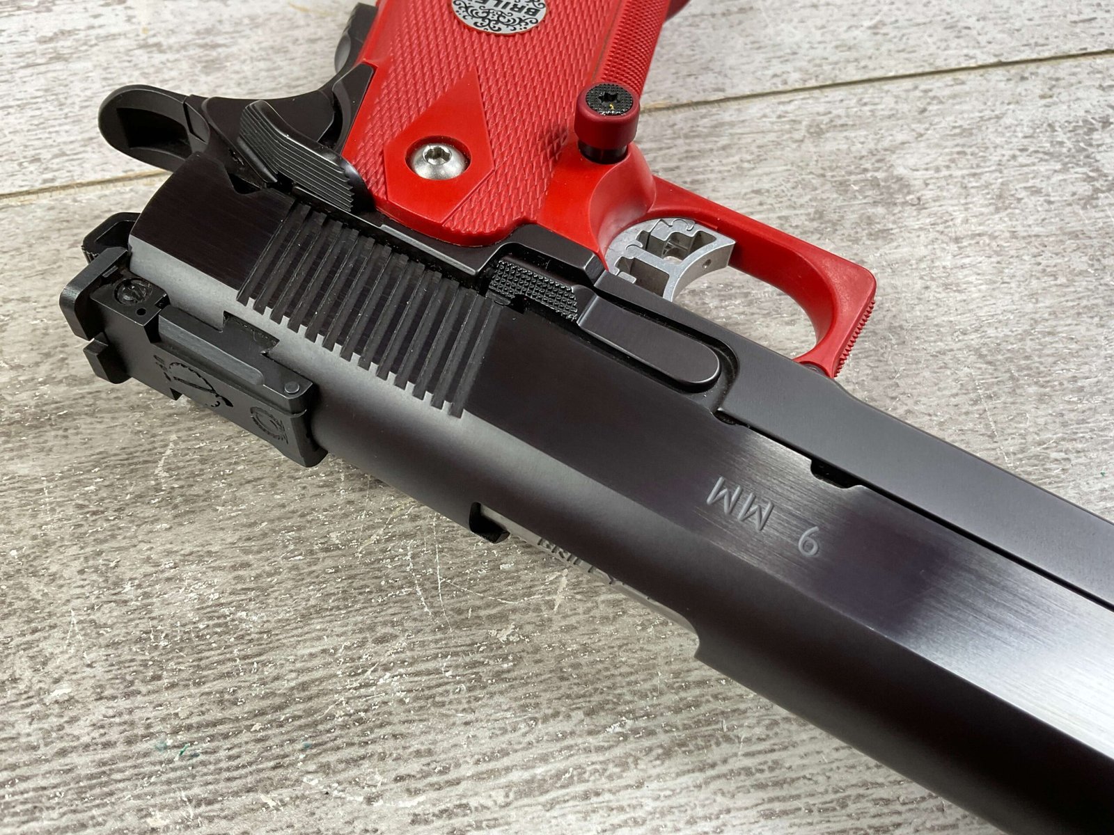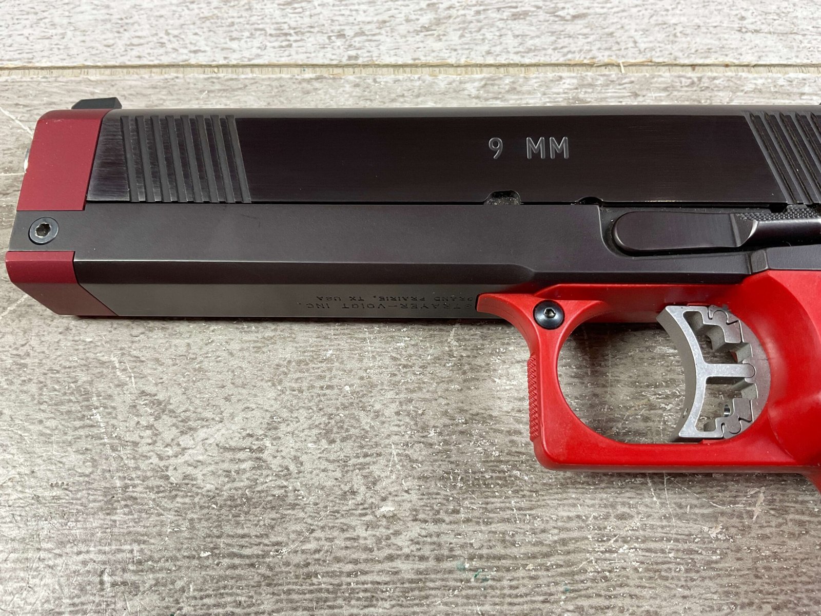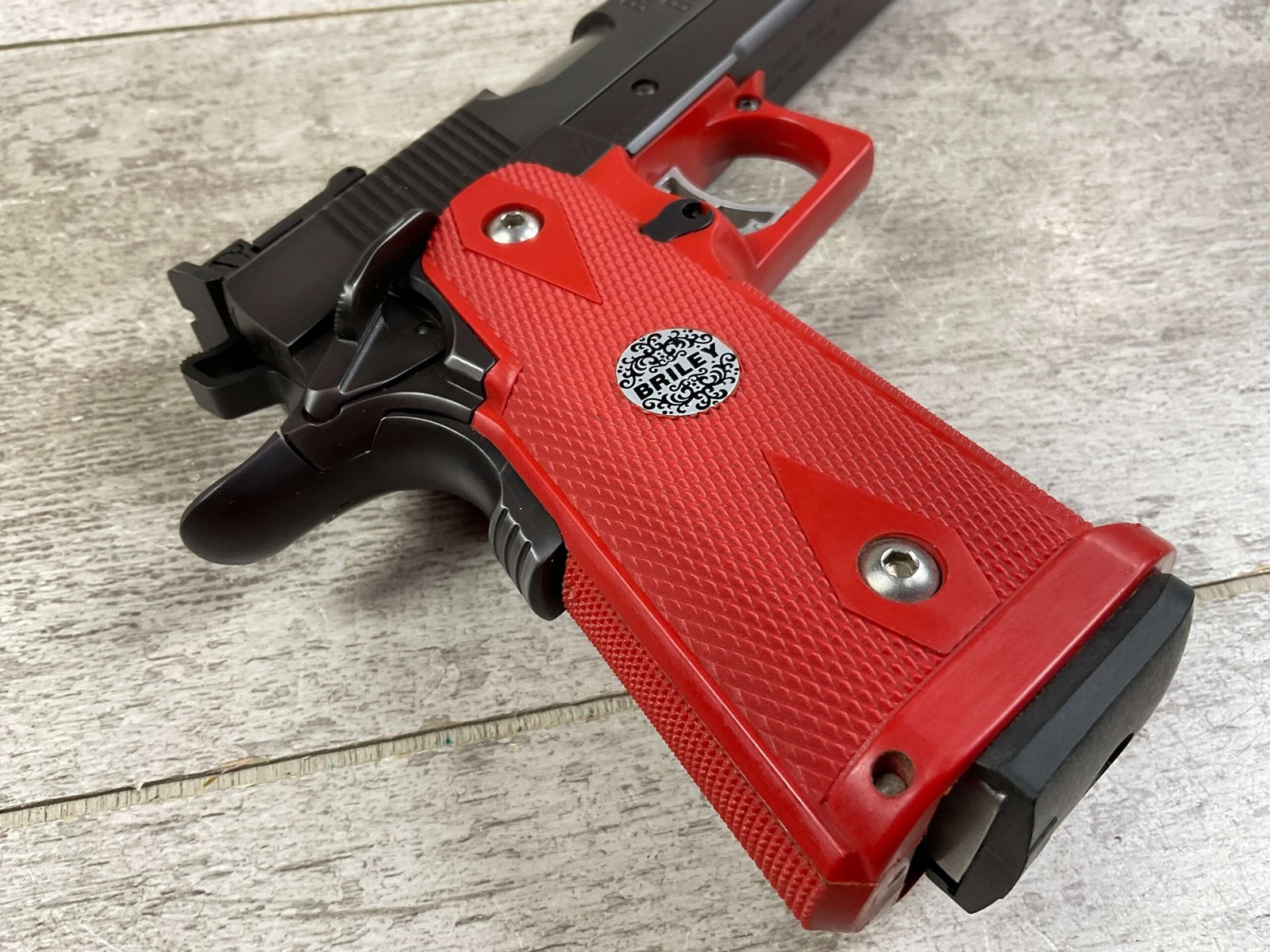 BRILEY BLS 9MM 2011 CUSTOM SEMI AUTO PISTOL, JAMES EARL JONES COLLECTION #581376, VERY CUSTOM, 5″ BRILEY BARREL, BARREL STABILIZATION SYSTEM, VERY CRISP TRIGGER, BEAUTIFUL BLUE FINISH, RED GRIP & TRIGGER GUARD, 1 MAGAZINE, EXTREMELY NICE COMPETITION GUN, CONDITION AS SHOWN IN PICTURES, FROM THE JAMES EARL JONES “FAVORITES” COLLECTION W/ CERTIFICATE OF AUTHENTICITY.