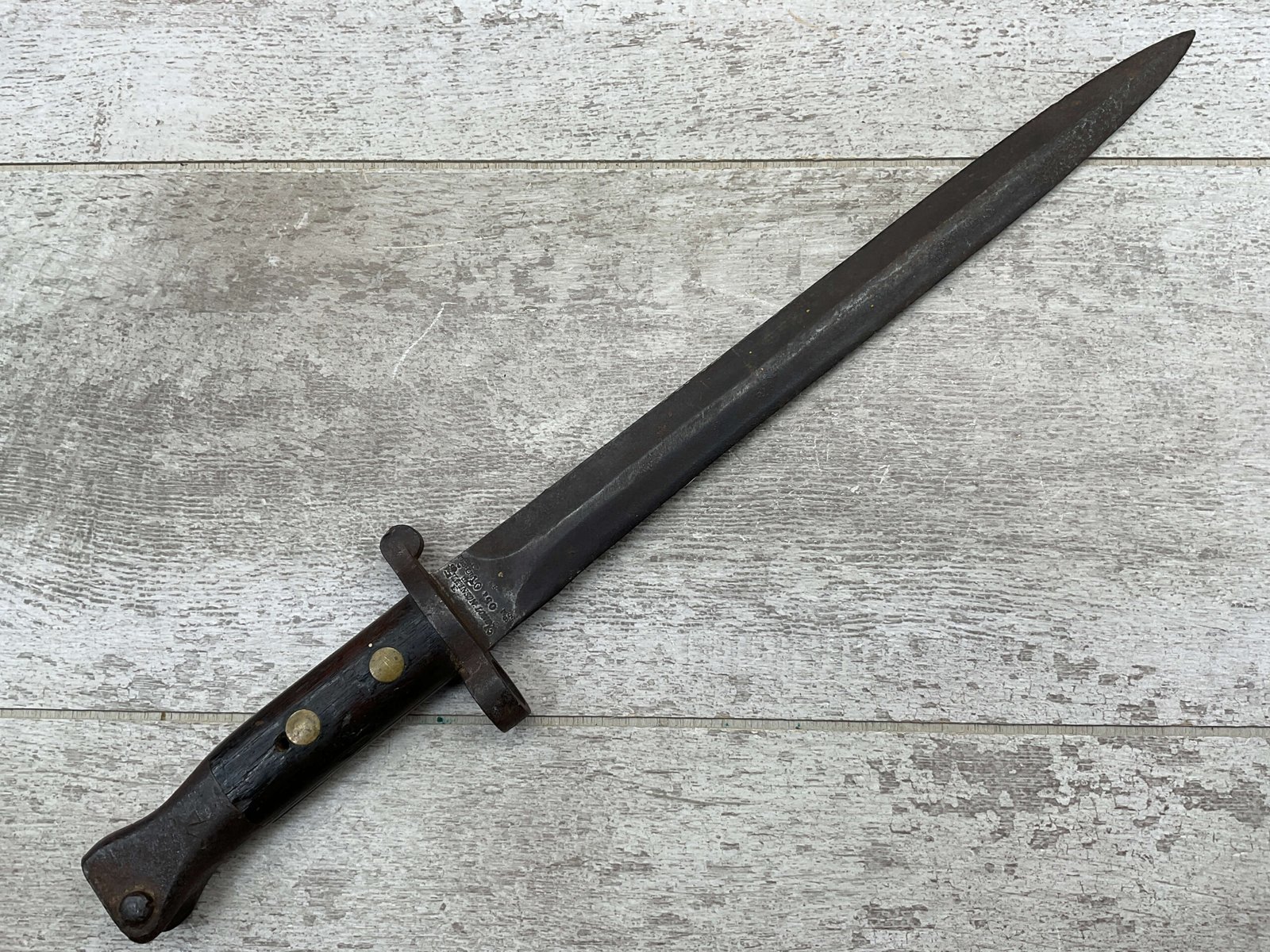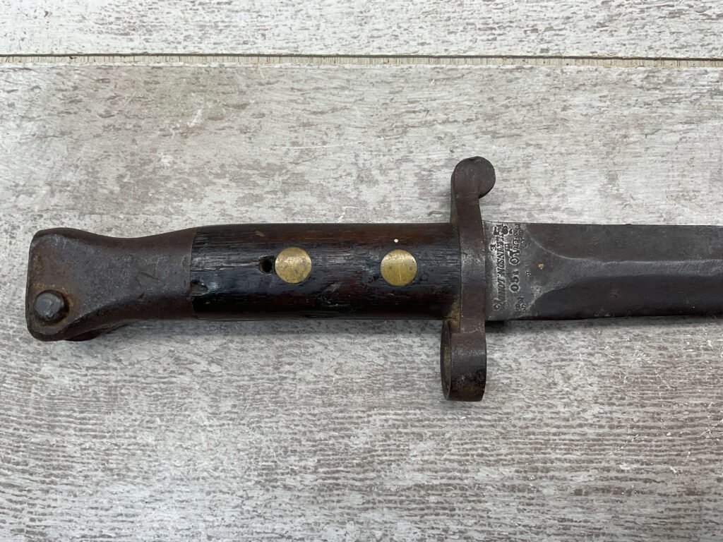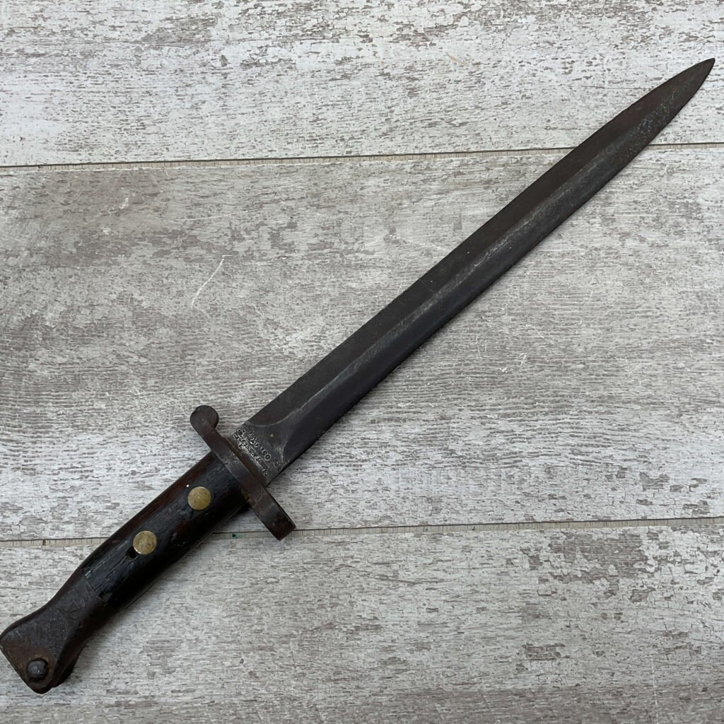 BRITISH 1888 PATTERN BAYONET, 16 15/16″ OVERALL LENGTH, 11 11/16″ BLADE LENGTH, BLADE MARKED “WILKINSON LONDON” WITH OTHER MARKINGS & BRITISH PROOFS, PRESS STUD DOESN’T DEPRESS, FAIR OVERALL