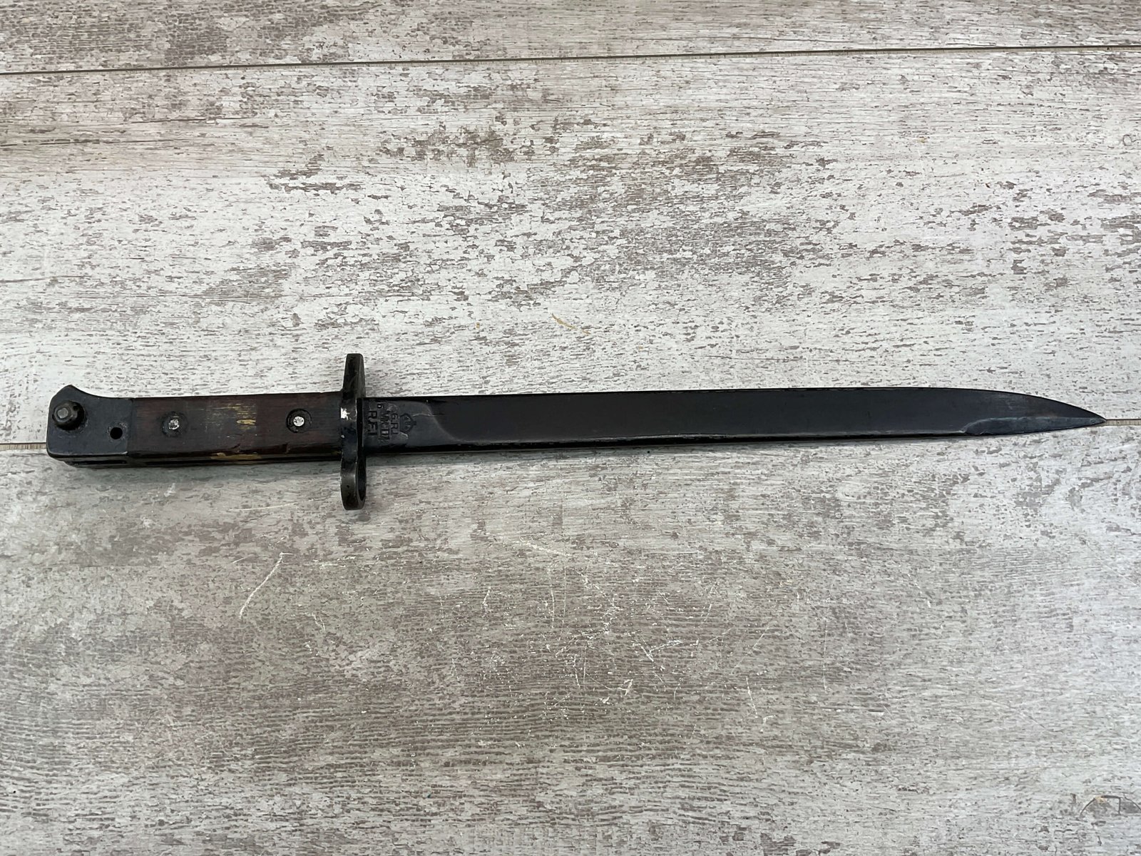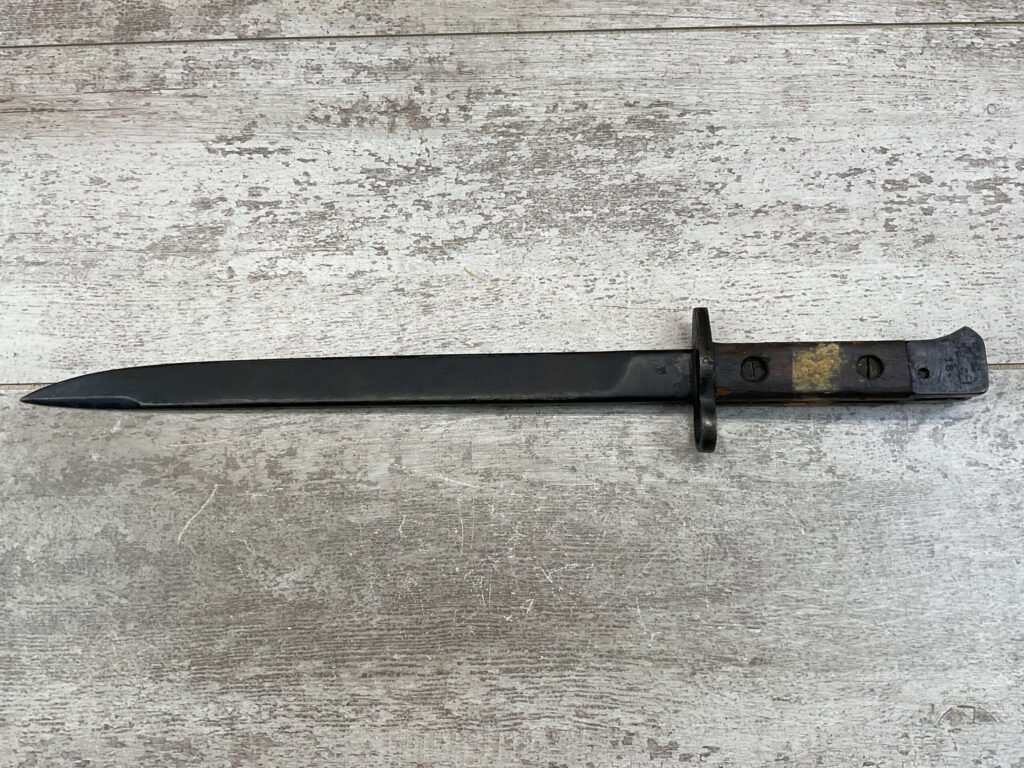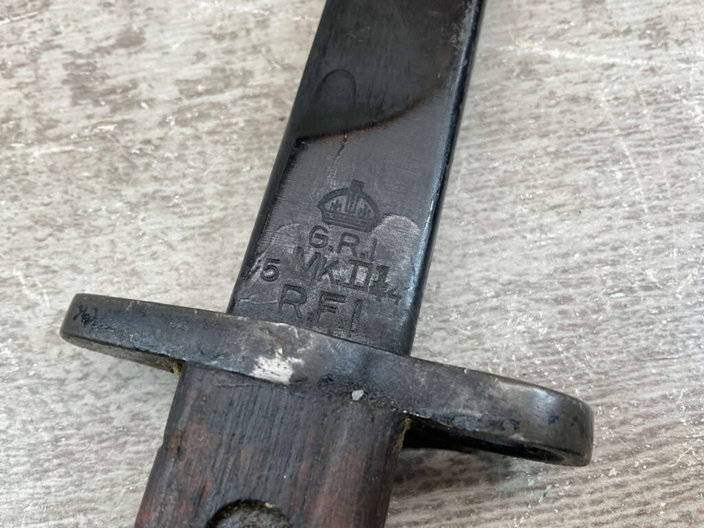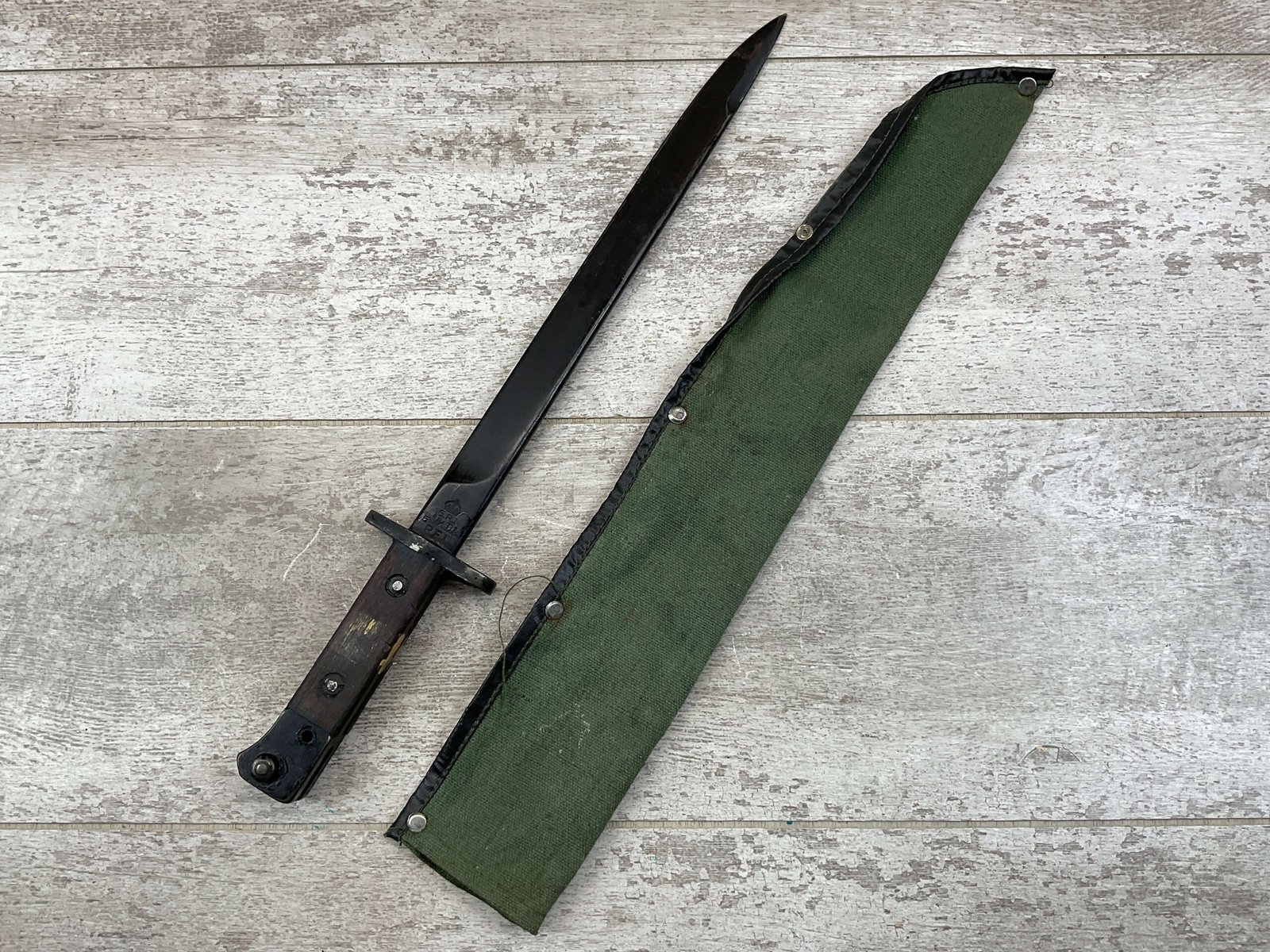 BRITISH/INDIA LEE ENFIELD 1944 GRI MKII BAYO W/ CANVAS SHEATH, VINTAGE, MISSING ORIGINAL SCABBARD BUT HAS A CANVAS SHEATH INCLUDED, RICASSO STAMPED WITH ROYAL CYPHER OF KING GEORGE VI, EMPEROR OF INDIA, A CROWNED G.R.I, OTHER SIDE OF RICASSO DISPLAYS CLEAR INSPECTION/ACCEPTANCE STAMPS “IS / 212”, “SA / 209” & “5”, POMMEL STAMPED WITH SERIAL #18, GUARD ABOVE RICASSO MARKED “DP†ON ONE SIDE, HANDLE HAS YELLOW RING AROUND IT, OVERALL CONDITION IS GOOD FOR AGE.