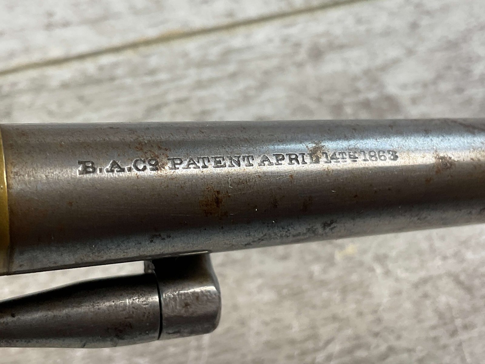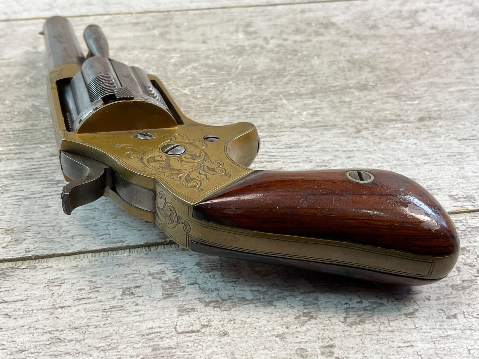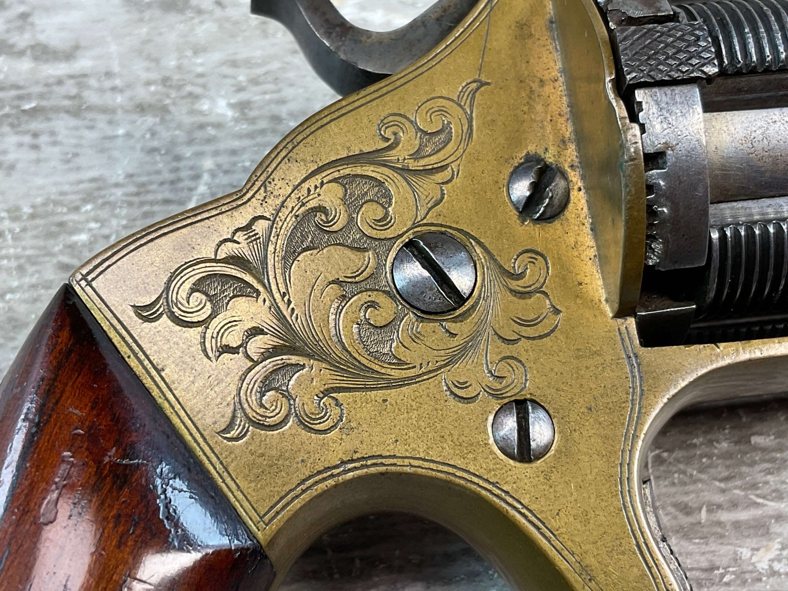 BROOKLYN ARMS SLOCUM SLIDING CHAMBER .32 RF REVOLVER, JAMES EARL JONES COLLECTION #5698, 3″ BARREL, 5 SHOT CYLINDER, VG-EXC BRASS W/NICE ENGRAVING, EXC SMOOTH ROSEWOOD GRIPS, DARK BORE, CYLINDER DESIGNED W/ 5 INDIVIDUAL CHAMBERS IN THE FORM OF SLIDING TUBES, VERY COOL HISTORY ON THIS ONE!! CONDITION AS SHOWN IN PICTURES, FROM THE JAMES EARL JONES “FAVORITES” COLLECTION W/ CERTIFICATE OF AUTHENTICITY.