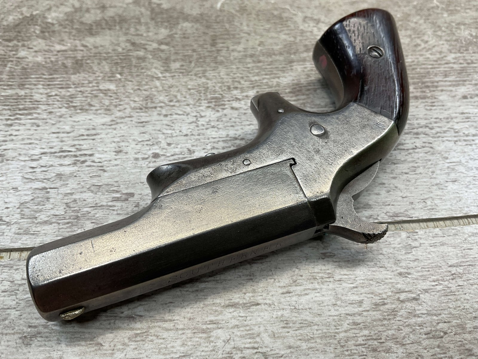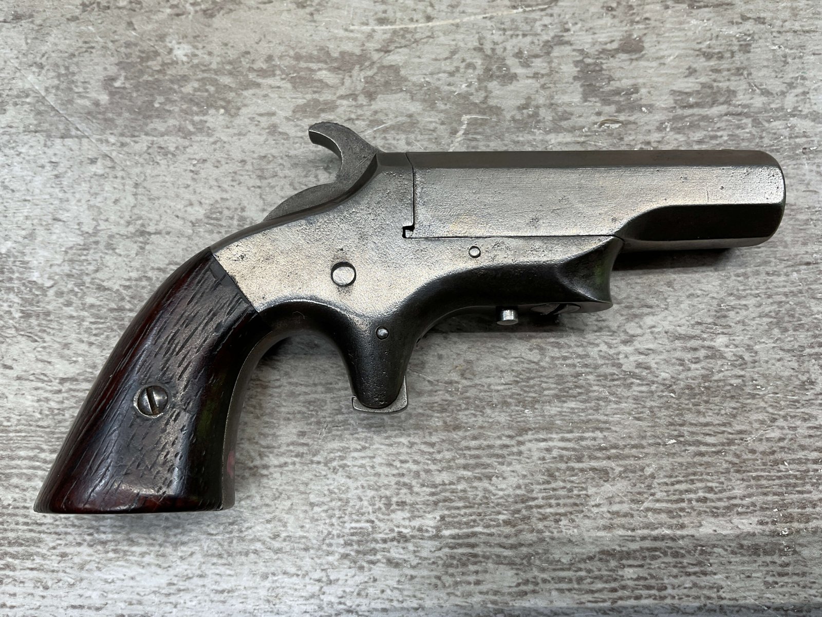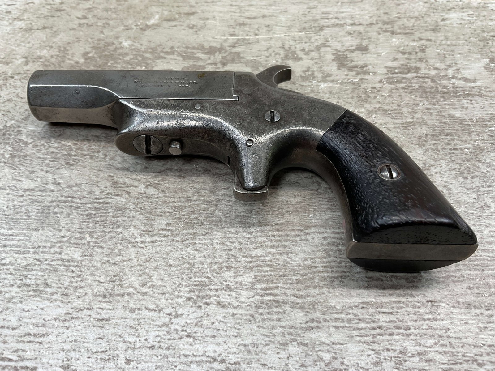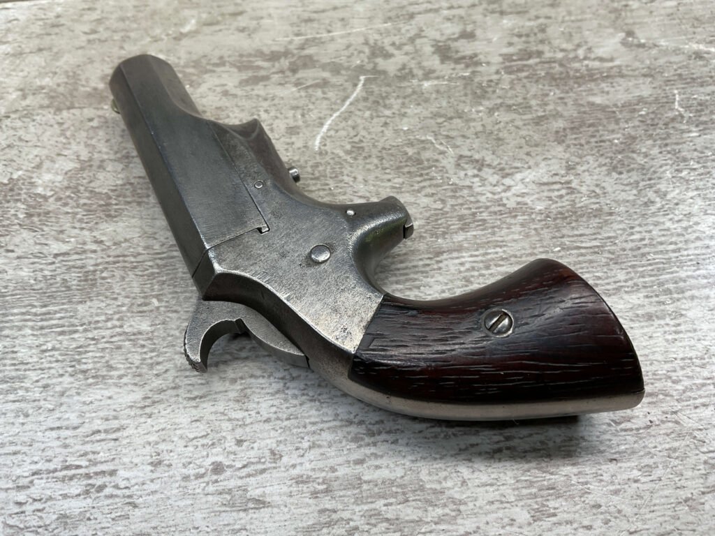 BROWN MF’G. CO. “SOUTHERNER” .41RF DERRINGER SINGLE SHOT PISTOL, ANTIQUE #4436, ALL MATCHING, 2 3/8″ SIDE PIVOTING BARREL, IRON FRAME, MAKER MARKED “BROWN MF’G. CO. / NEWBURYPORT. MASS. / PAT. APR. 9. 1867”, MOSTLY FADED BLUE HAS TURNED GREY PATINA, DARK FROSTED BORE W/ FAIR RIFLING, EJECTOR DOES NOT WORK, EXC SMOOTH WALNUT GRIPS (MATCHING), NOT A REPRODUCTION, OVERALL CONDITION AS SEEN IN PHOTOS