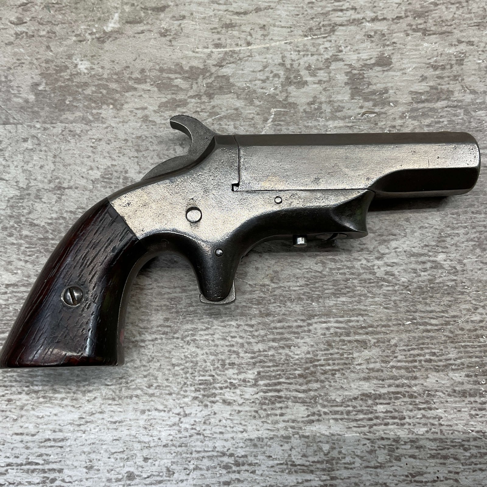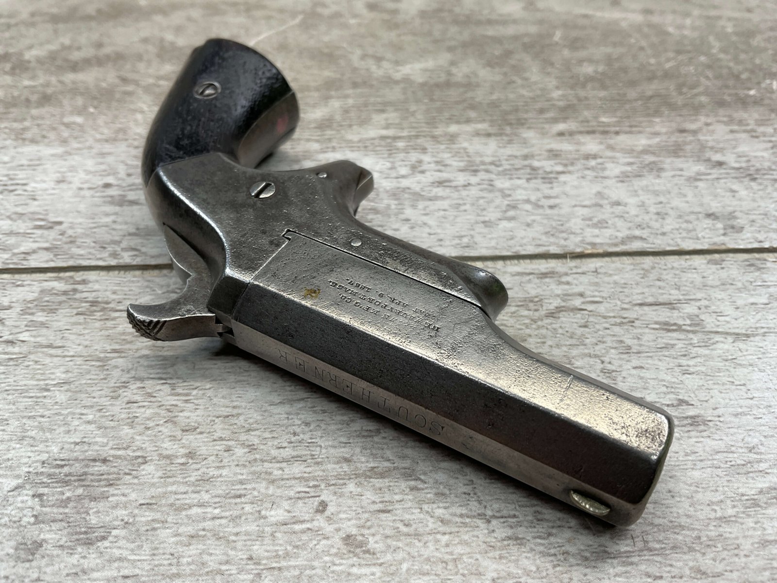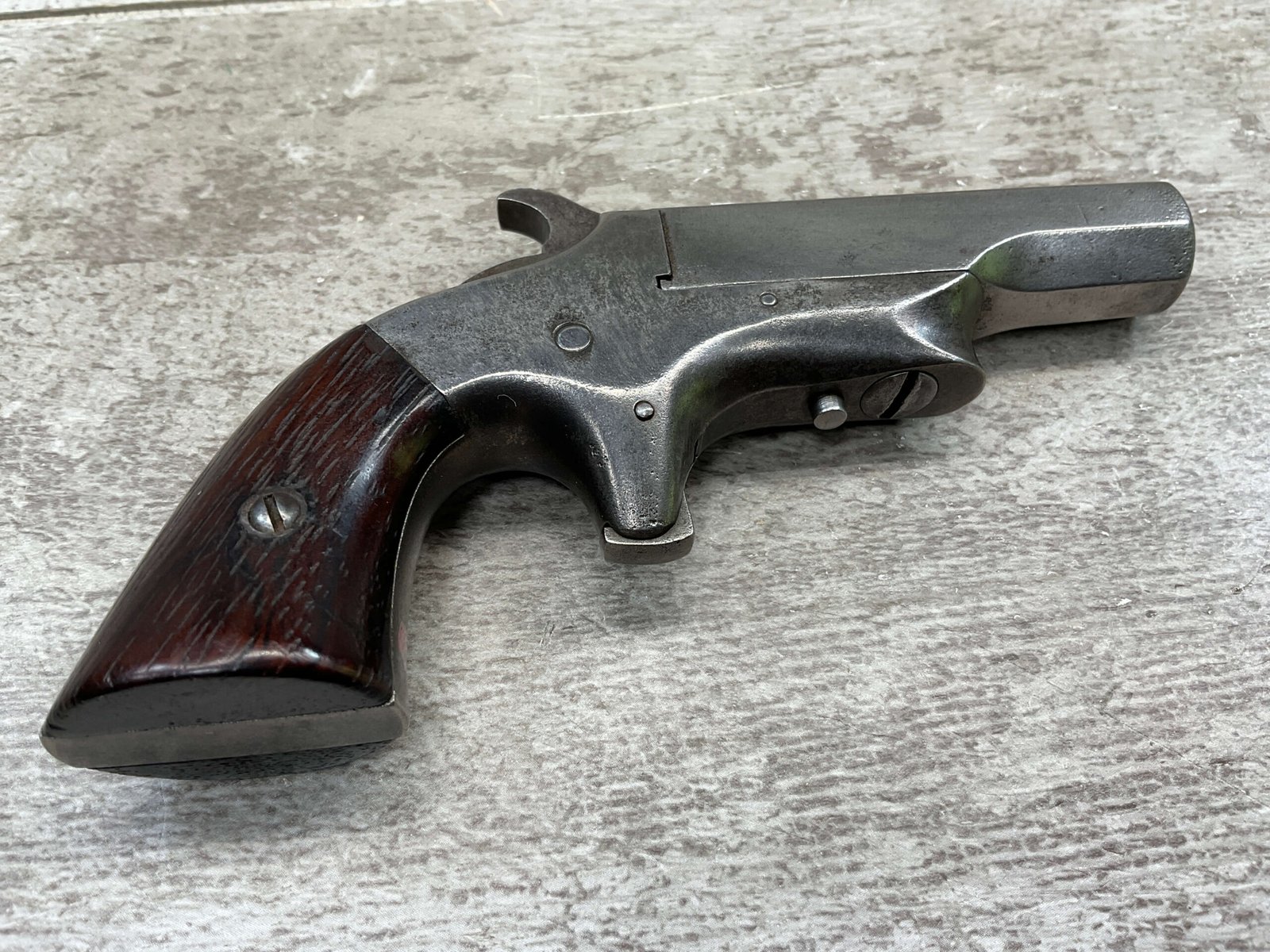 BROWN MF’G. CO. “SOUTHERNER” .41RF DERRINGER SINGLE SHOT PISTOL, ANTIQUE #4436, ALL MATCHING, 2 3/8″ SIDE PIVOTING BARREL, IRON FRAME, MAKER MARKED “BROWN MF’G. CO. / NEWBURYPORT. MASS. / PAT. APR. 9. 1867”, MOSTLY FADED BLUE HAS TURNED GREY PATINA, DARK FROSTED BORE W/ FAIR RIFLING, EJECTOR DOES NOT WORK, EXC SMOOTH WALNUT GRIPS (MATCHING), NOT A REPRODUCTION, OVERALL CONDITION AS SEEN IN PHOTOS