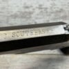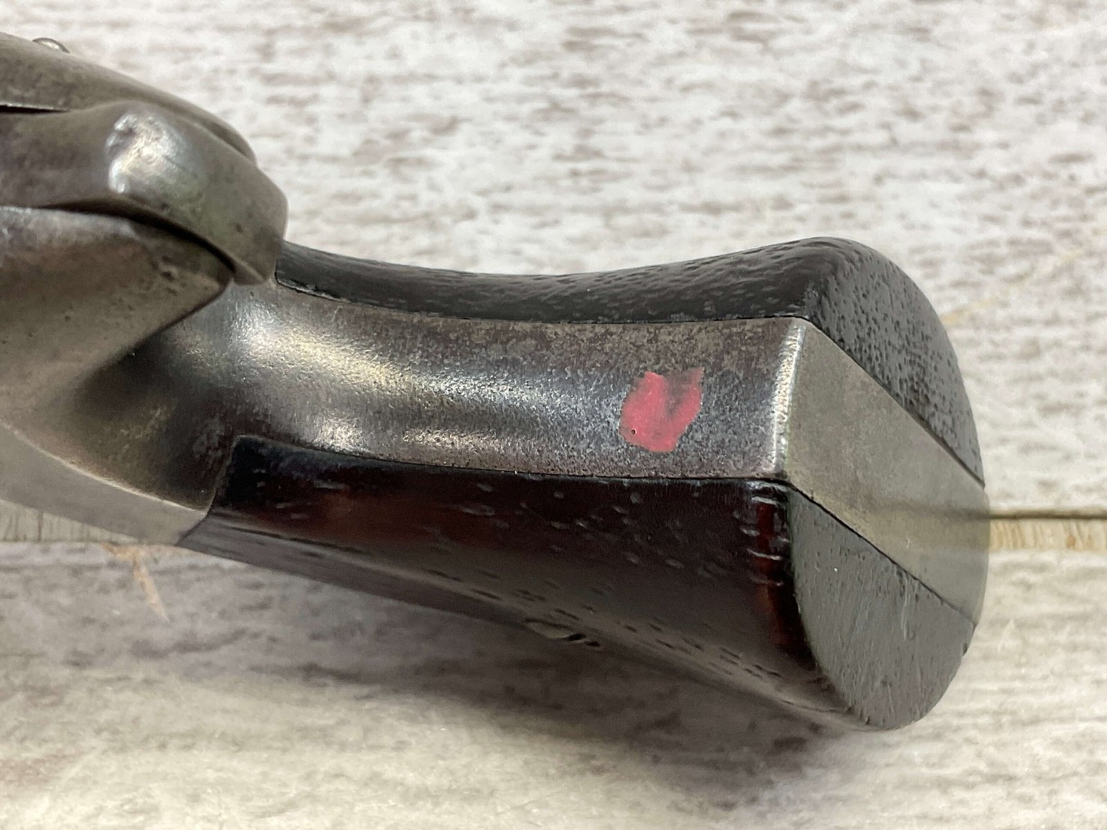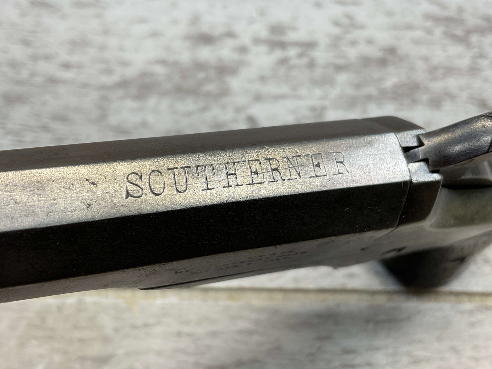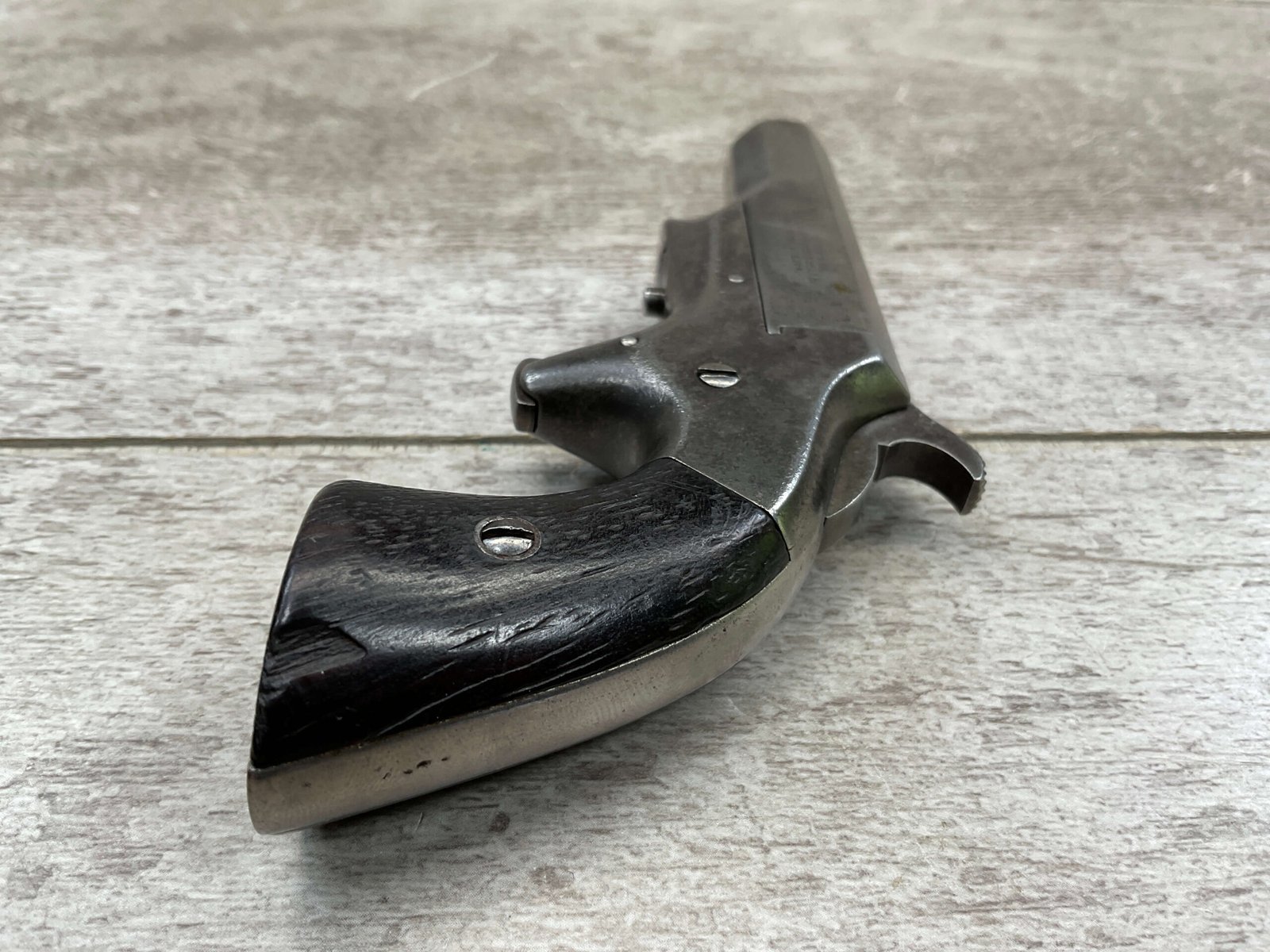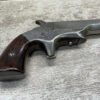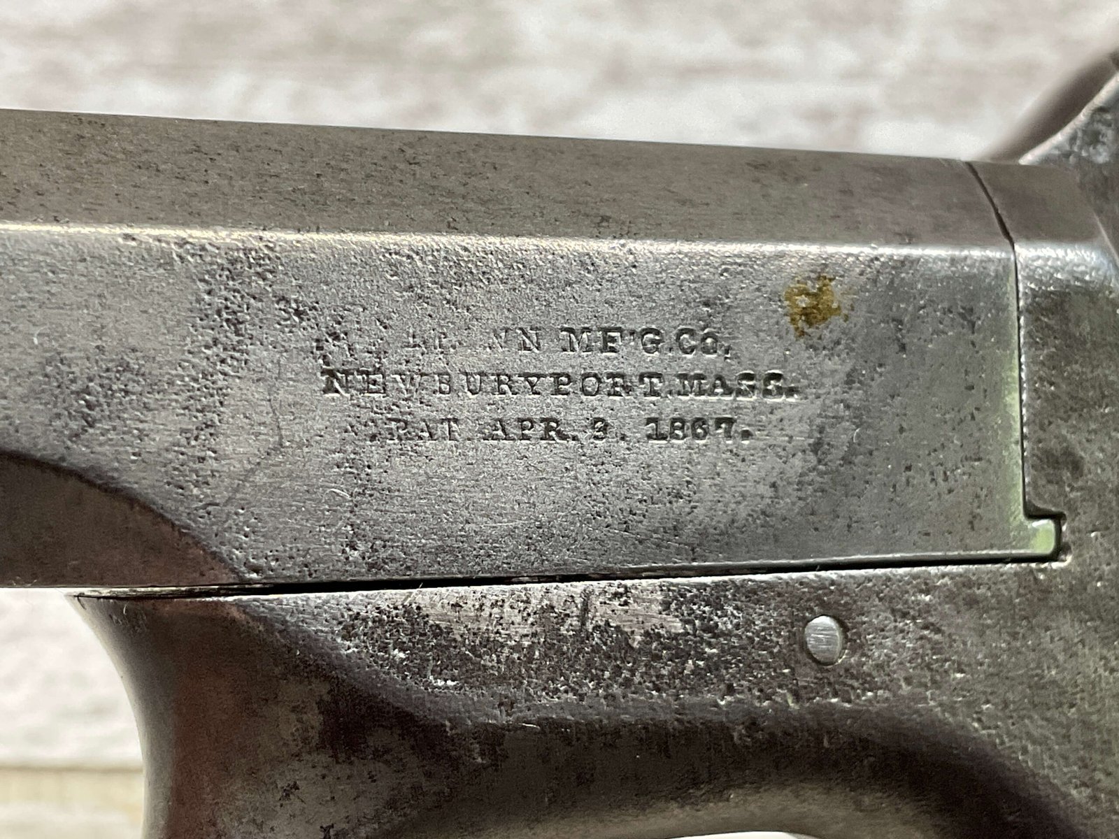 BROWN MF’G. CO. “SOUTHERNER” .41RF DERRINGER SINGLE SHOT PISTOL, ANTIQUE #4436, ALL MATCHING, 2 3/8″ SIDE PIVOTING BARREL, IRON FRAME, MAKER MARKED “BROWN MF’G. CO. / NEWBURYPORT. MASS. / PAT. APR. 9. 1867”, MOSTLY FADED BLUE HAS TURNED GREY PATINA, DARK FROSTED BORE W/ FAIR RIFLING, EJECTOR DOES NOT WORK, EXC SMOOTH WALNUT GRIPS (MATCHING), NOT A REPRODUCTION, OVERALL CONDITION AS SEEN IN PHOTOS