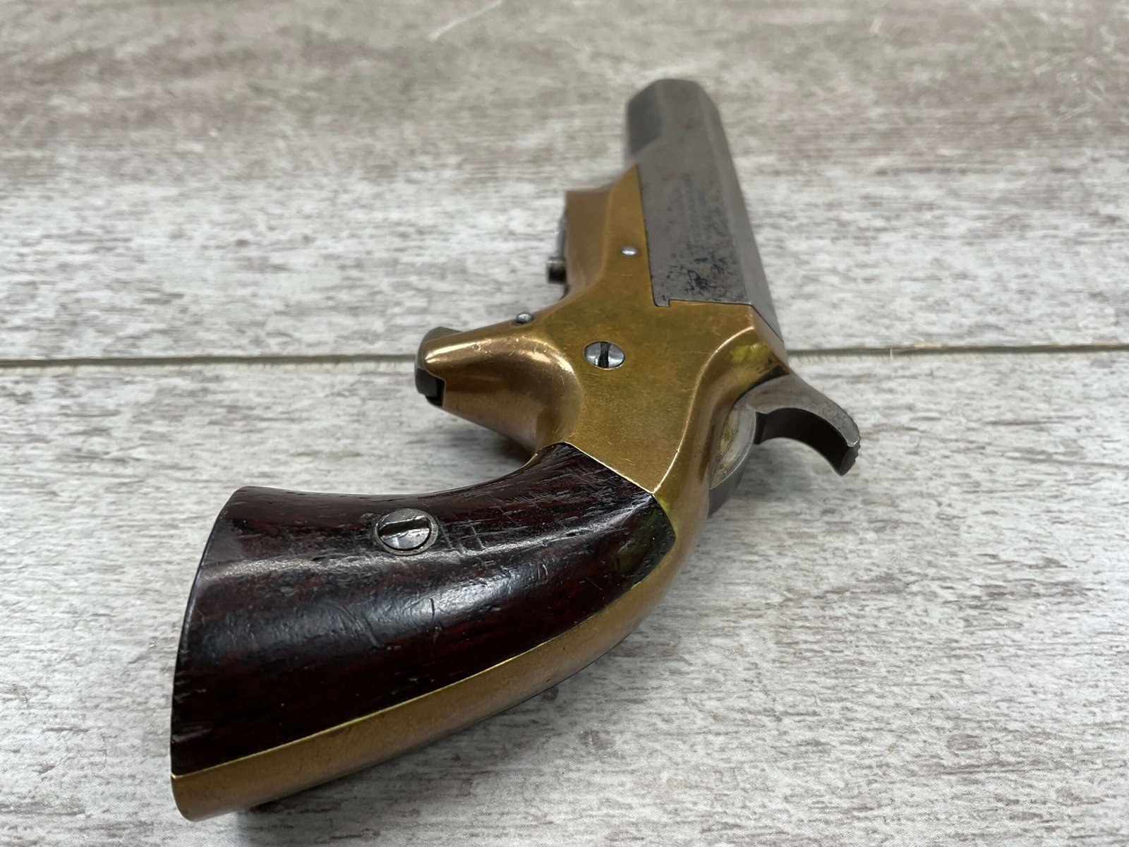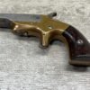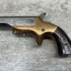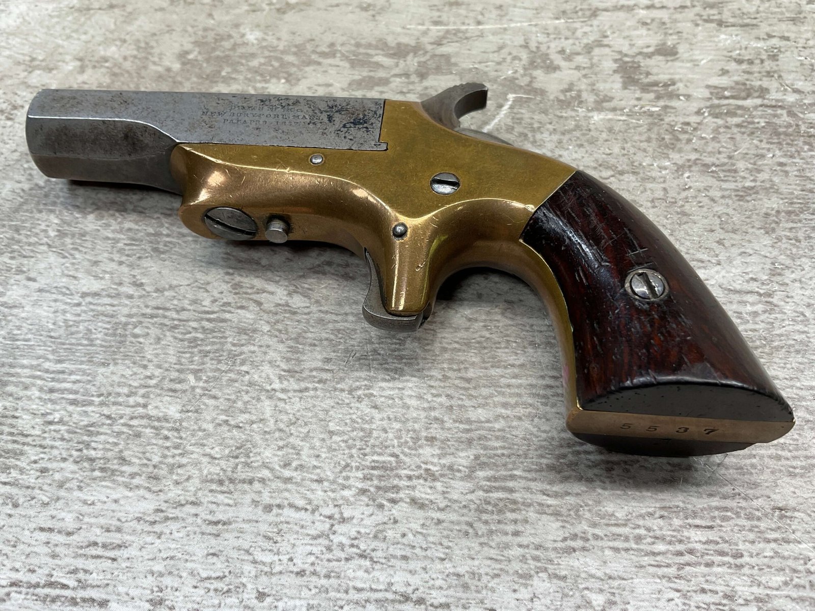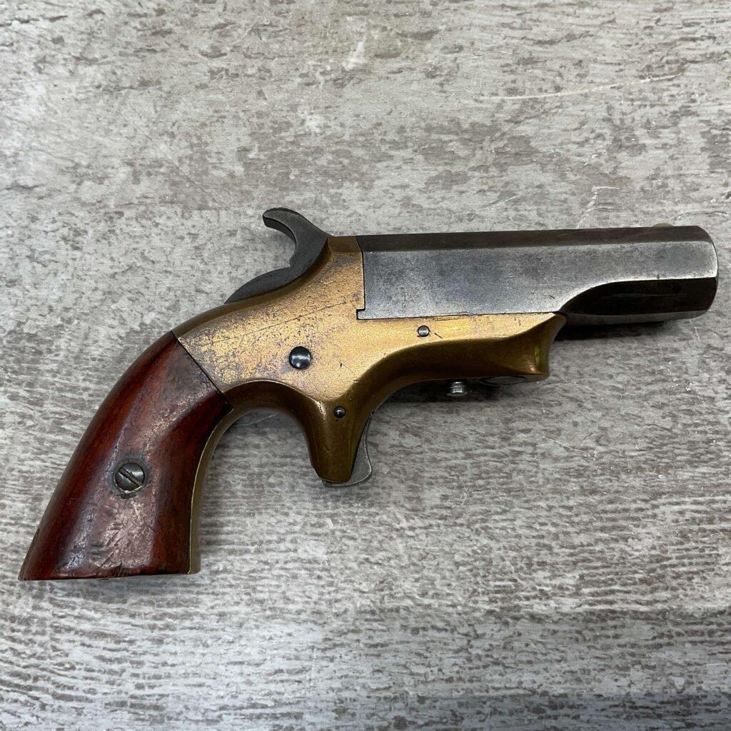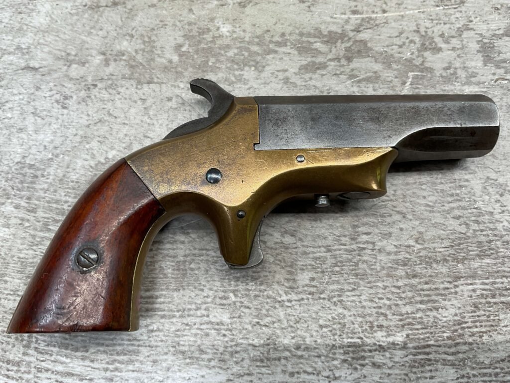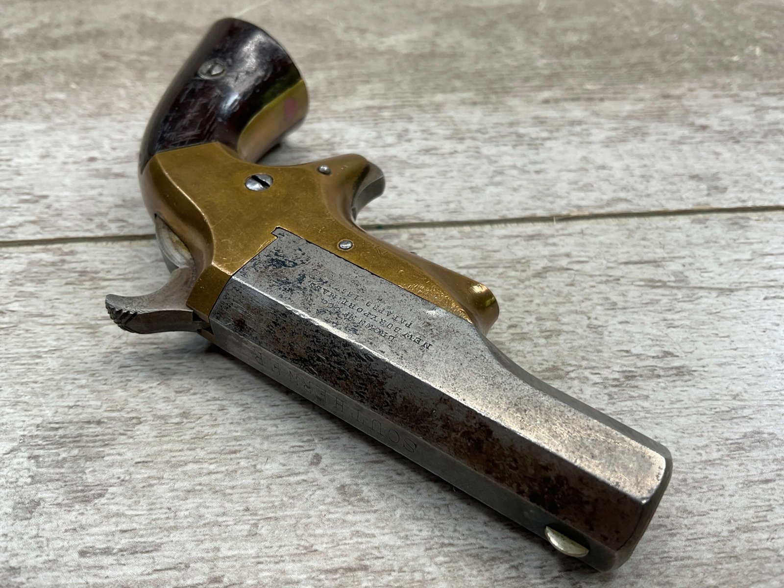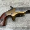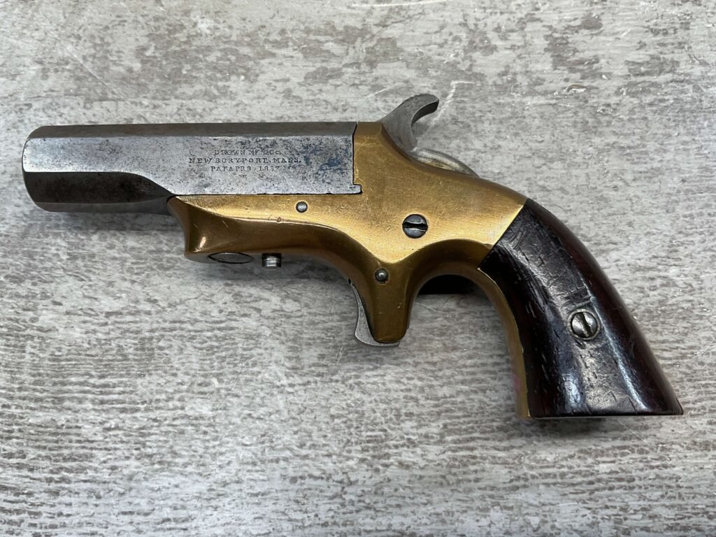 BROWN MF’G. CO. “SOUTHERNER” .41RF DERRINGER SINGLE SHOT PISTOL W/ BRASS FRAME, ANTIQUE #5537, ALL MATCHING, 2 3/8″ SIDE PIVOTING BARREL, BRASS FRAME, MAKER MARKED “BROWN MF’G. CO. / NEWBURYPORT. MASS. / PAT. APR. 9. 1867”, MOSTLY FADED BLUE HAS TURNED GREY PATINA, BRIGHT BORE W/ FROSTING IN AREAS & FAIR RIFLING, EJECTOR WORKS, EXC SMOOTH ROSEWOOD GRIPS (MATCHING), NOT A REPRODUCTION, OVERALL CONDITION AS SEEN IN PHOTOS