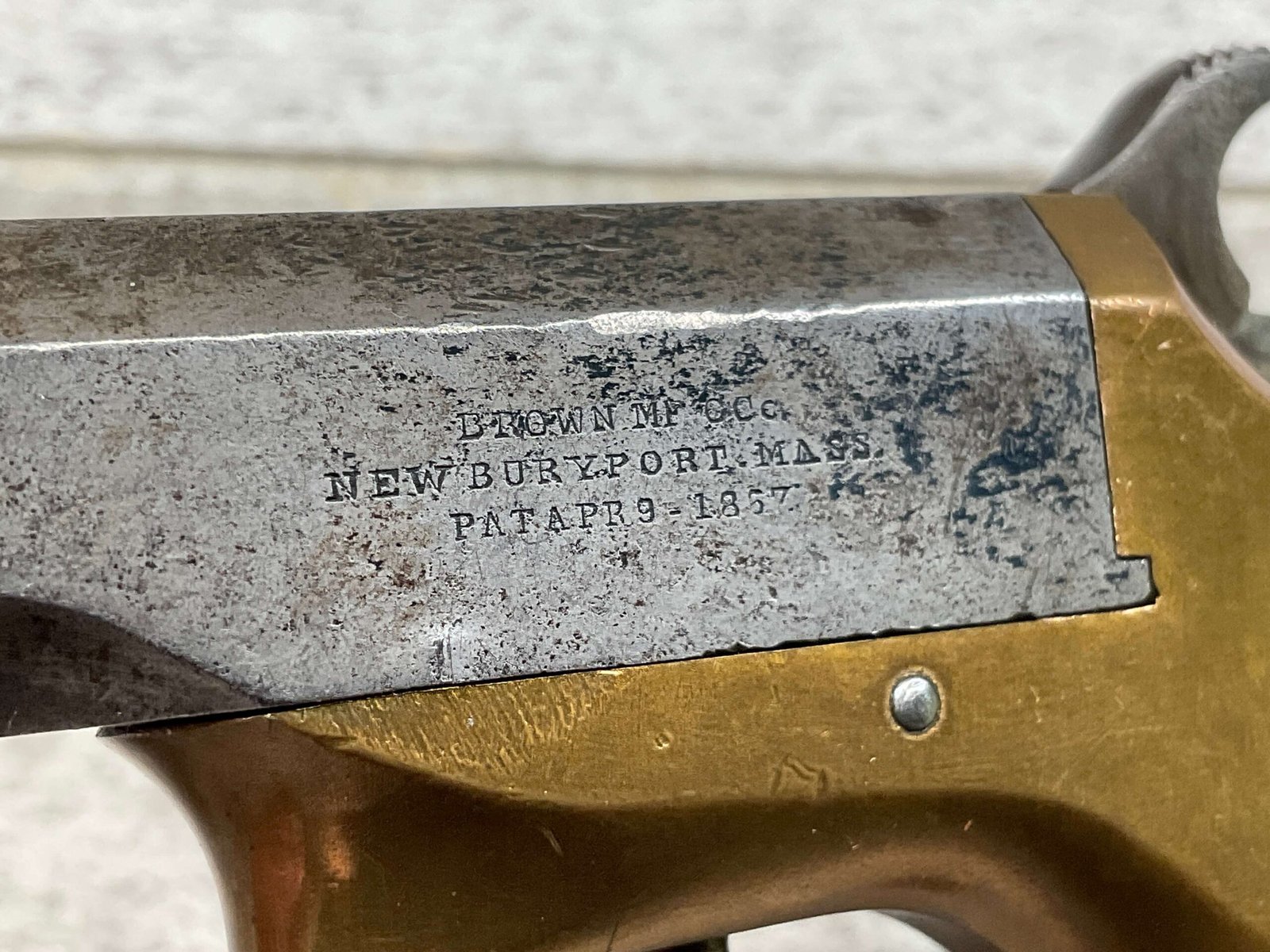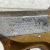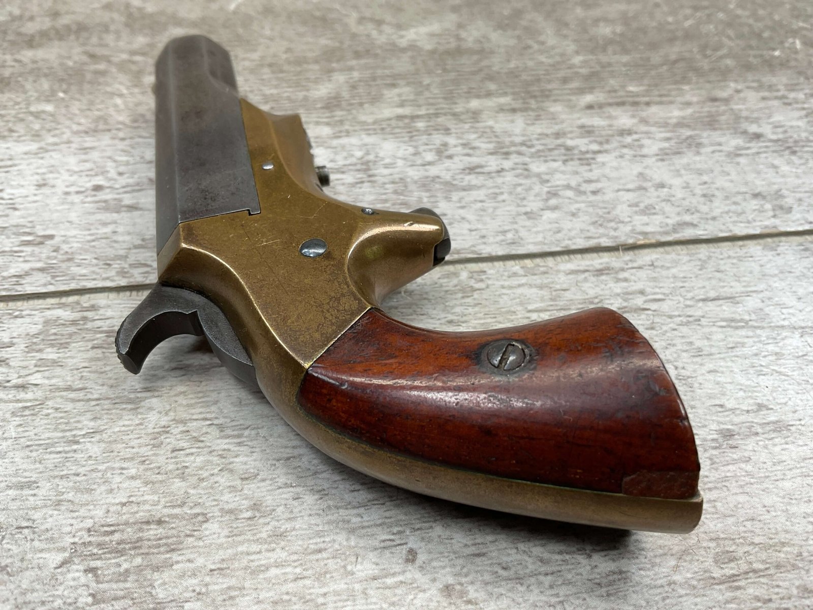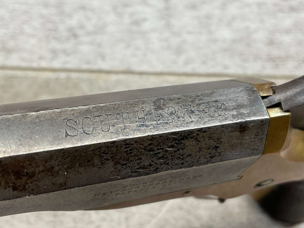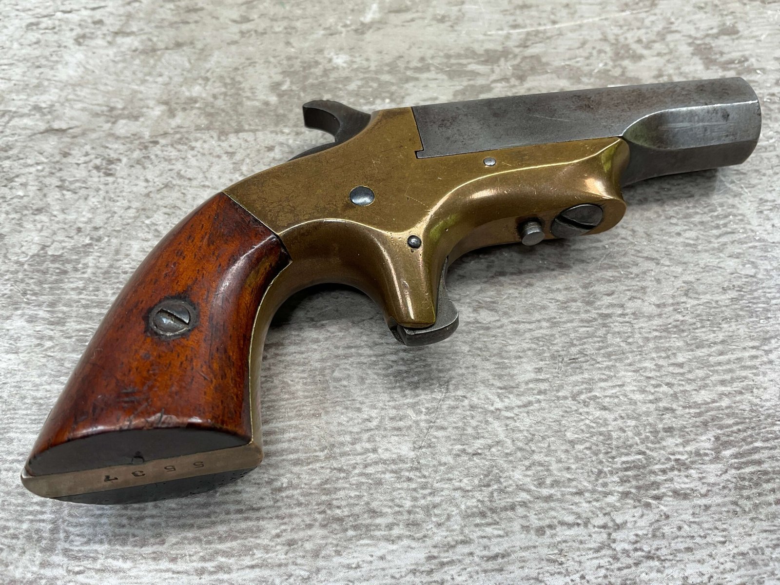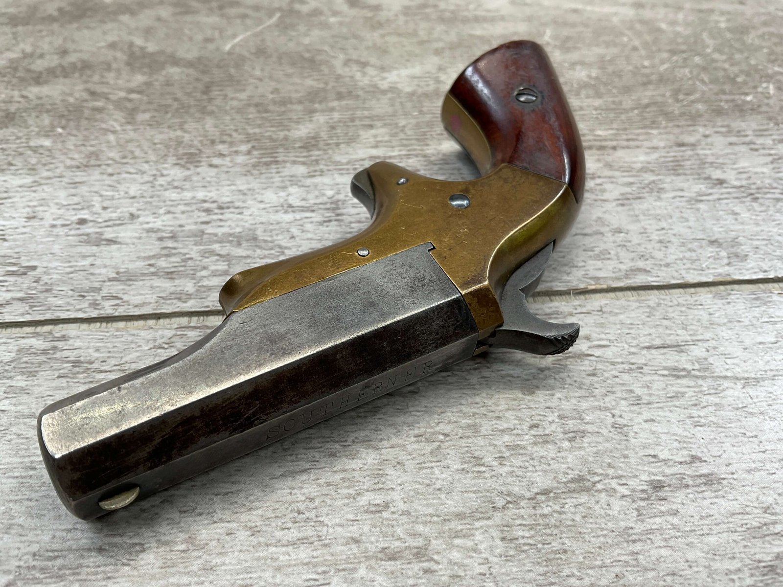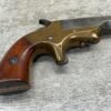 BROWN MF’G. CO. “SOUTHERNER” .41RF DERRINGER SINGLE SHOT PISTOL W/ BRASS FRAME, ANTIQUE #5537, ALL MATCHING, 2 3/8″ SIDE PIVOTING BARREL, BRASS FRAME, MAKER MARKED “BROWN MF’G. CO. / NEWBURYPORT. MASS. / PAT. APR. 9. 1867”, MOSTLY FADED BLUE HAS TURNED GREY PATINA, BRIGHT BORE W/ FROSTING IN AREAS & FAIR RIFLING, EJECTOR WORKS, EXC SMOOTH ROSEWOOD GRIPS (MATCHING), NOT A REPRODUCTION, OVERALL CONDITION AS SEEN IN PHOTOS