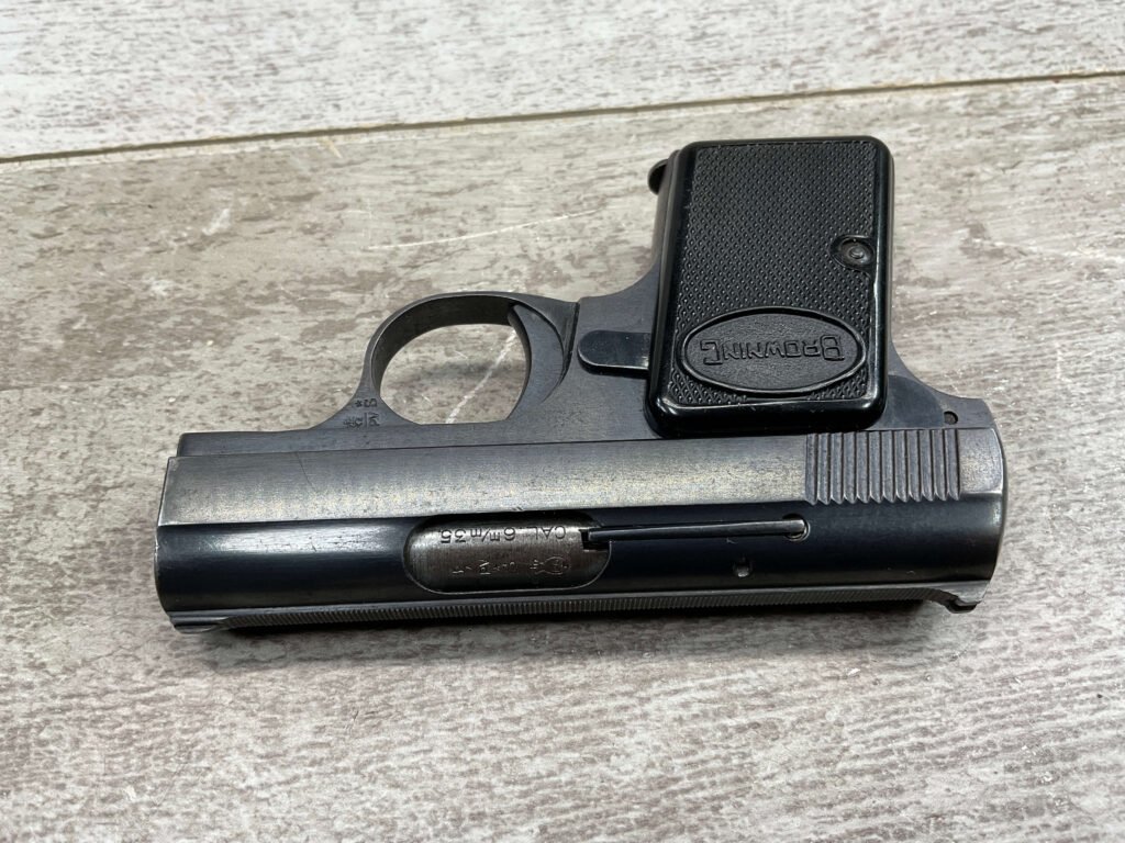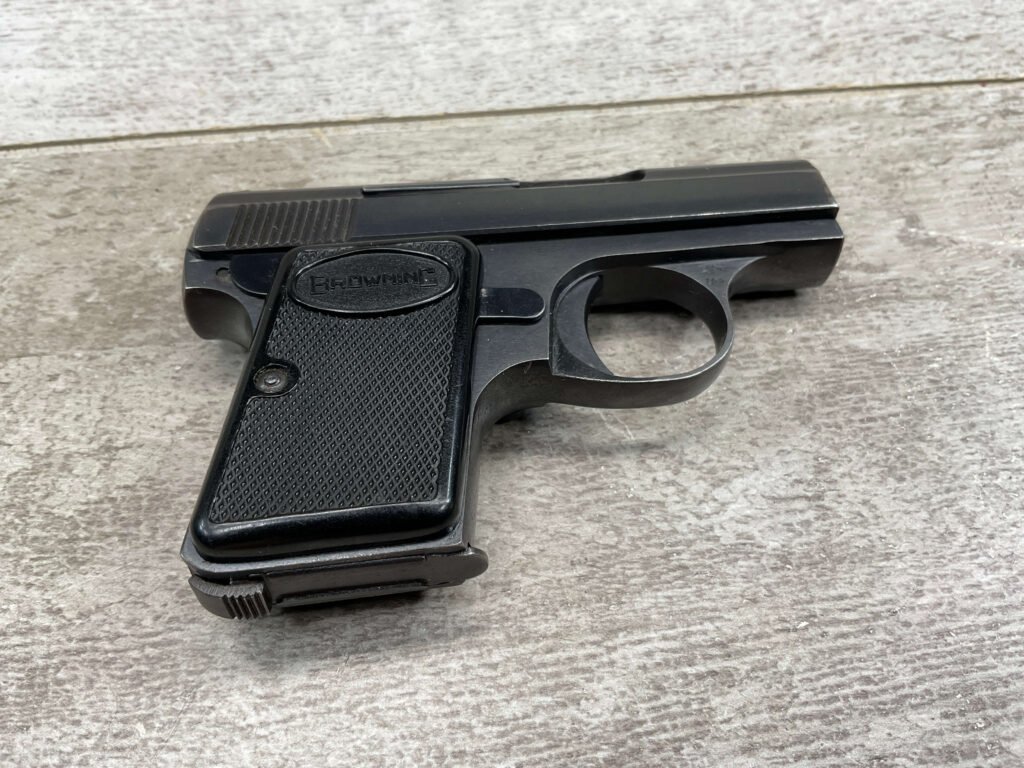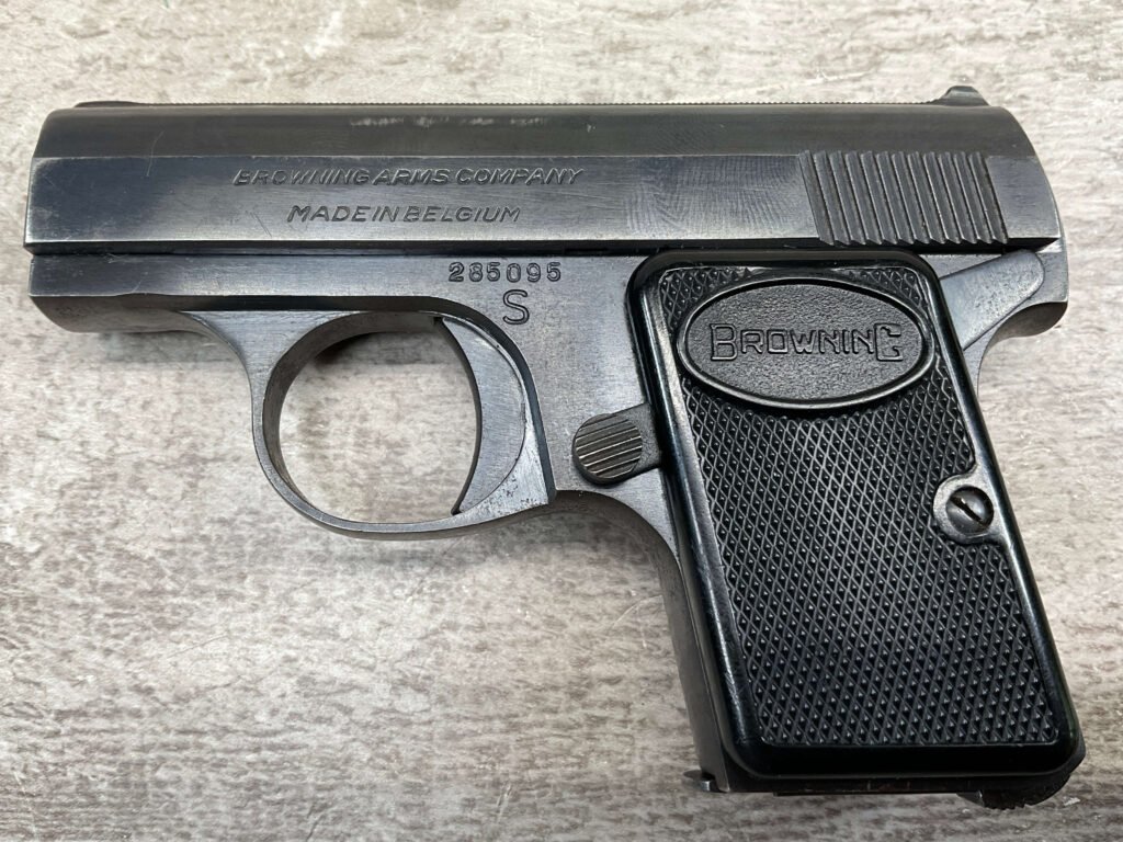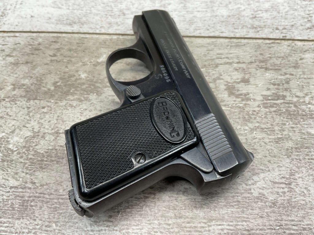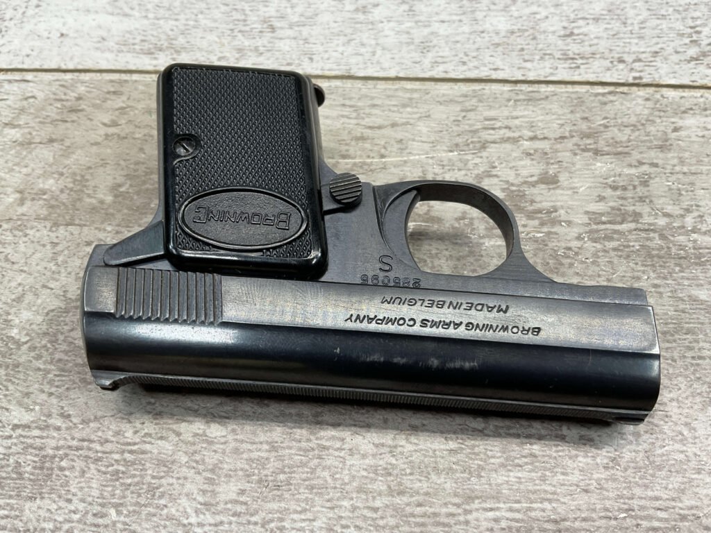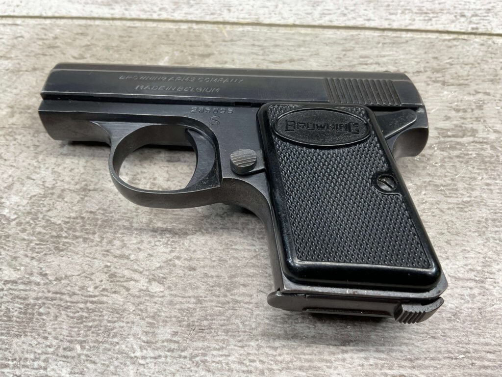 BROWNING “BABY” .25 ACP POCKET PISTOL, #285095, 90% EXC BLUE FINISH W/ LIGHT HIGH EDGE WEAR & SIGNS OF USE, EXC ORIGINAL BROWNING PLASTIC GRIPS, MARKED “S” NEAR LEFT SIDE OF TRIGGER GUARD UNDER SERIAL, MARKED “BROWNING ARMS COMPANY / MADE IN BELGIUM” ON LEFT SLIDE, MARKED ON RIGHT SIDE ON SLIDE WITH PROOFS, MARKED ON RIGHT SIDE NEAR TRIGGER GUARD WITH PROOFS, 1-“FN” MARKED MAGAZINE, 1963 MFR, GREAT LITTLE SHOOTER .25 ACP VEST/POCKET PISTOL.