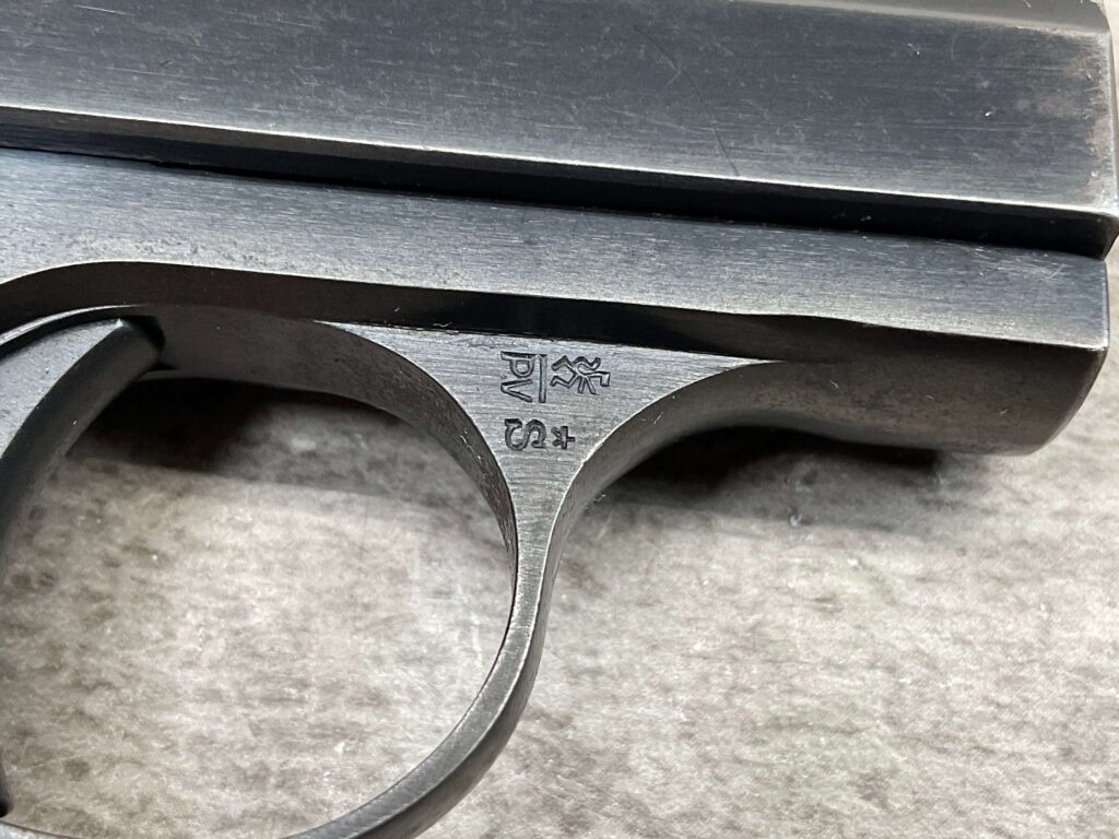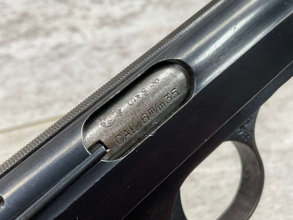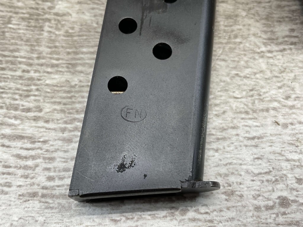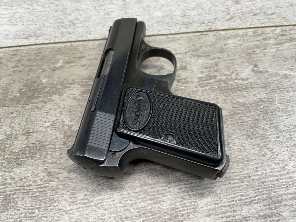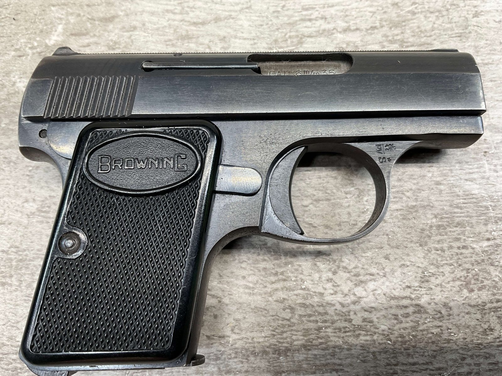 BROWNING “BABY” .25 ACP POCKET PISTOL, #285095, 90% EXC BLUE FINISH W/ LIGHT HIGH EDGE WEAR & SIGNS OF USE, EXC ORIGINAL BROWNING PLASTIC GRIPS, MARKED “S” NEAR LEFT SIDE OF TRIGGER GUARD UNDER SERIAL, MARKED “BROWNING ARMS COMPANY / MADE IN BELGIUM” ON LEFT SLIDE, MARKED ON RIGHT SIDE ON SLIDE WITH PROOFS, MARKED ON RIGHT SIDE NEAR TRIGGER GUARD WITH PROOFS, 1-“FN” MARKED MAGAZINE, 1963 MFR, GREAT LITTLE SHOOTER .25 ACP VEST/POCKET PISTOL.