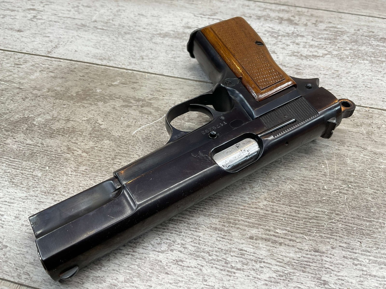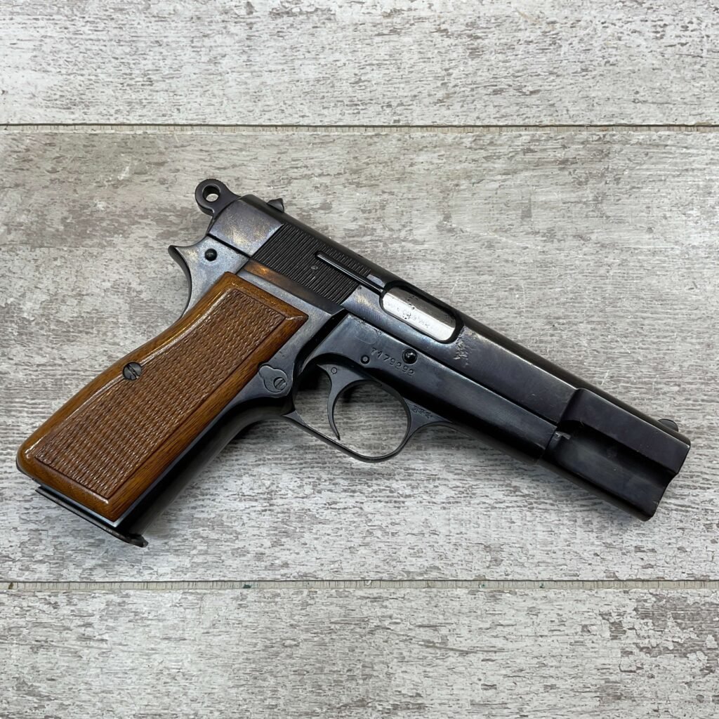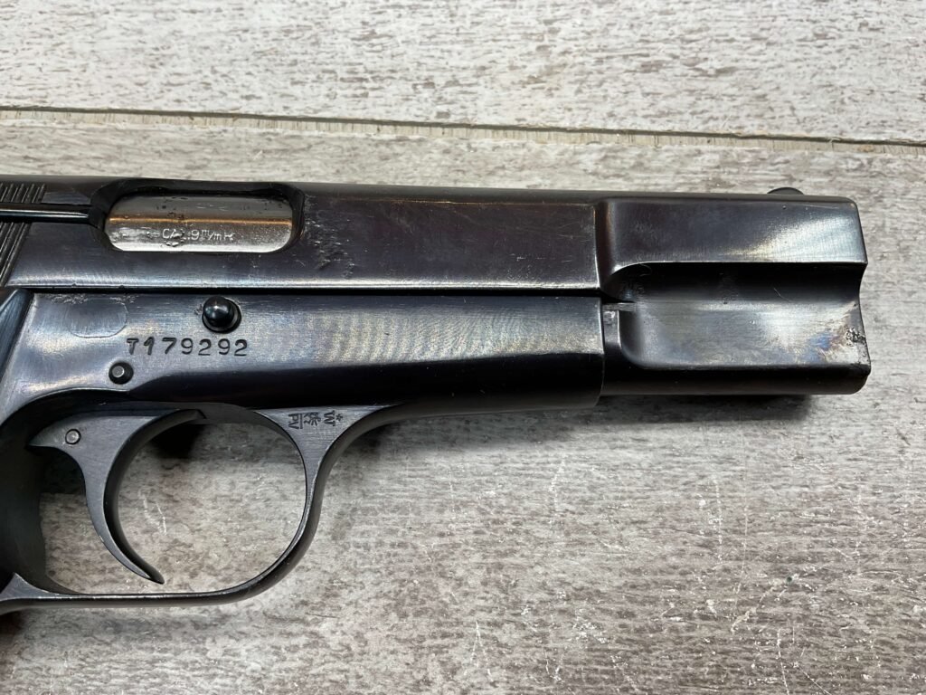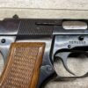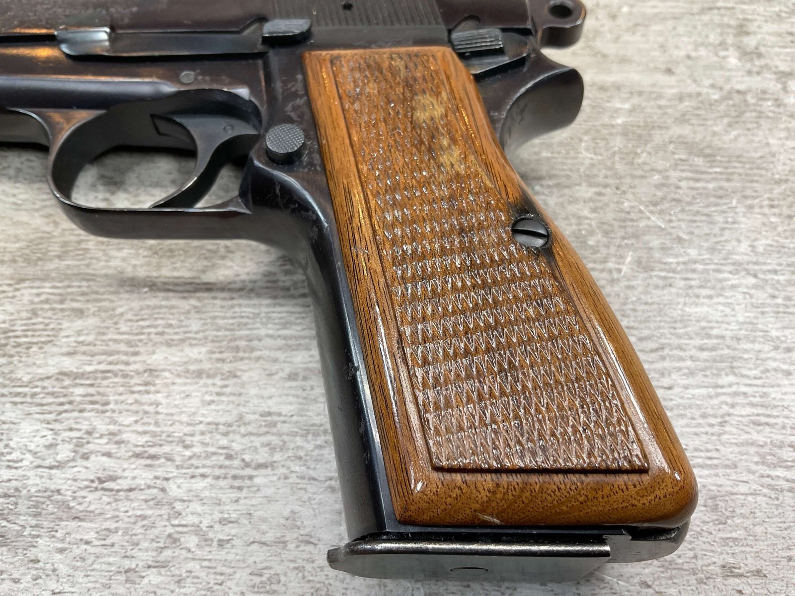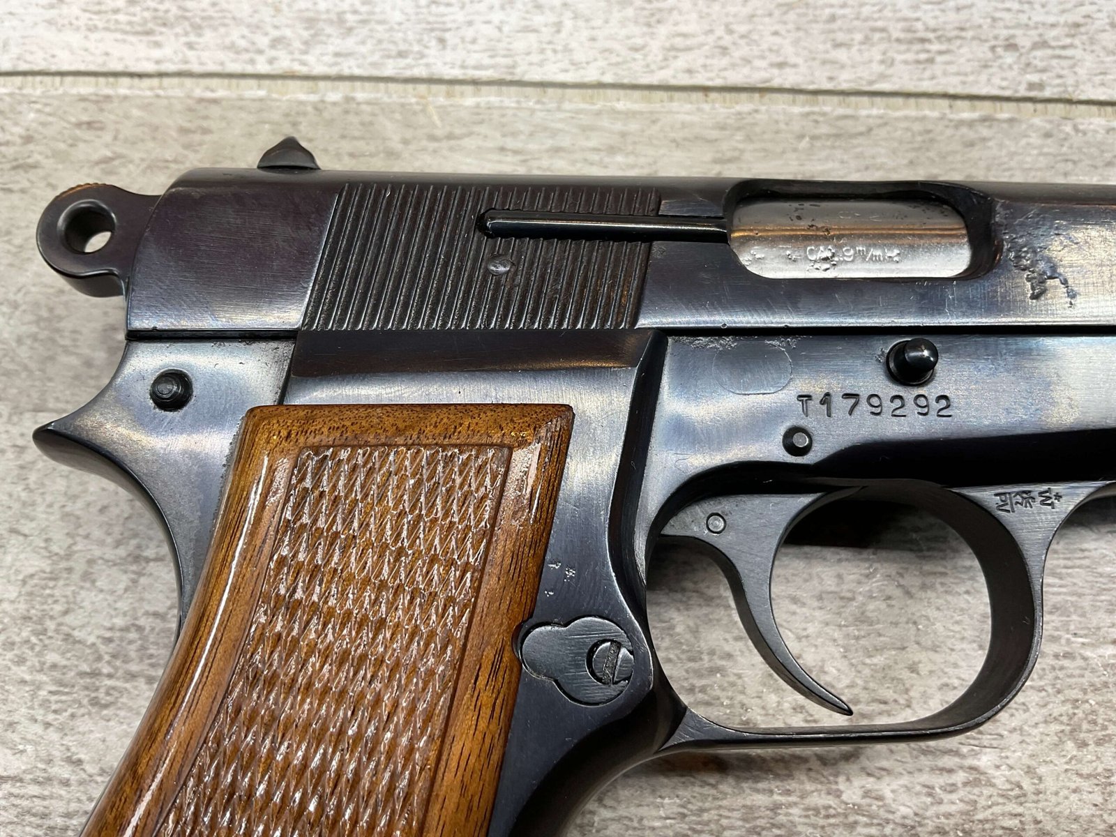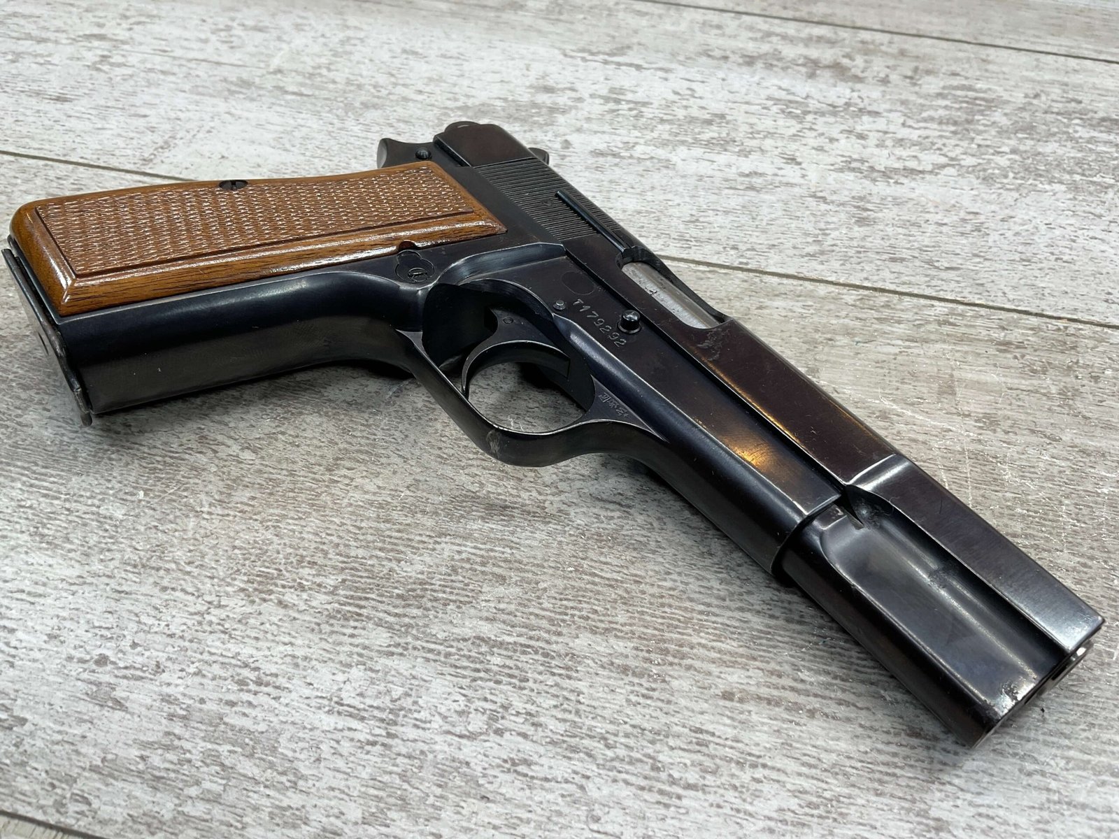 BROWNING HI POWER 9MM SEMI AUTO PISTOL, 1967 MFR, REFINISHED #T179292, GOOD REFINISHED HI GLOSS BLUE W/AREA OF DEEP PITTING, VG CHECKERED WALNUT GRIPS, NICE OVERALL, GREAT SHOOTER!!