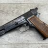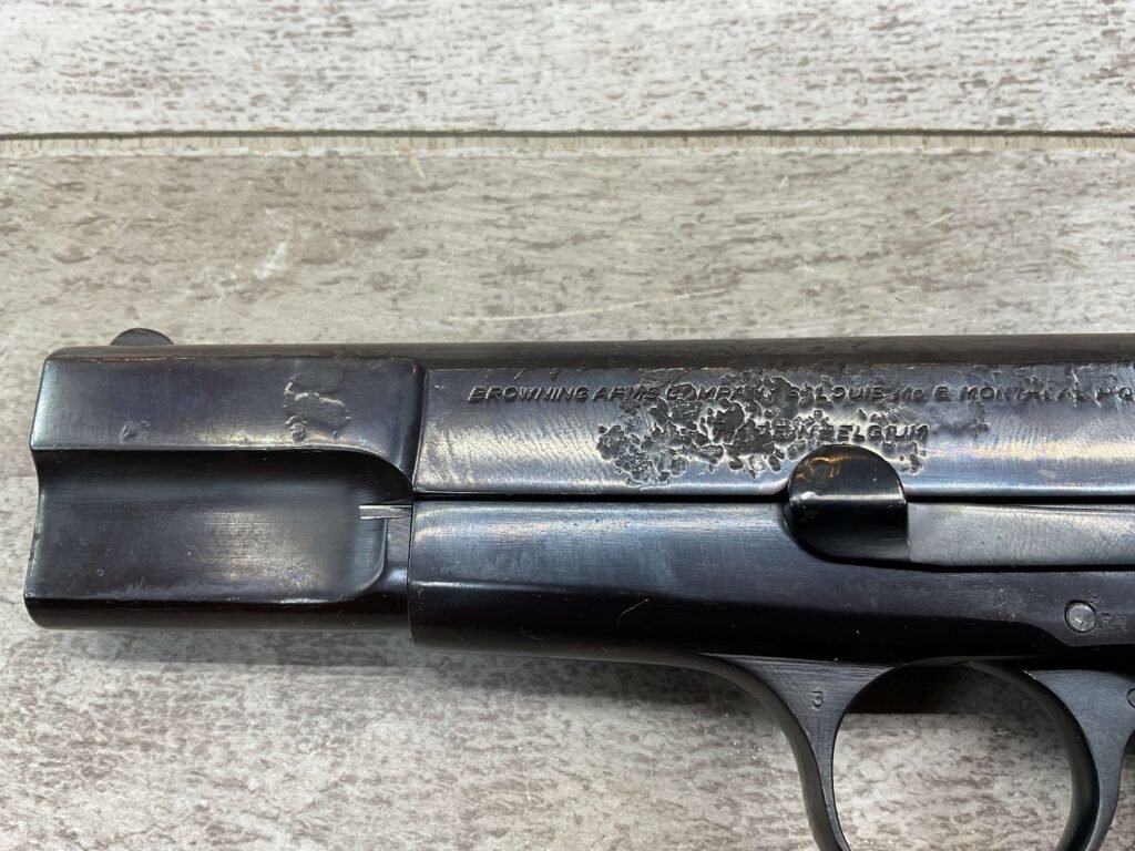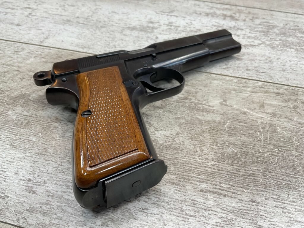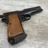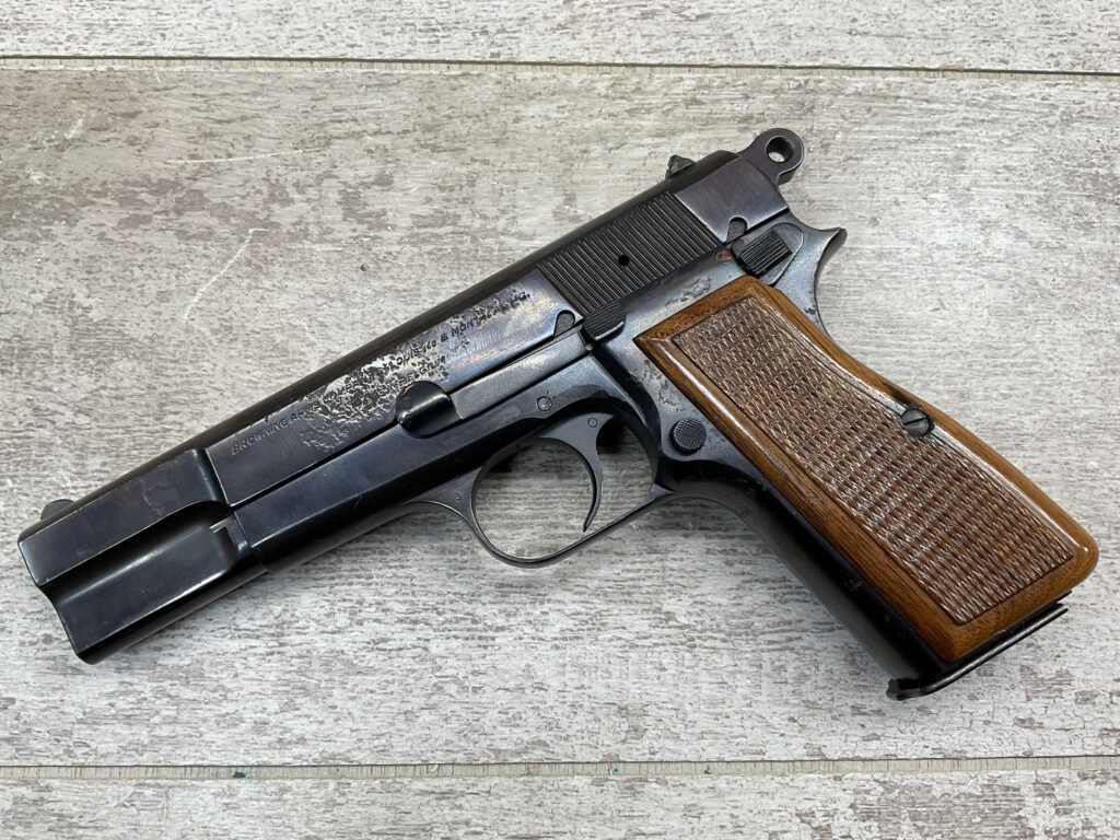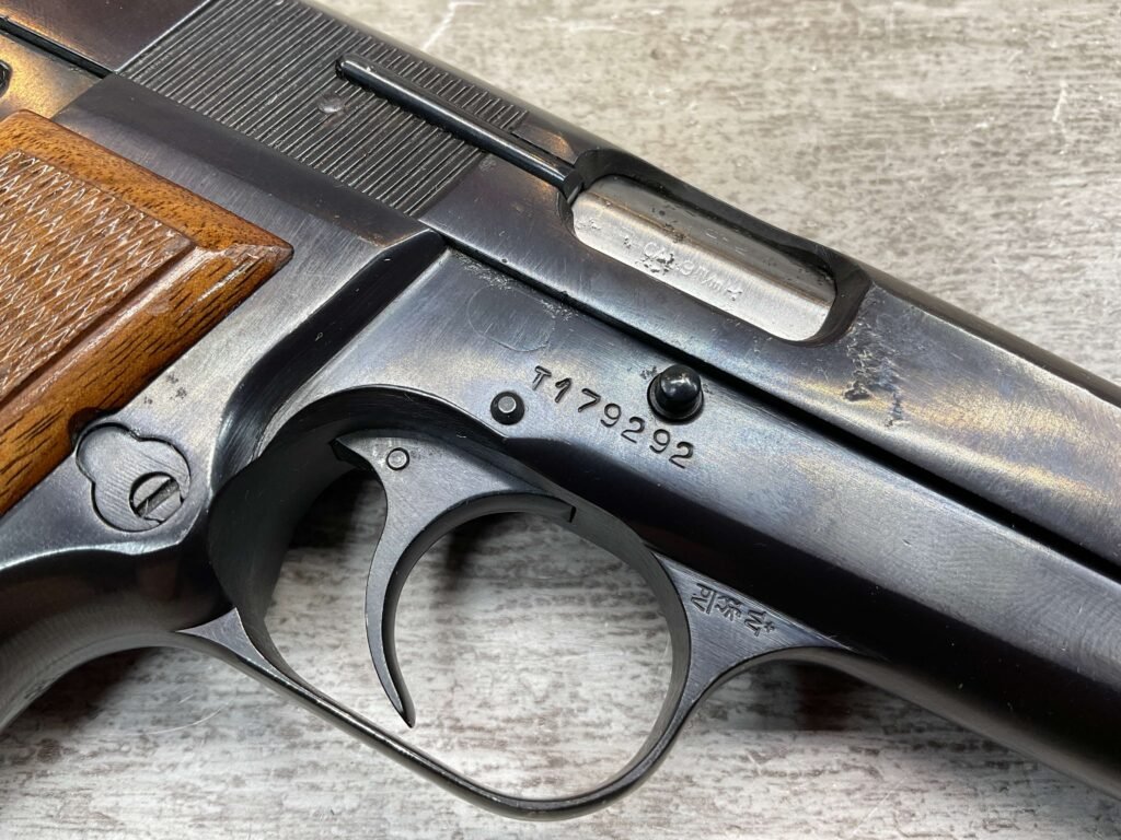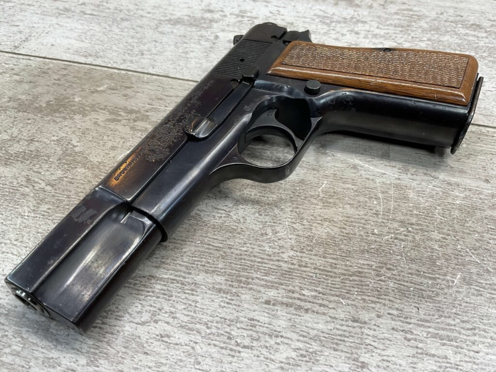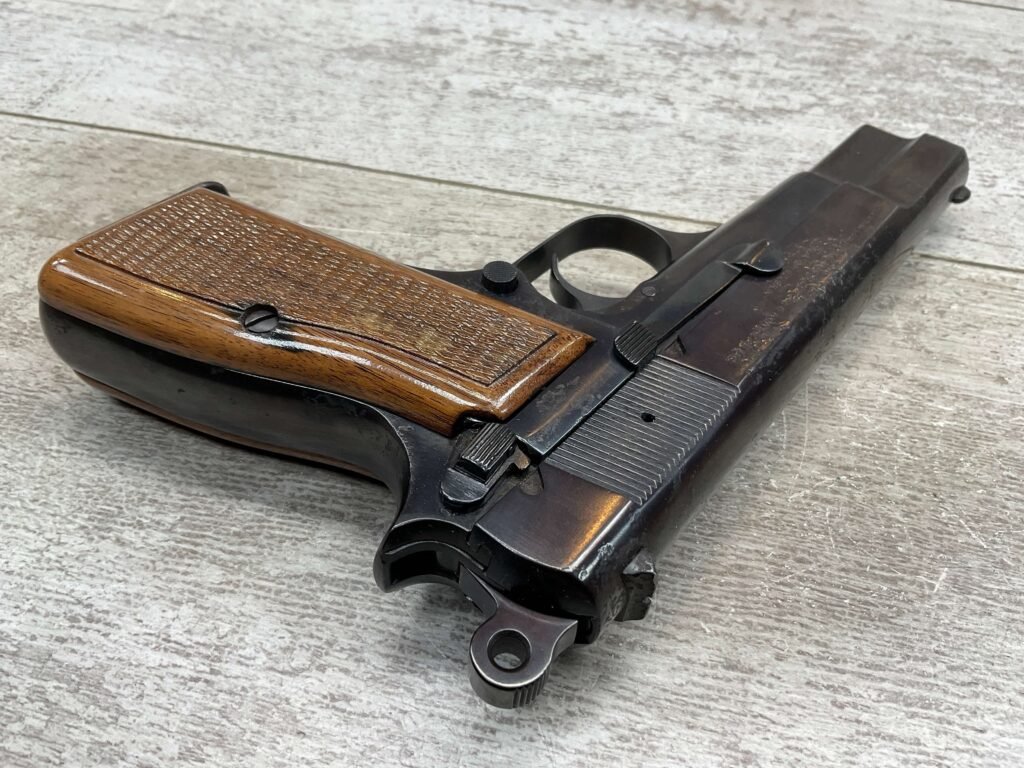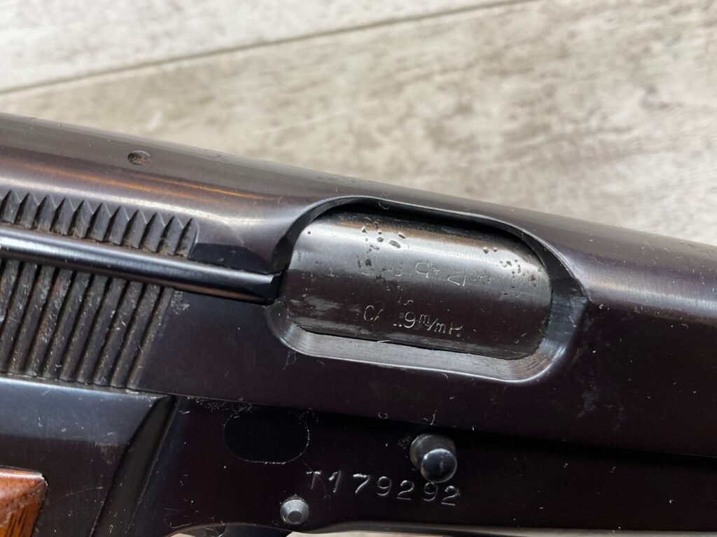 BROWNING HI POWER 9MM SEMI AUTO PISTOL, 1967 MFR, REFINISHED #T179292, GOOD REFINISHED HI GLOSS BLUE W/AREA OF DEEP PITTING, VG CHECKERED WALNUT GRIPS, NICE OVERALL, GREAT SHOOTER!!