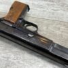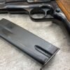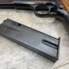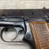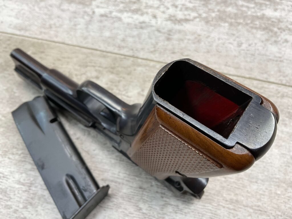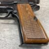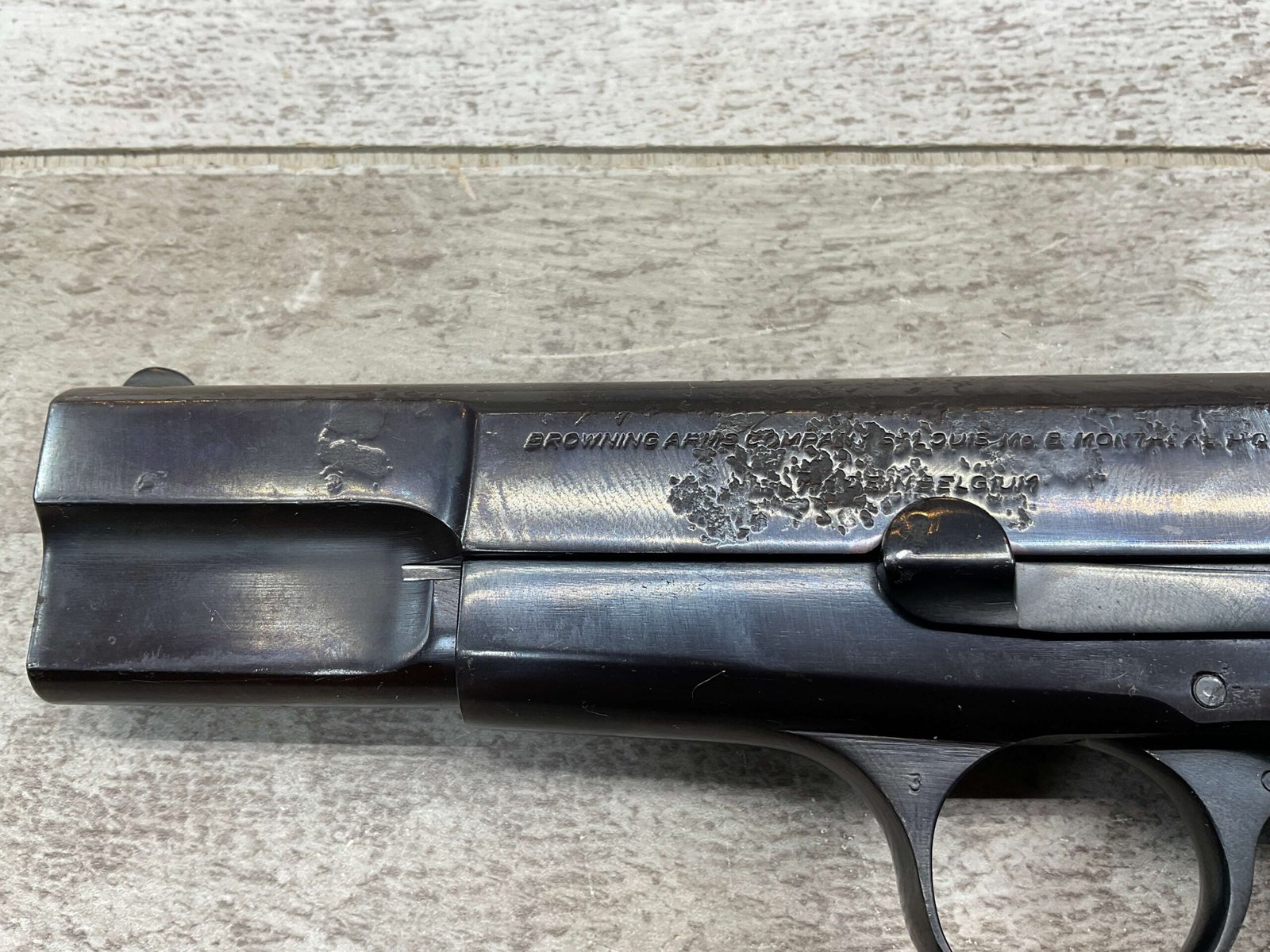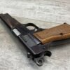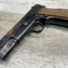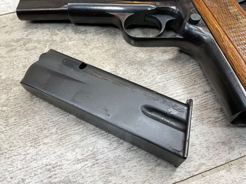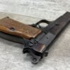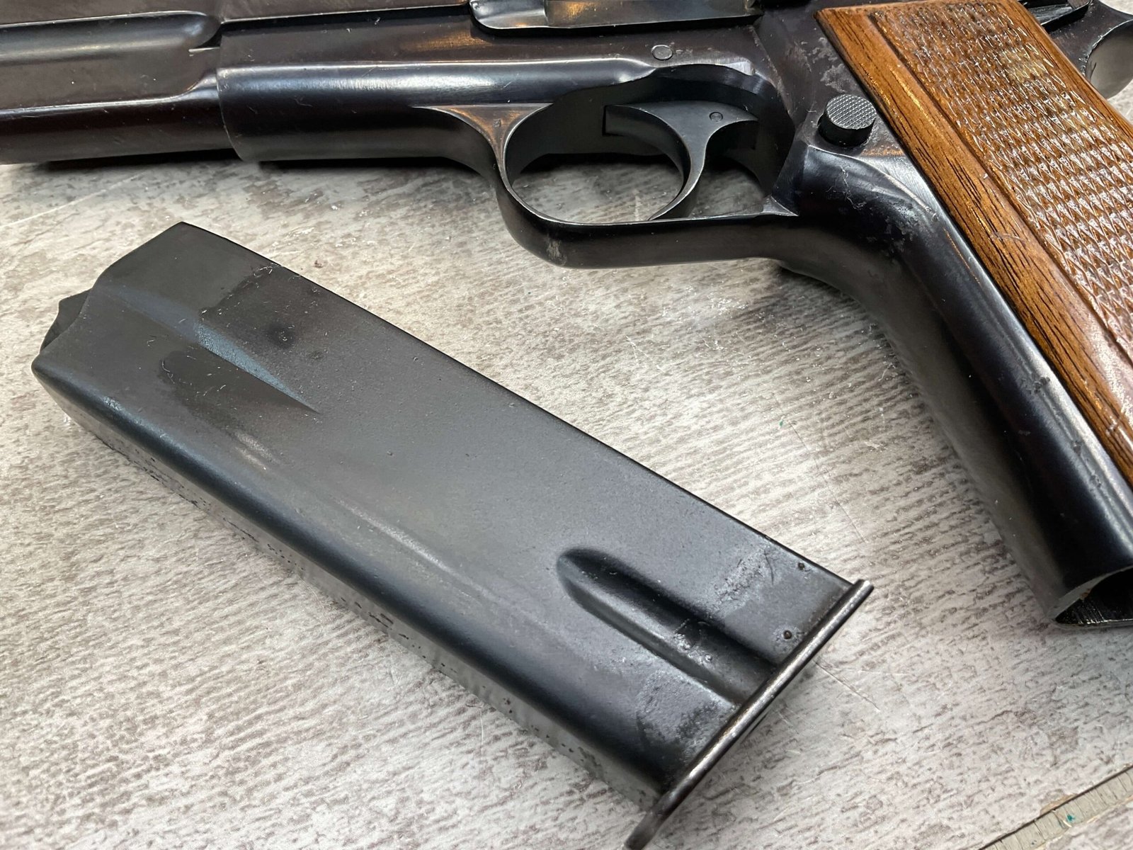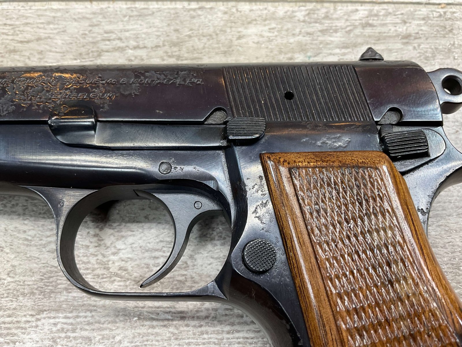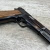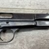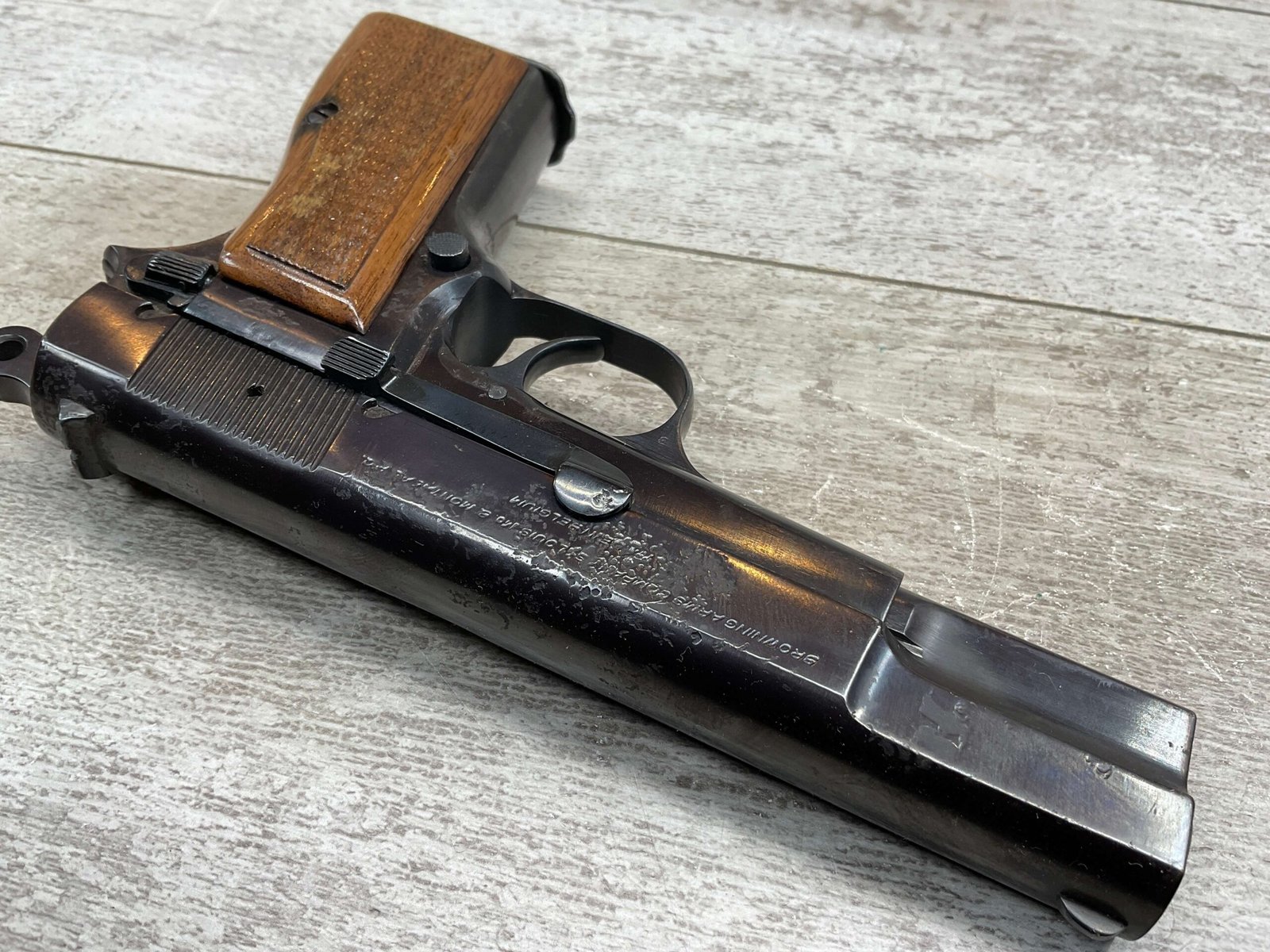 BROWNING HI POWER 9MM SEMI AUTO PISTOL, 1967 MFR, REFINISHED #T179292, GOOD REFINISHED HI GLOSS BLUE W/AREA OF DEEP PITTING, VG CHECKERED WALNUT GRIPS, NICE OVERALL, GREAT SHOOTER!!