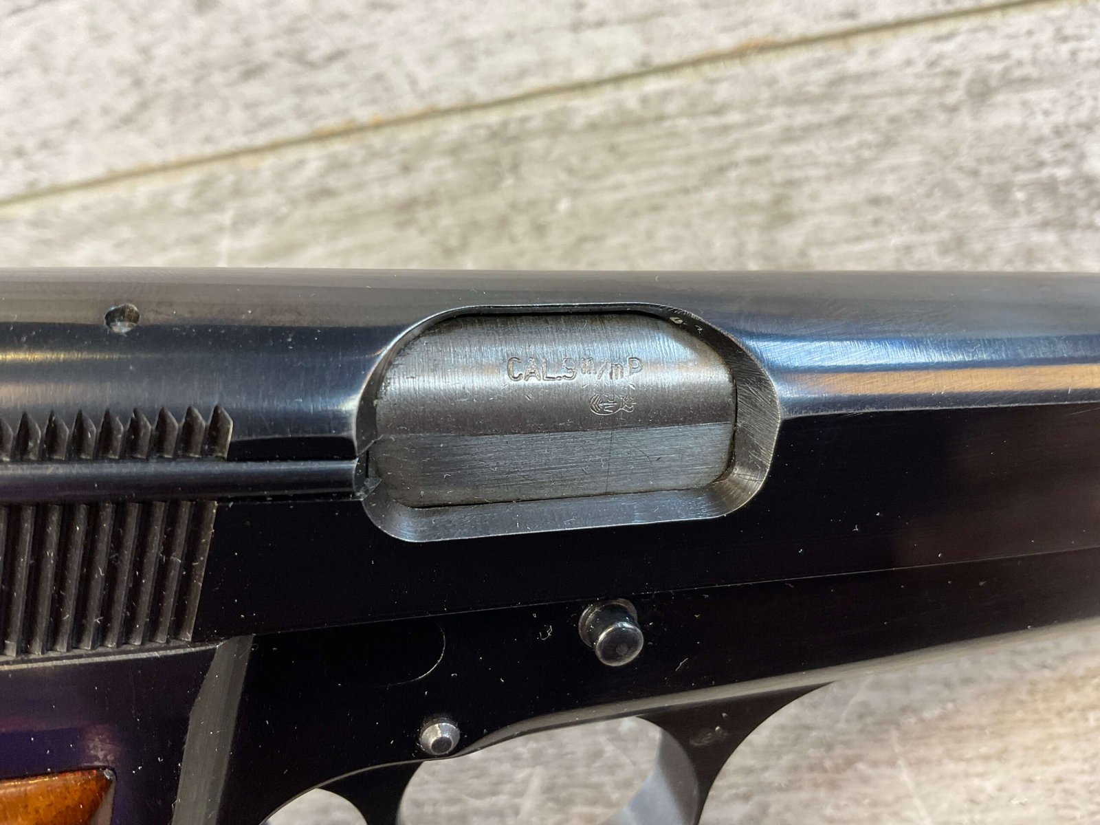 BROWNING HI POWER MADE IN BELGIUM .9MM SEMI AUTO PISTOL #71C33897, 4 5/8″ BBL, EXC CHECKERED SELECT WALNUT GRIPS, EXC BLUE FINISH W/HIGH EDGE WEAR & LIGHT WEAR ON FRONT & REAR GRIPS STRAP, EXC BRIGHT BORE & RIFLING, CONDITION AS SHOWN IN PICTURES