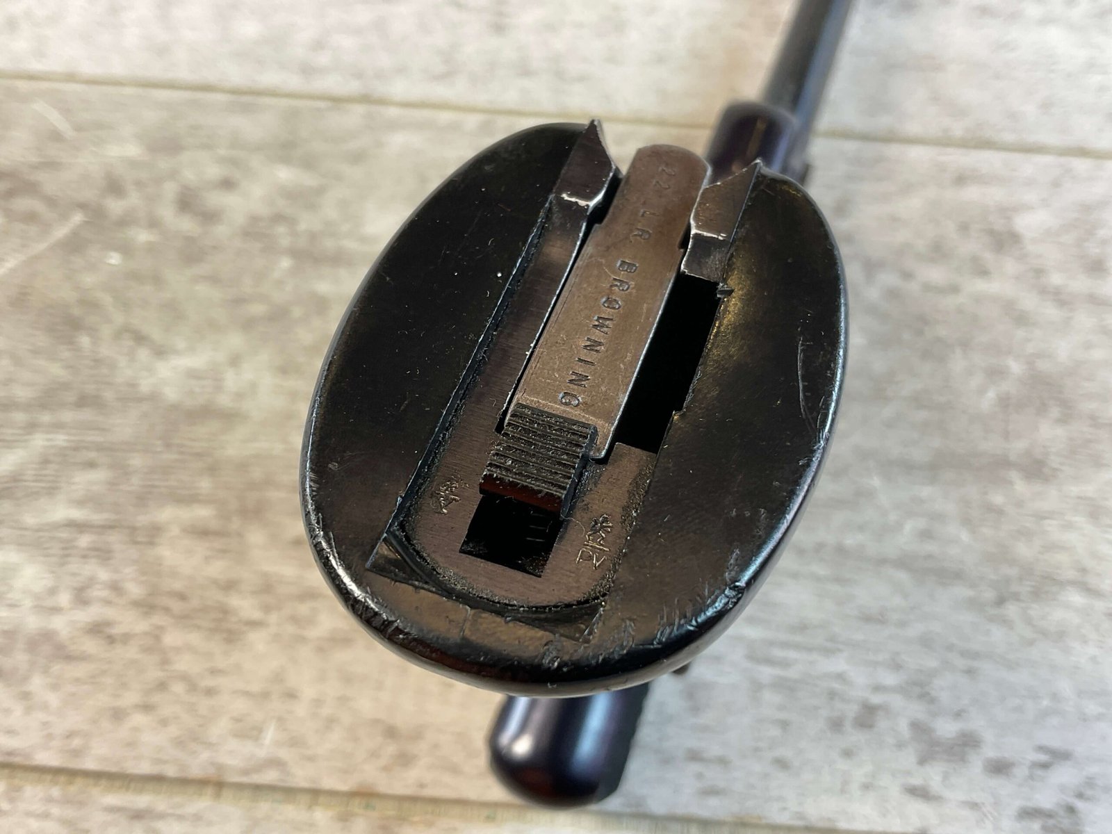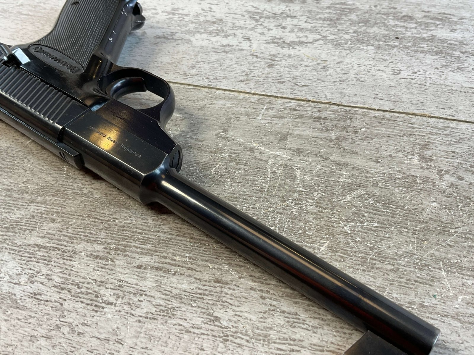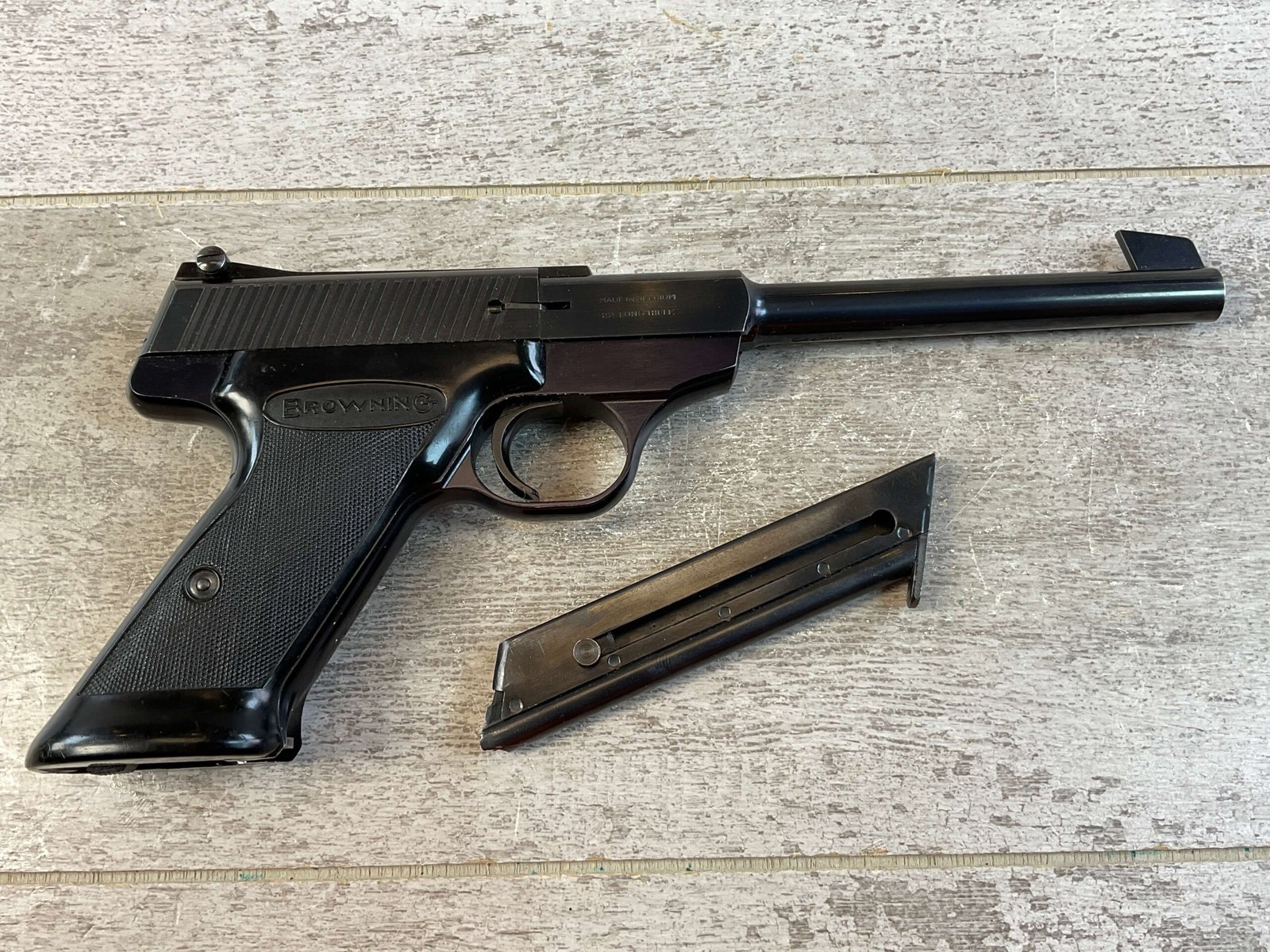 BROWNING NOMAD .22LR SEMI AUTO PISTOL #62902P6, 6 3/4″ BARREL, EXC BORE & RIFLING, EXC BLUE, EXC BLACK CHECKERED PLASTIC GRIPS, 2 MAGAZINES, MADE IN BELGIUM, 95%+ OVERALL, CONDITION AS SHOWN IN PICTURES.
