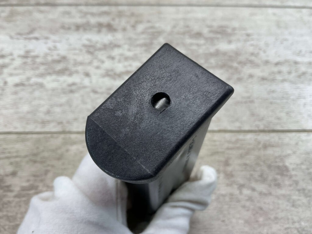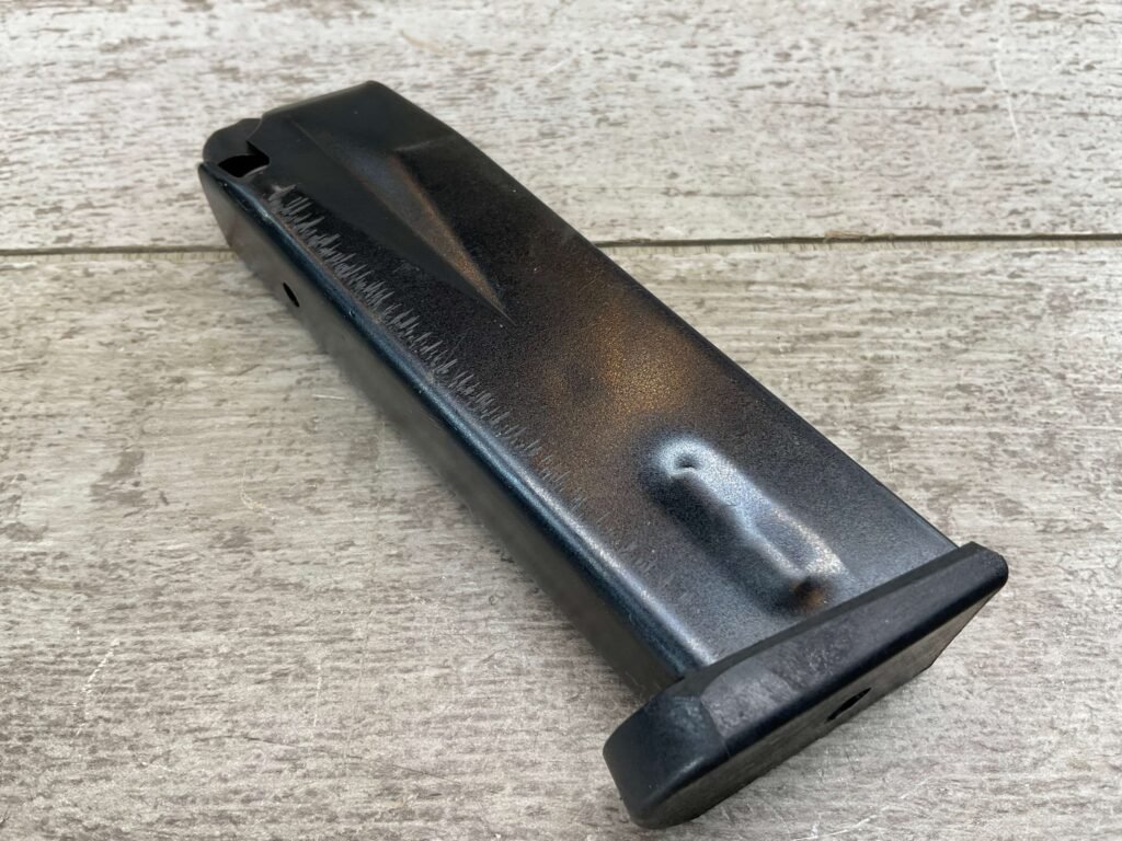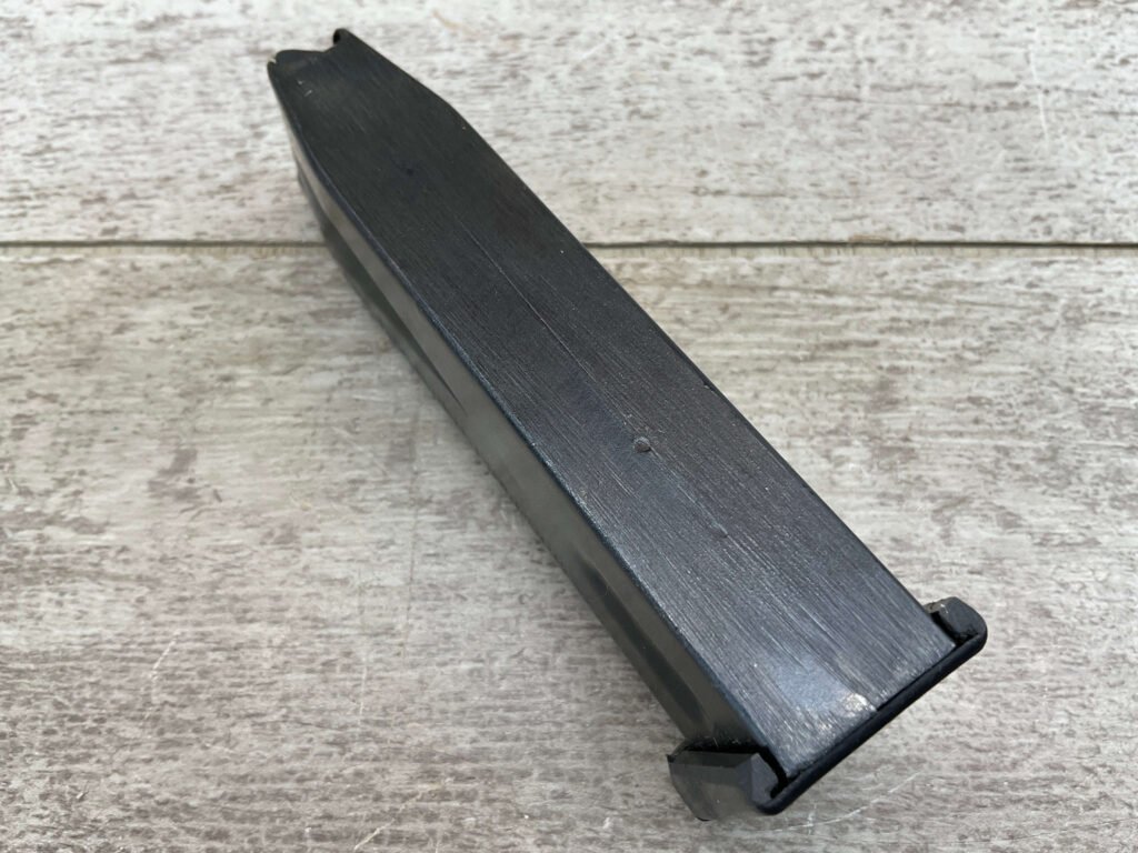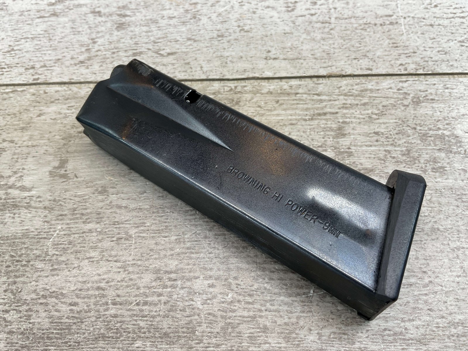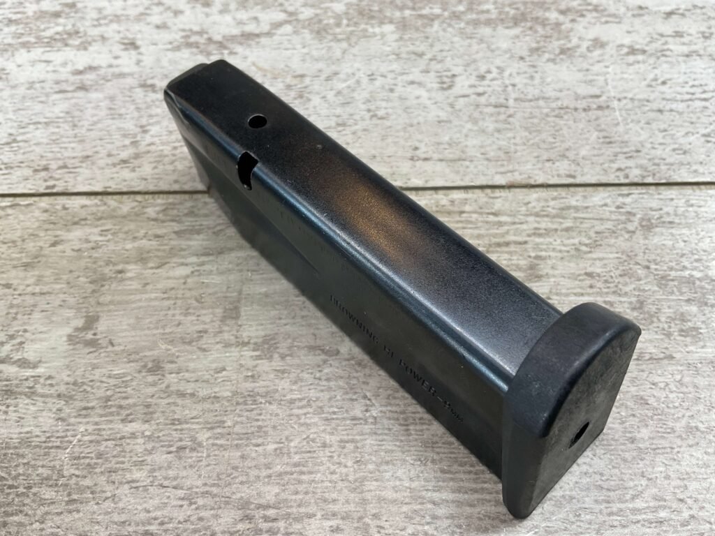 BROWNING OEM HI-POWER 9MM 10-ROUND MAGAZINE, BLUED FINISH, LITE WEAR MARKINGS, EXC. CONDITION.