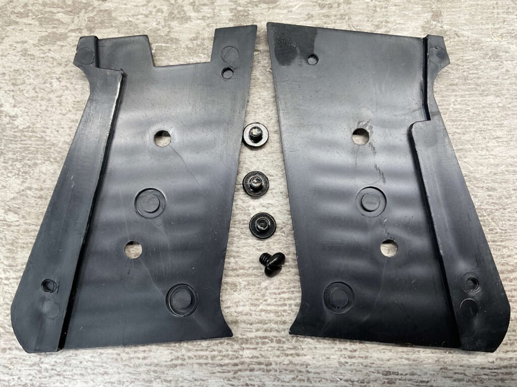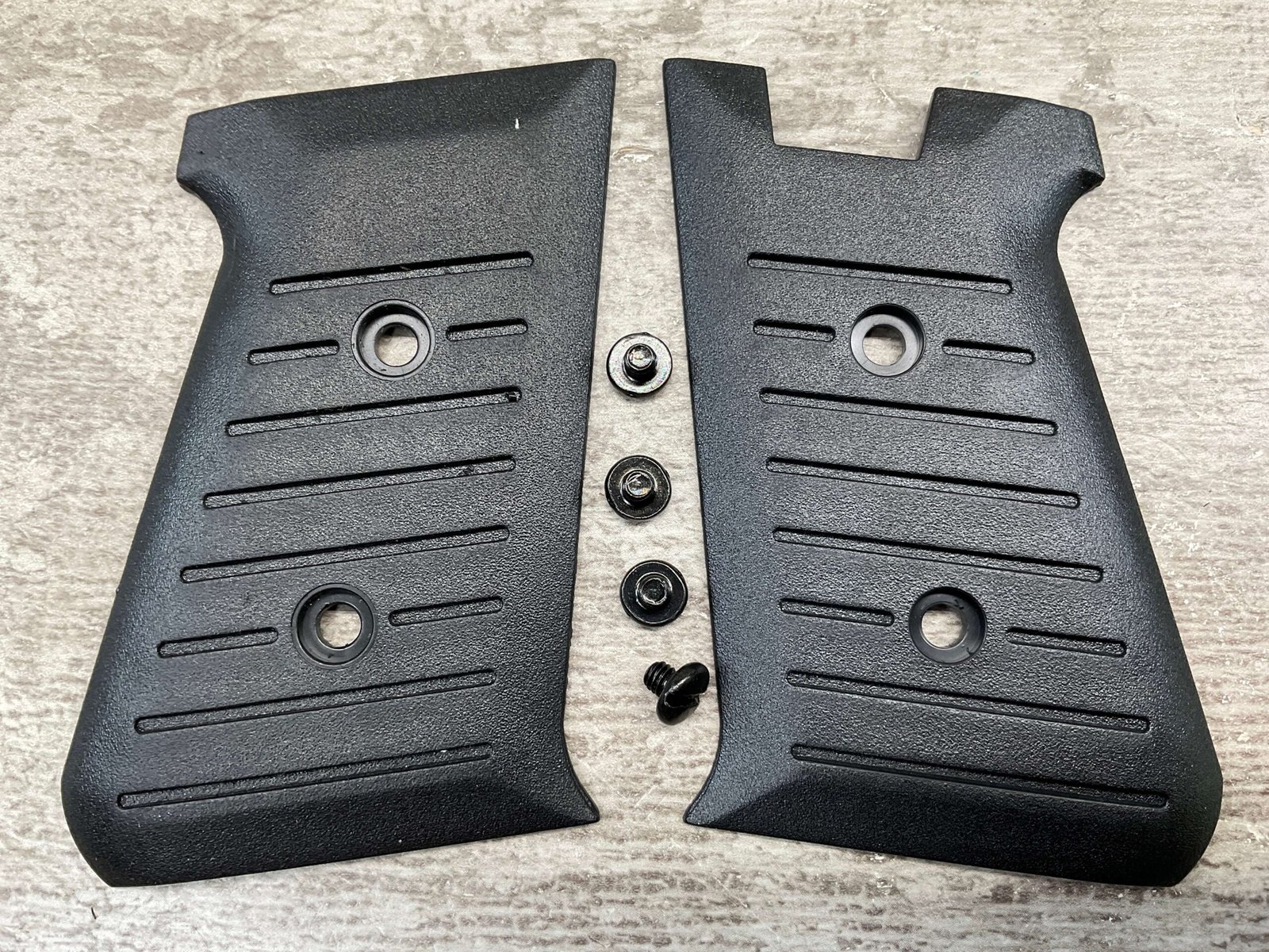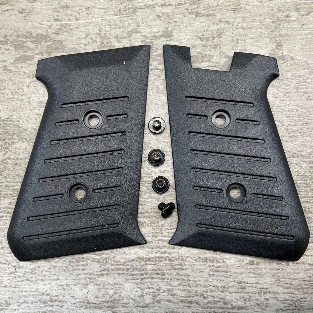 BRYCO ARMS BLACK GRIPS WITH SCREWS, PLASTIC, IN EXCELLENT/NEW CONDITION.