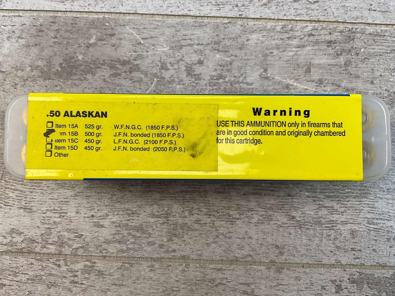 BUFFALO BORE .50 ALASKAN, 500 GR. RIFLE AMMO, UNOPENED BOX, 1850 FPS JFN BONDED, FULL & UNOPENED BOX (QUANTITY OF 20 ROUNDS), ITEM #15B5, IN EXCELLENT CONDITION!