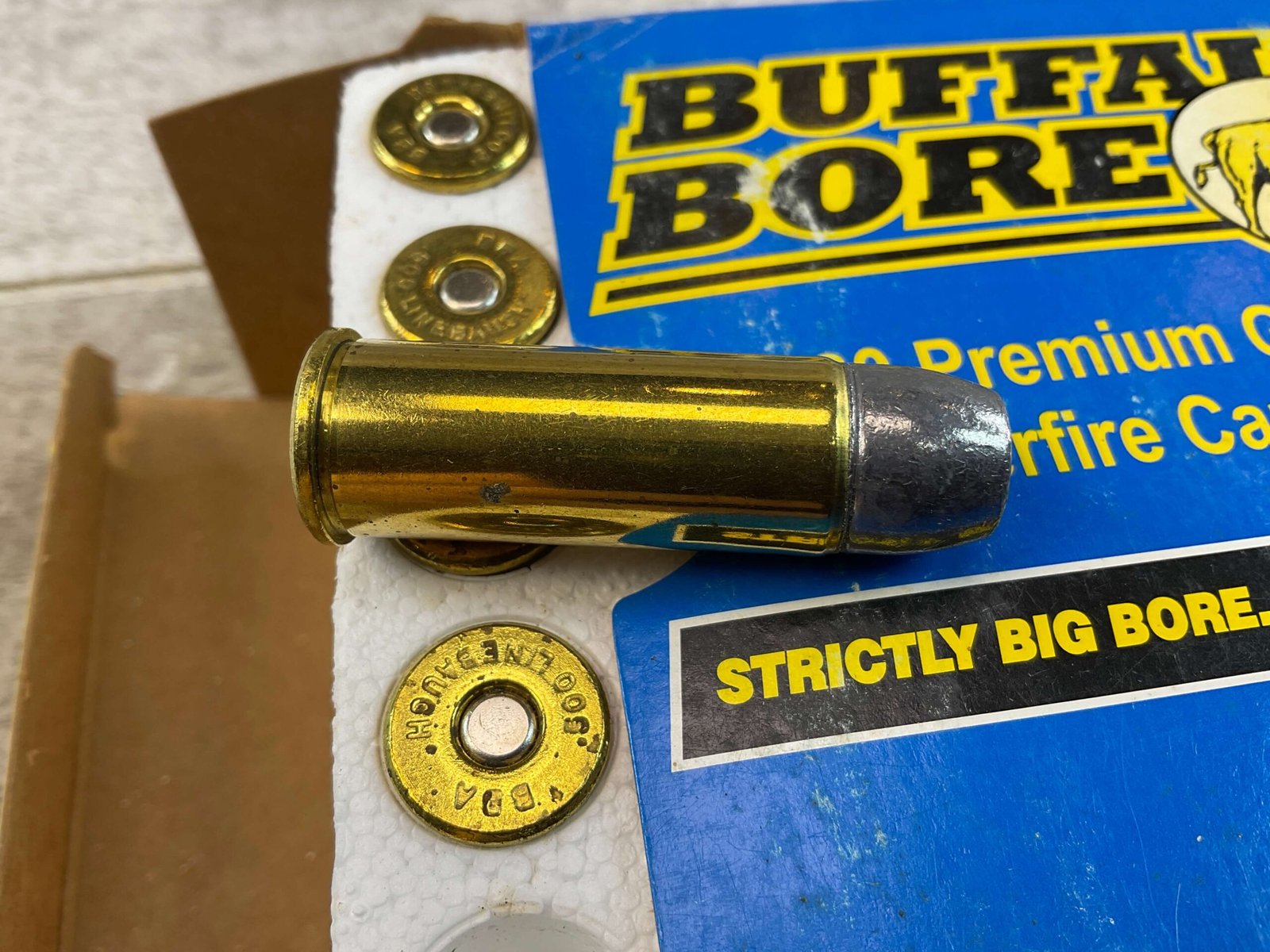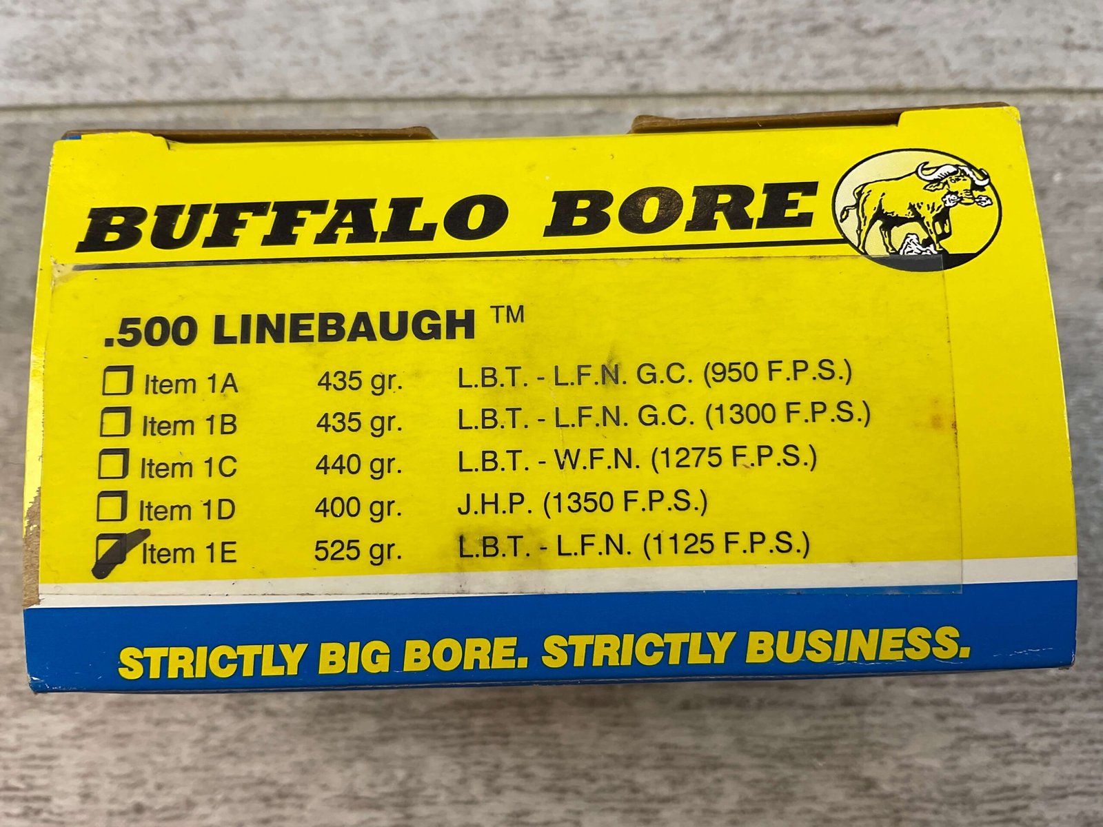 BUFFALO BORE .500 LINEBAUGH, 525 GR. LBT-LFN AMMO, FULL BOX (QTY 20), 1125 FPS, ITEM #1E, IN VERY GOOD CONDITION WITH SOME VERY SMALL WEAR FROM TRANSPORT!