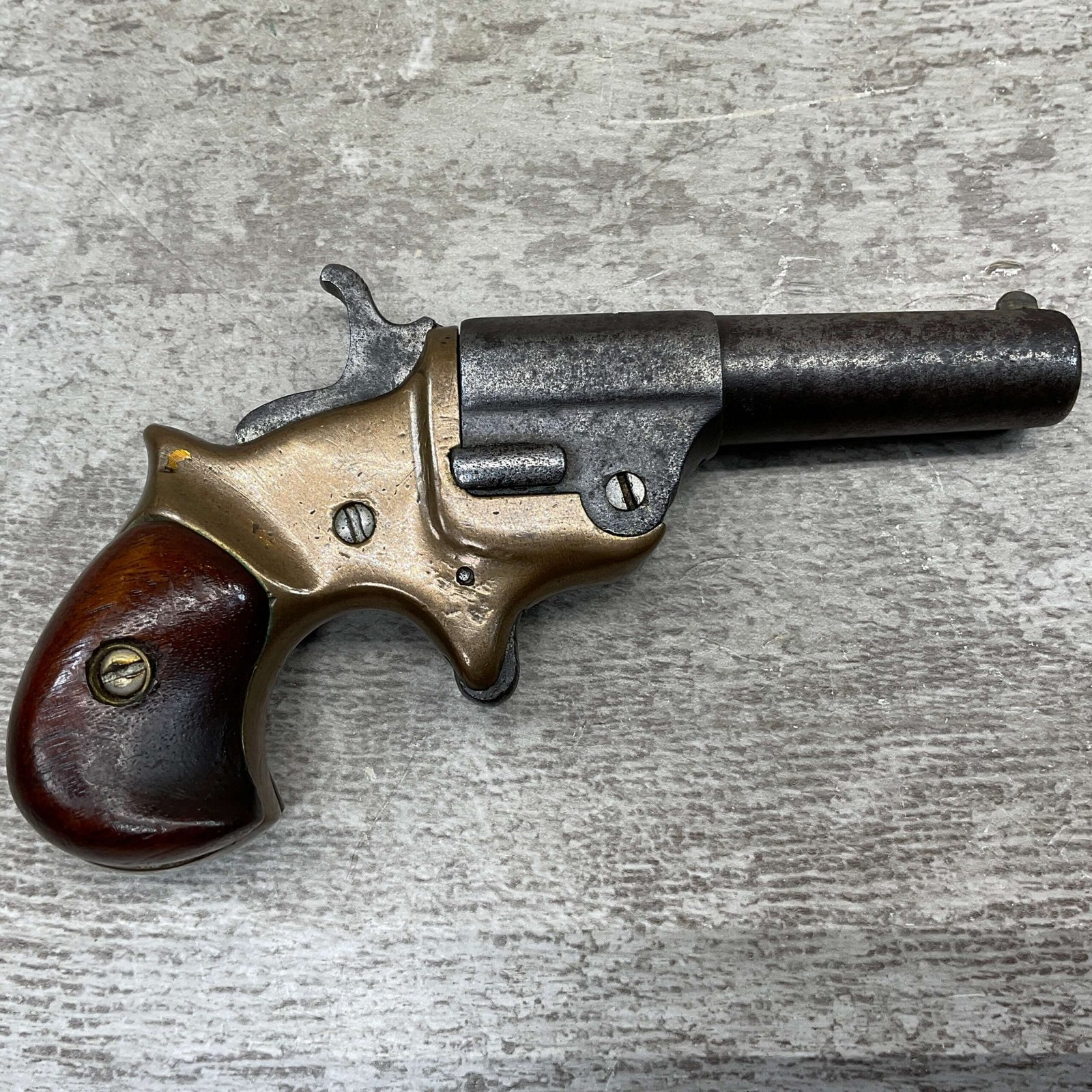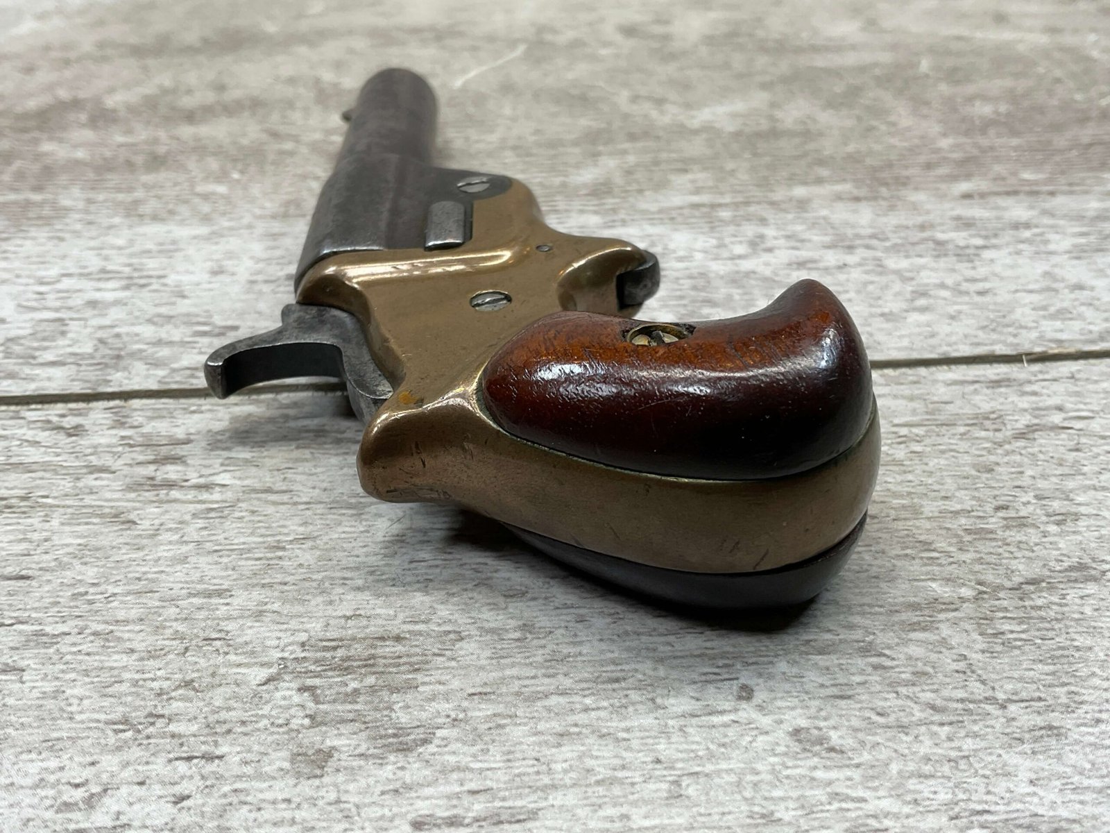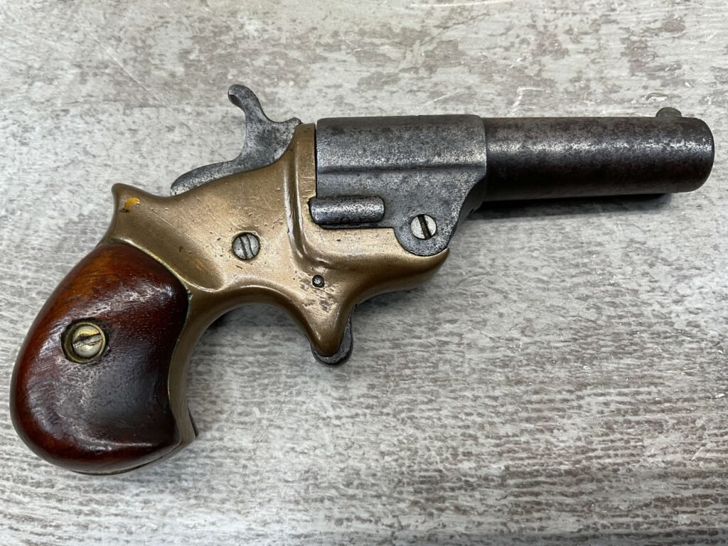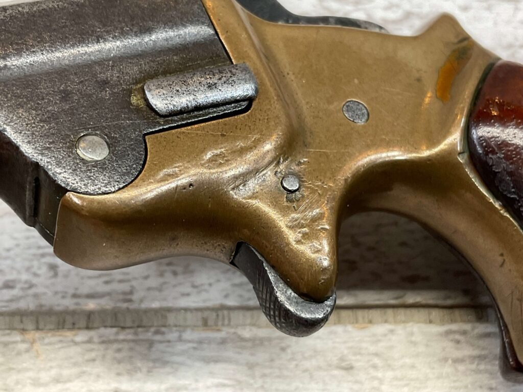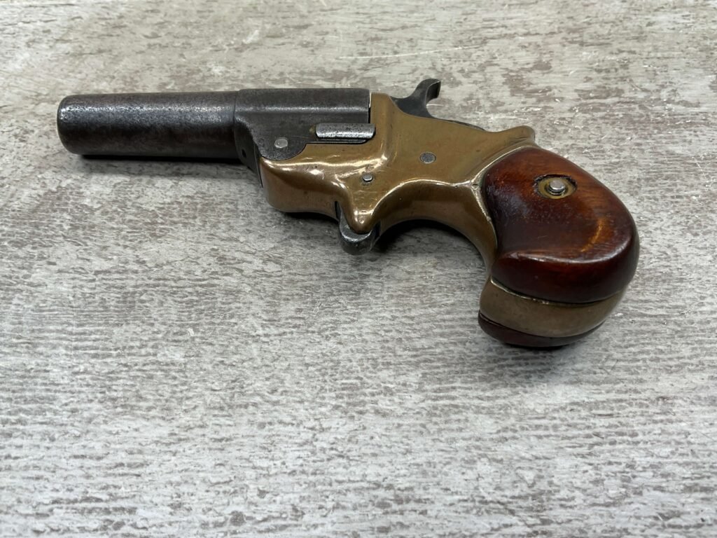 C.H. BALLARD & CO. .41RF DERRINGER SINGLE SHOT VEST POCKET PISTOL, ANTIQUE #2054, 2 3/4″ BARREL, POOR HEAVILY FROSTED BORE W/FAIR RIFLING, GRIPS ARE VG BUT REPLACEMENTS, VG BRASS FRAME W/ LIGHT NICKS & DINGS FROM AGE / USE, BARREL FINISH HAS TURNED GREY PATINA W/ PITTING, NOT A REPRODUCTION, OVERALL CONDITION AS SEEN IN PHOTOS