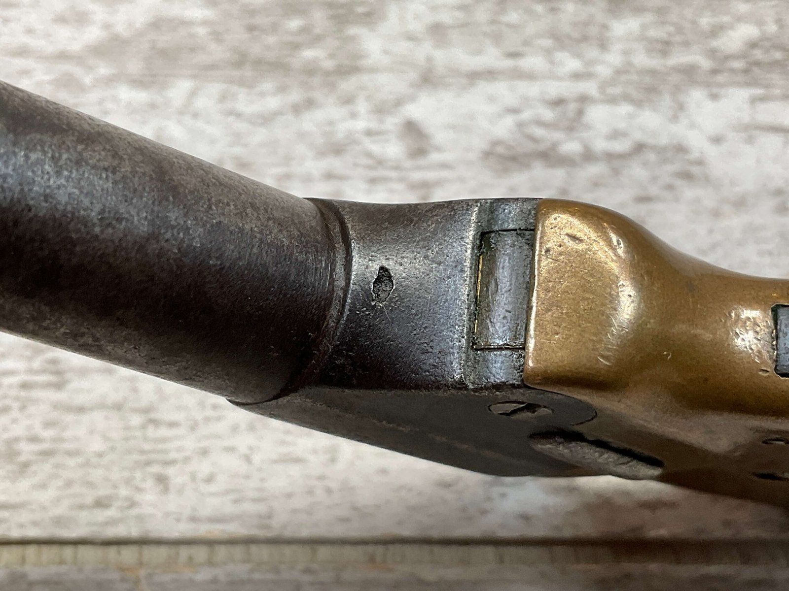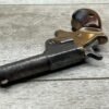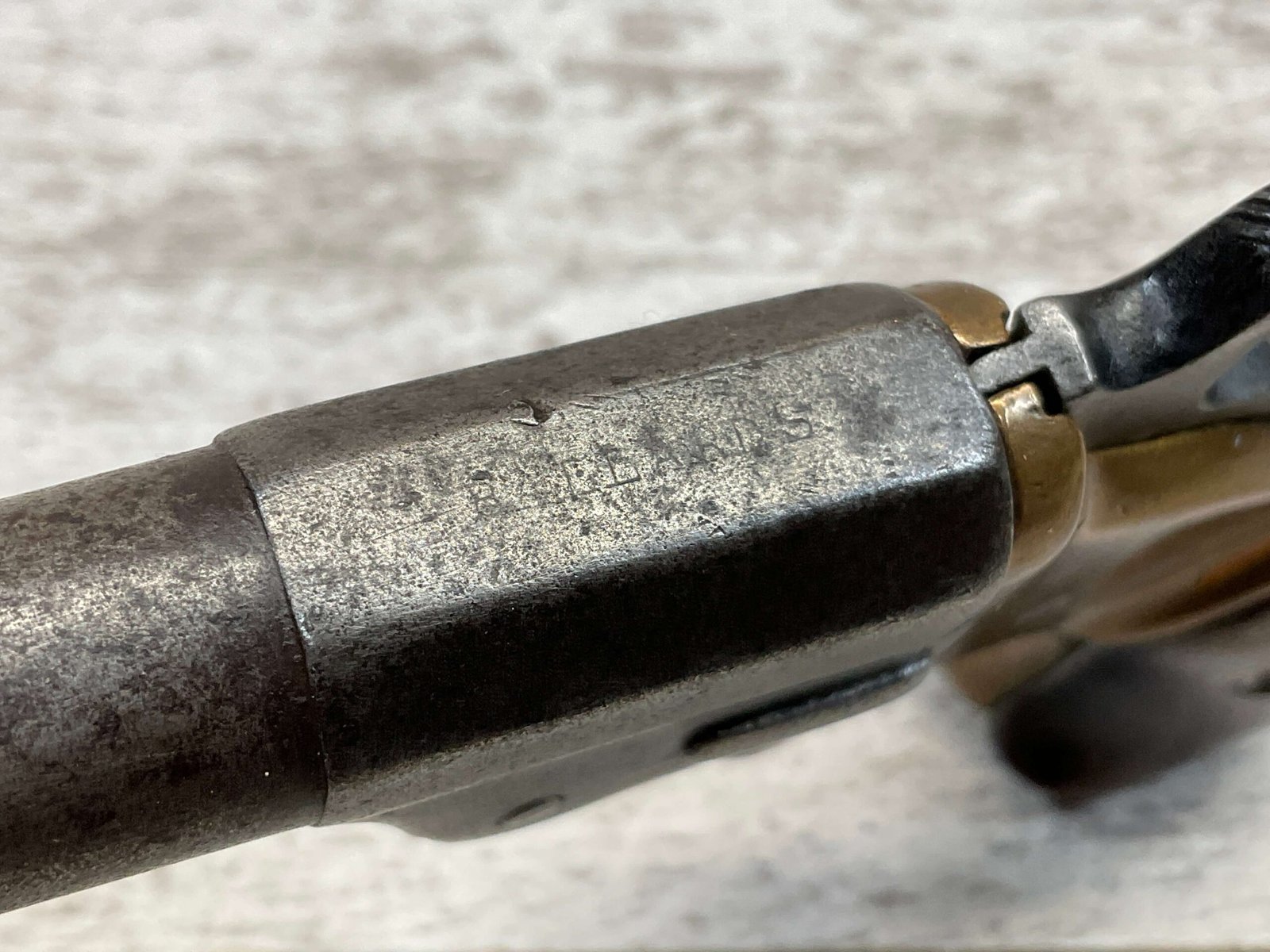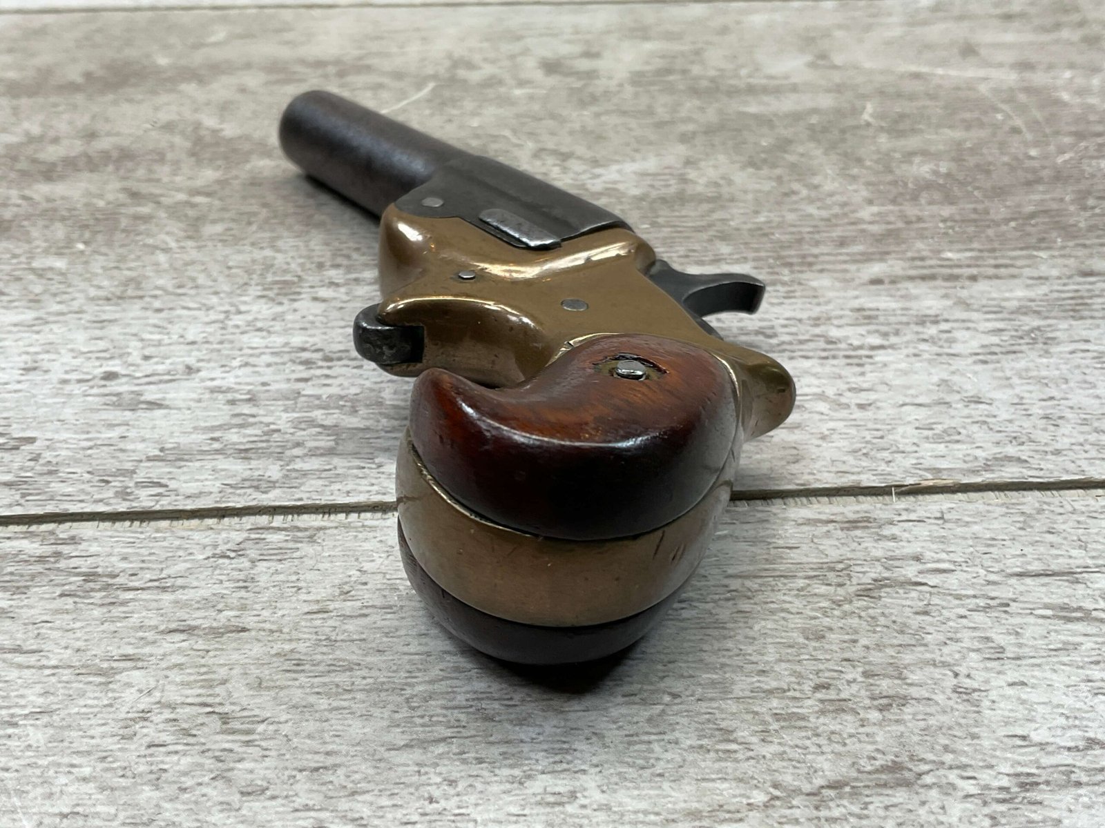 C.H. BALLARD & CO. .41RF DERRINGER SINGLE SHOT VEST POCKET PISTOL, ANTIQUE #2054, 2 3/4″ BARREL, POOR HEAVILY FROSTED BORE W/FAIR RIFLING, GRIPS ARE VG BUT REPLACEMENTS, VG BRASS FRAME W/ LIGHT NICKS & DINGS FROM AGE / USE, BARREL FINISH HAS TURNED GREY PATINA W/ PITTING, NOT A REPRODUCTION, OVERALL CONDITION AS SEEN IN PHOTOS