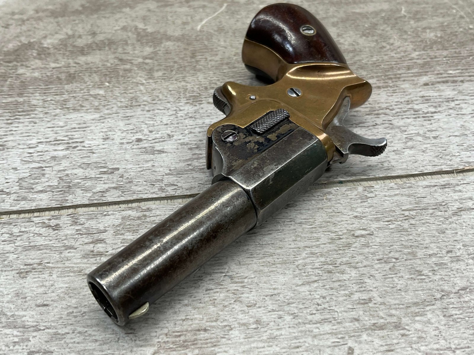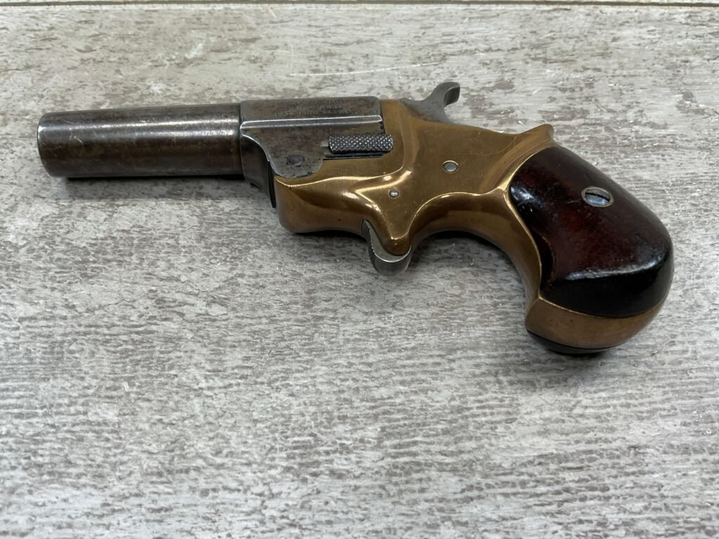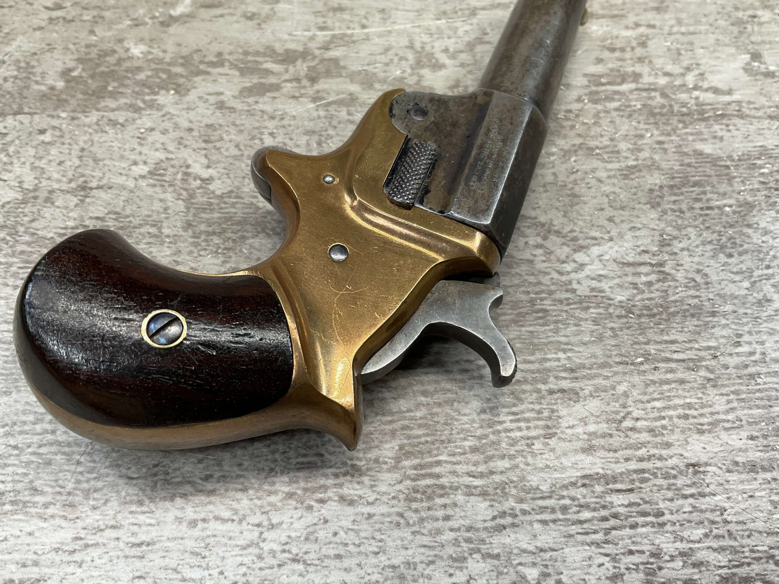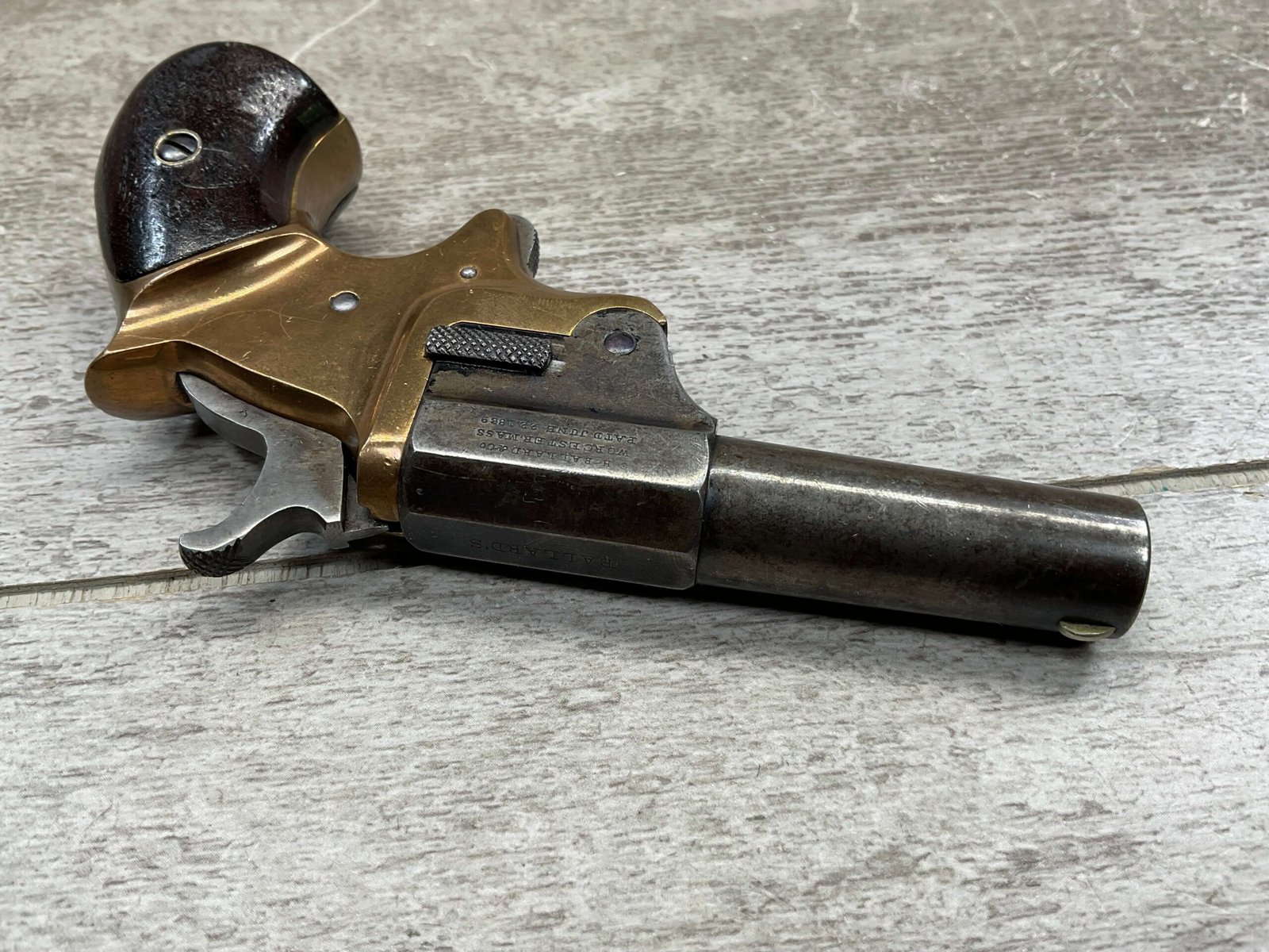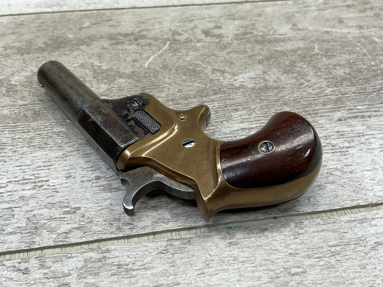 C.H. BALLARD & CO. .41RF SINGLE SHOT DERRINGER POCKET PISTOL, ANTIQUE #3806, .41RF, 2 13/16″ OCTAGONAL TO ROUND TIP DOWN BARREL, VERY NICE BRASS FRAME, FULLY FUNCTIONING, 50% BLUE REMAINING ON BARREL W/ AREAS TURING GREY PATINA, VG-GOOD BORE W/ COUPLE AREAS OF FROSTING & EXC RIFLING, EXC WOODEN GRIPS, SPUR TRIGGER, 1870 MFR, VERY NICE & TIGHT MECHANICALLY, NOT A REPRODUCTION, OVERALL CONDITION AS SEEN IN PHOTOS.!!