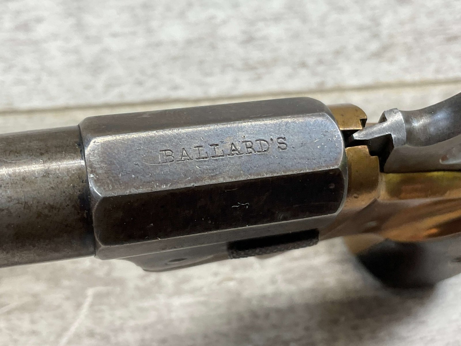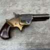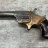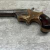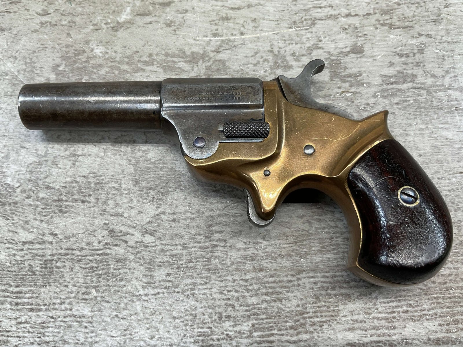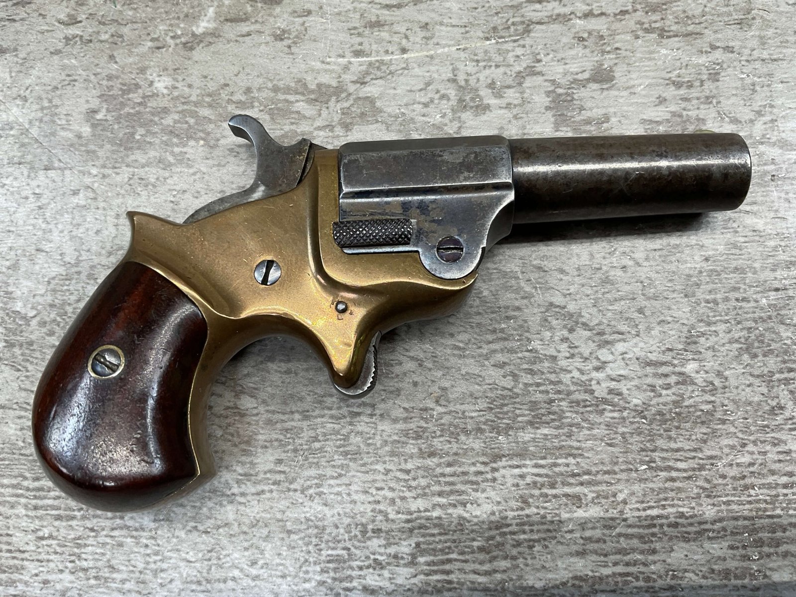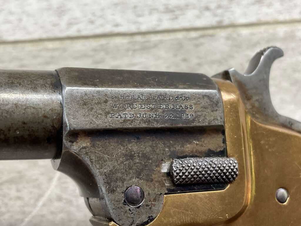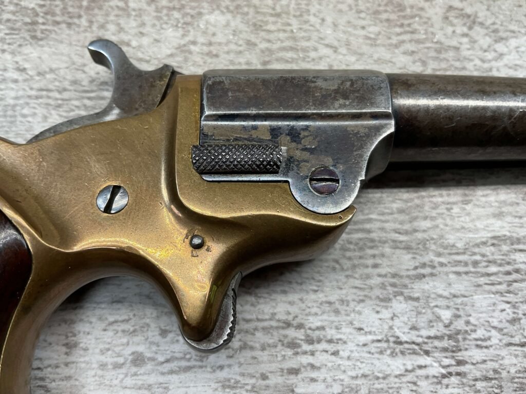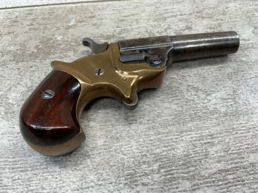 C.H. BALLARD & CO. .41RF SINGLE SHOT DERRINGER POCKET PISTOL, ANTIQUE #3806, .41RF, 2 13/16″ OCTAGONAL TO ROUND TIP DOWN BARREL, VERY NICE BRASS FRAME, FULLY FUNCTIONING, 50% BLUE REMAINING ON BARREL W/ AREAS TURING GREY PATINA, VG-GOOD BORE W/ COUPLE AREAS OF FROSTING & EXC RIFLING, EXC WOODEN GRIPS, SPUR TRIGGER, 1870 MFR, VERY NICE & TIGHT MECHANICALLY, NOT A REPRODUCTION, OVERALL CONDITION AS SEEN IN PHOTOS.!!
