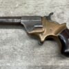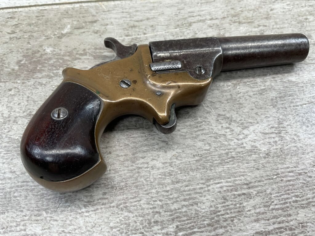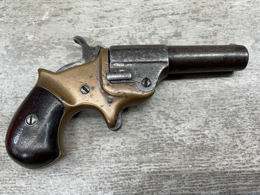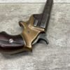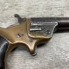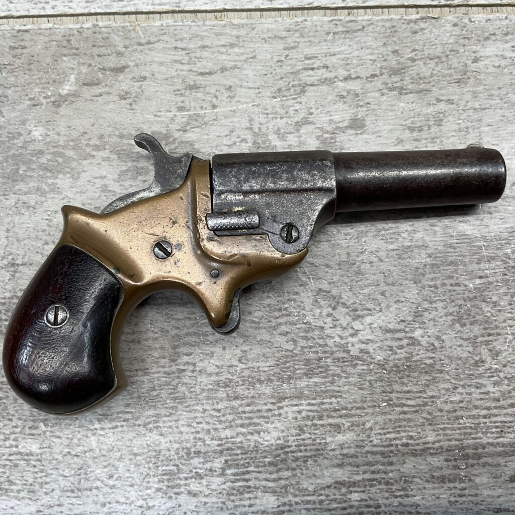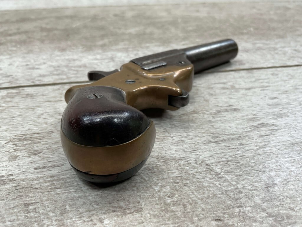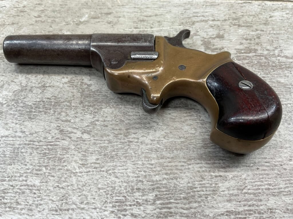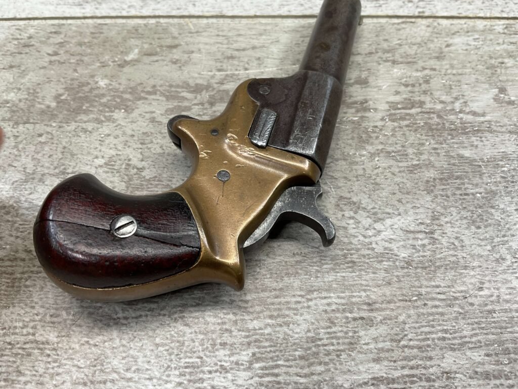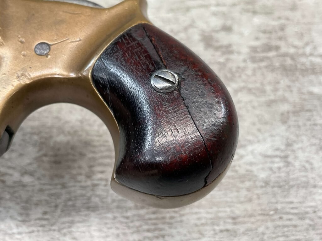 C.H. BALLARD & CO. .41RF SINGLE SHOT DERRINGER POCKET PISTOL, ANTIQUE #2738, .41RF, 2 13/16″ OCTAGONAL TO ROUND TIP DOWN BARREL, VERY NICE BRASS FRAME, FULLY FUNCTIONING, 30% BLUE REMAINING ON BARREL W/ AREAS TURING GREY/BROWN PATINA, POOR BORE W/ FROSTING THROUGHOUT, FAIR WOODEN GRIPS W/ LEFT ONE CRACKED, SPUR TRIGGER, 1870 MFR, TIGHT MECHANICALLY!!