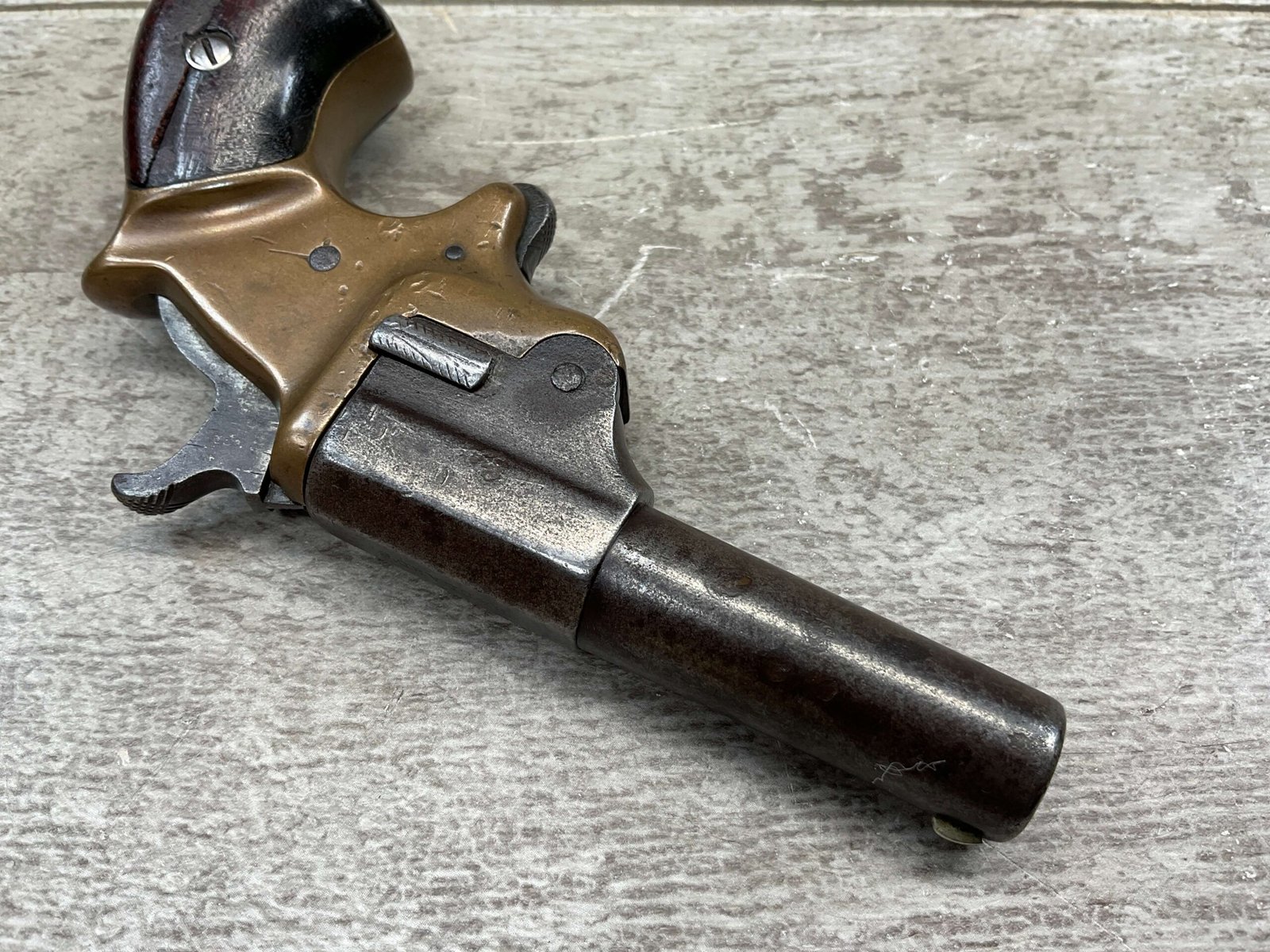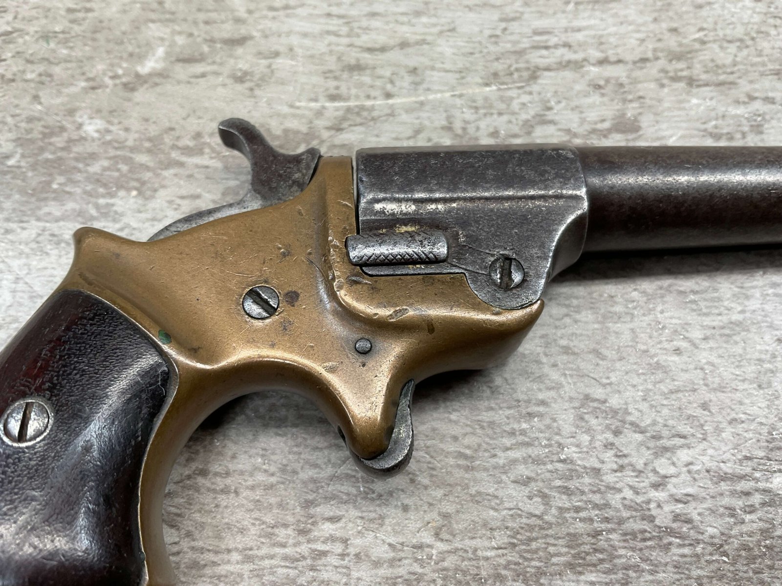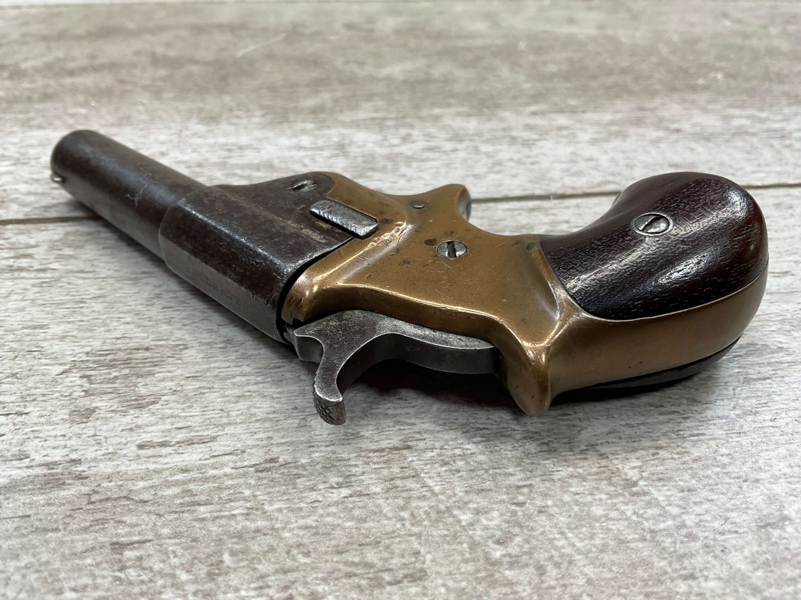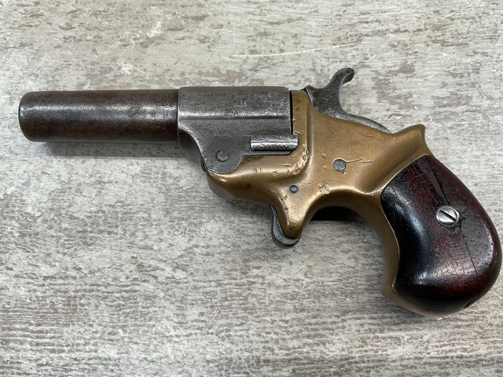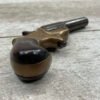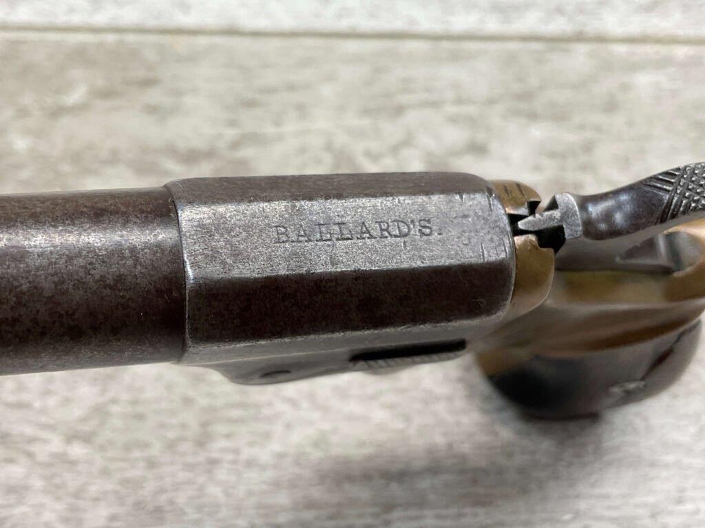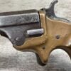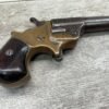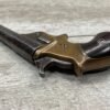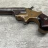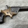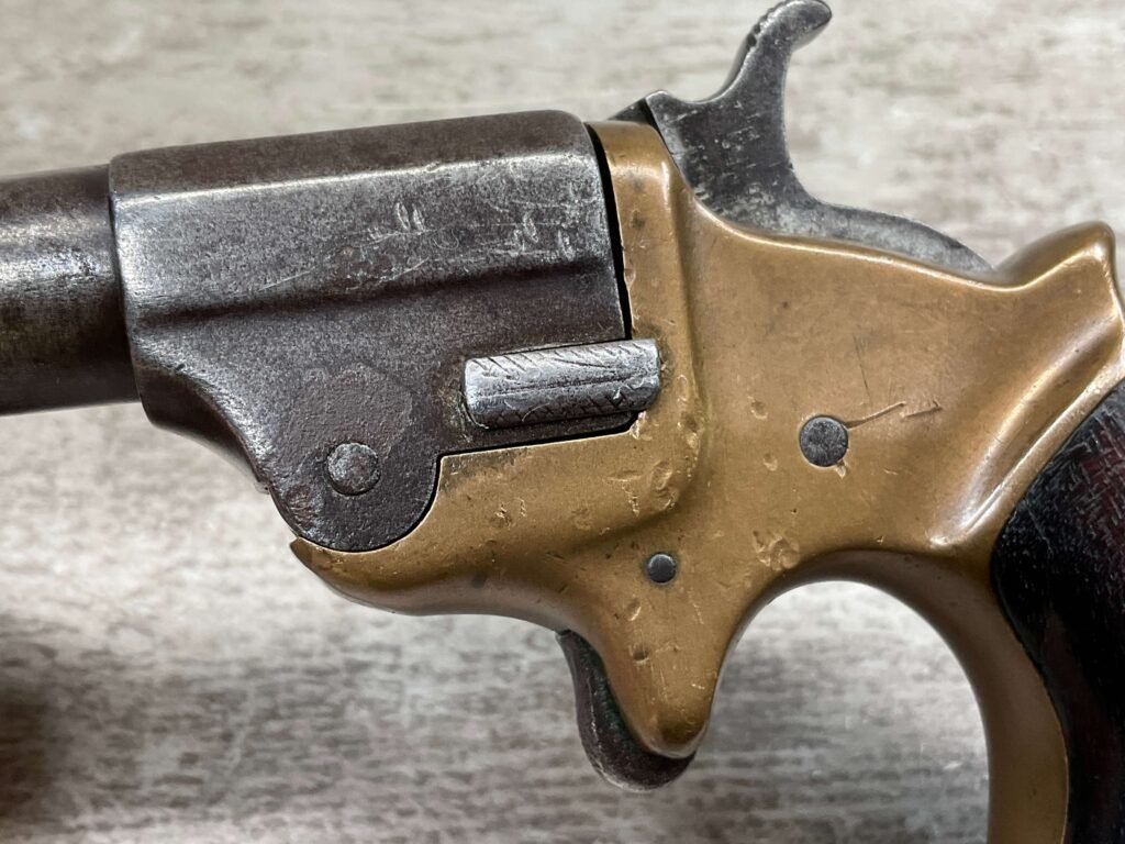 C.H. BALLARD & CO. .41RF SINGLE SHOT DERRINGER POCKET PISTOL, ANTIQUE #2738, .41RF, 2 13/16″ OCTAGONAL TO ROUND TIP DOWN BARREL, VERY NICE BRASS FRAME, FULLY FUNCTIONING, 30% BLUE REMAINING ON BARREL W/ AREAS TURING GREY/BROWN PATINA, POOR BORE W/ FROSTING THROUGHOUT, FAIR WOODEN GRIPS W/ LEFT ONE CRACKED, SPUR TRIGGER, 1870 MFR, TIGHT MECHANICALLY!!