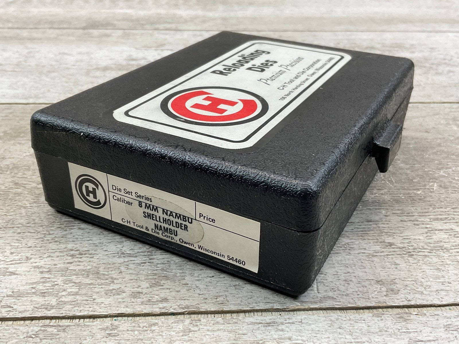 C-H TOOL & DIE CORP. 8MM NAMBU DIE SET W/ SHELL HOLDER, VINTAGE, INCLUDES ALL PIECES AND IS IN VG-EXC CONDITION.