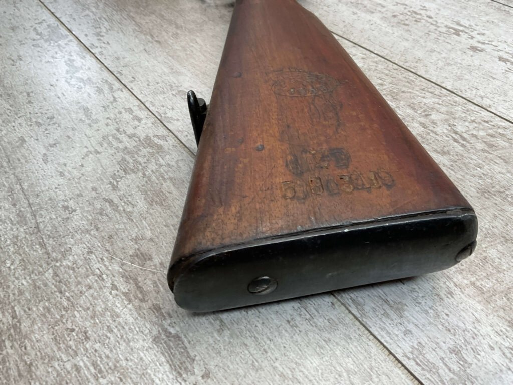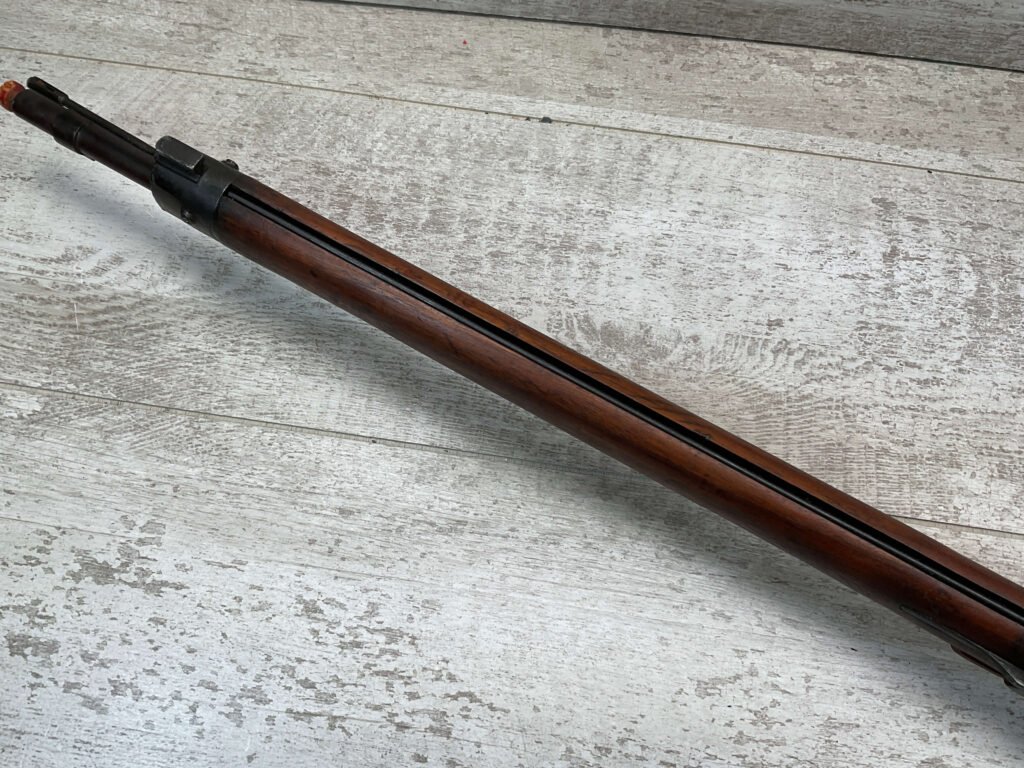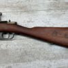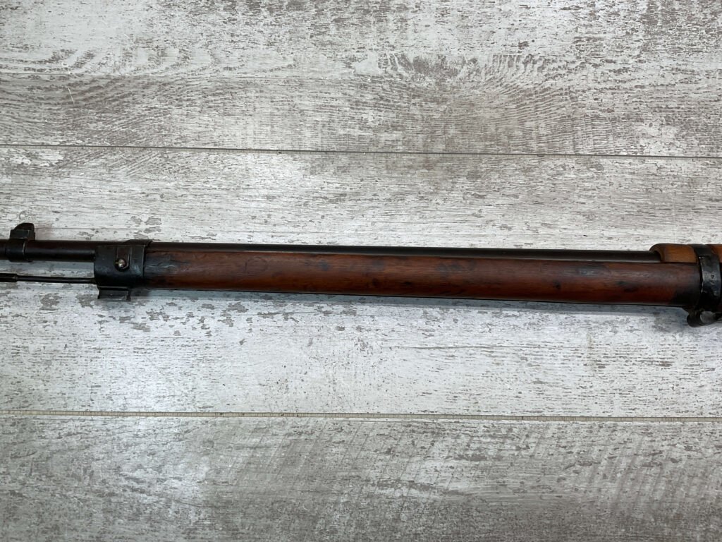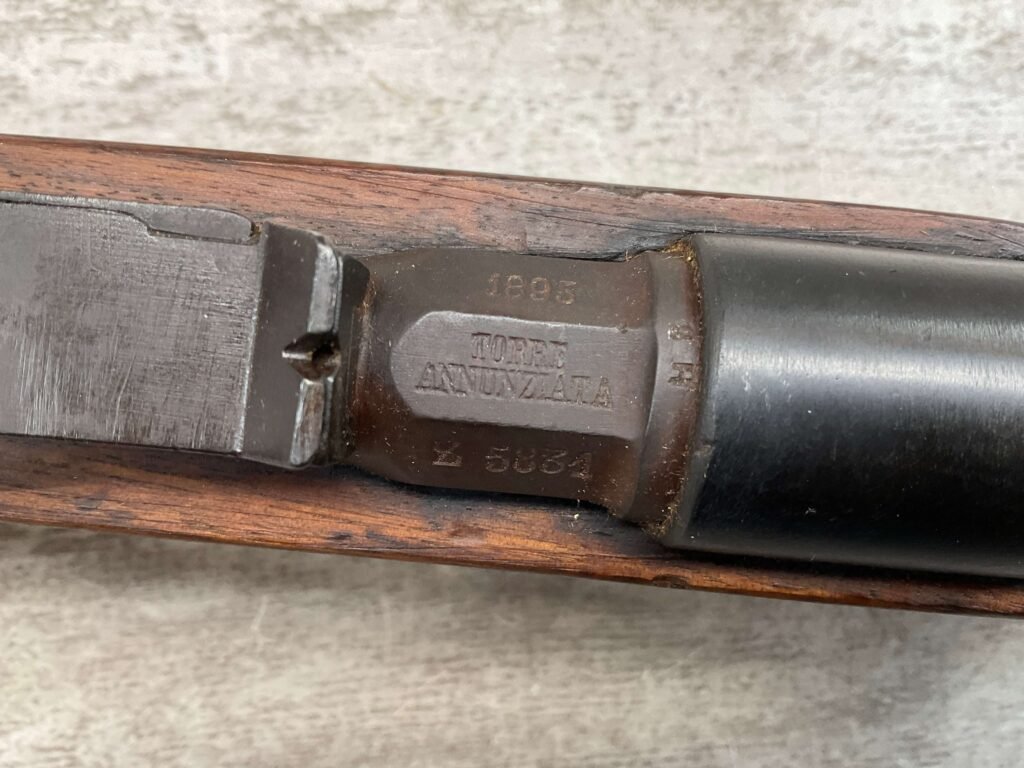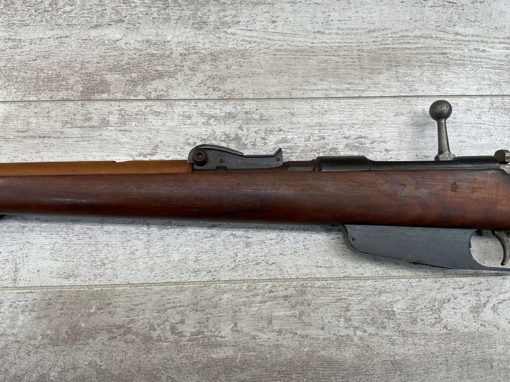 The antique Carcano Model 91 is characterized by its distinctive stock and handguard crafted from wood, showcasing the traditional craftsmanship of the era. The aged patina and wear on the wood and metal components tell a story of the rifle’s service life and contribute to its unique character as an antique firearm.