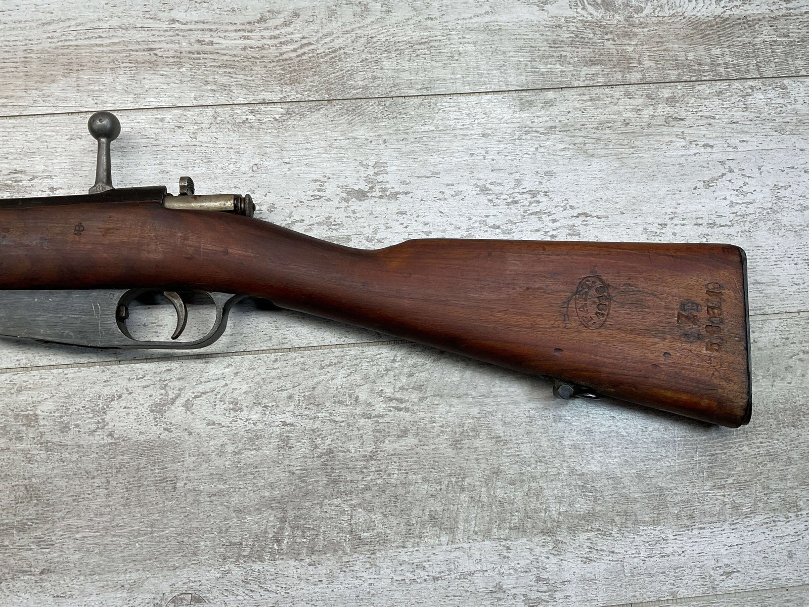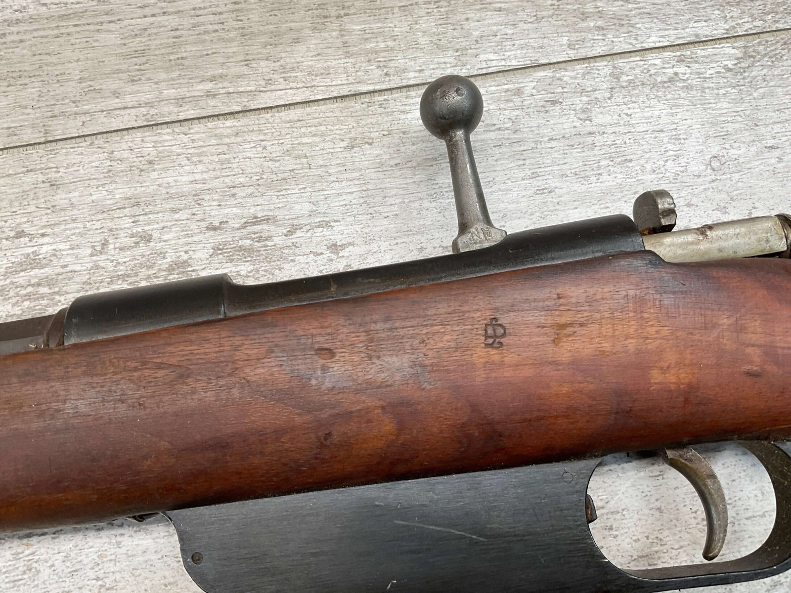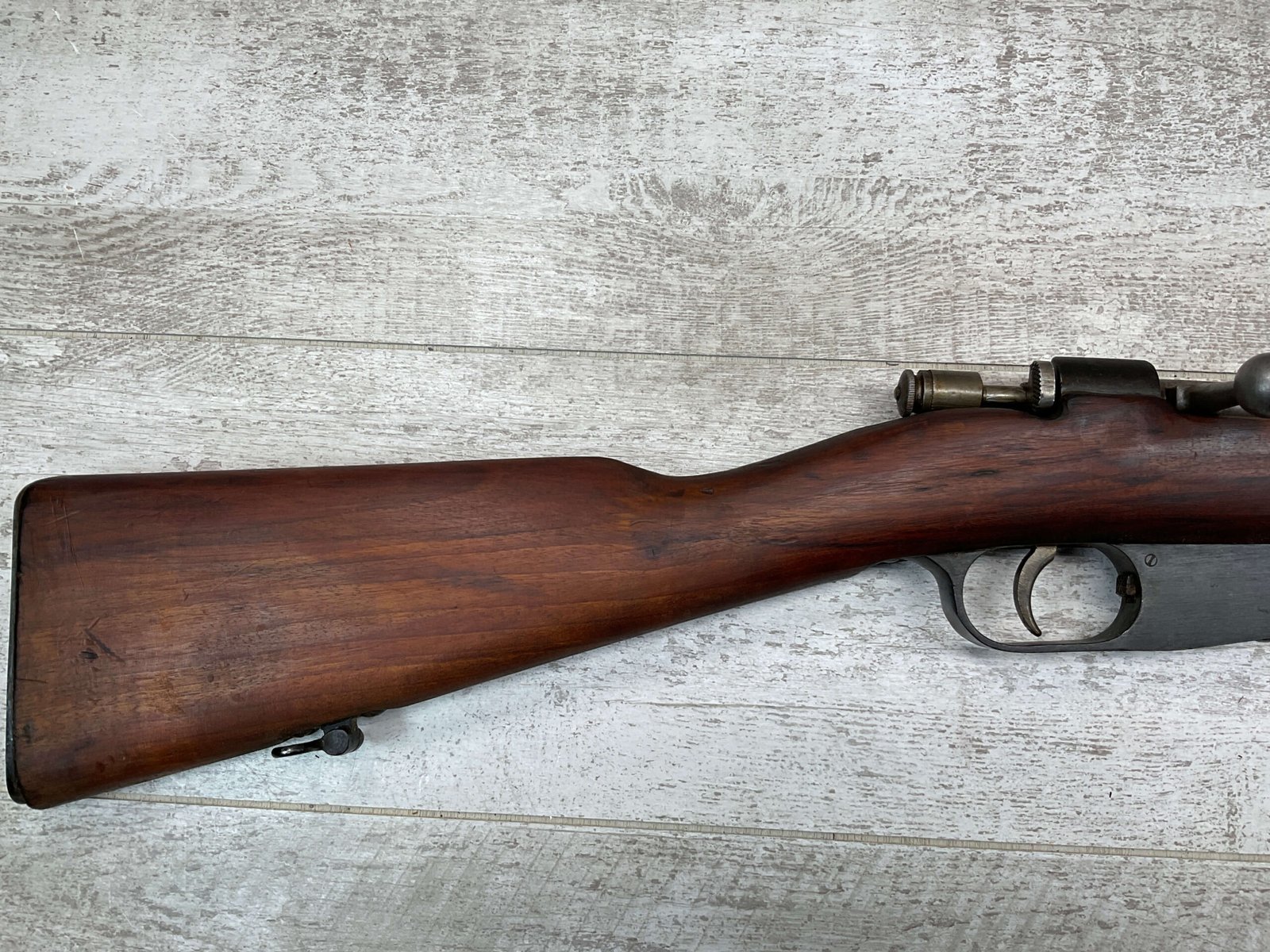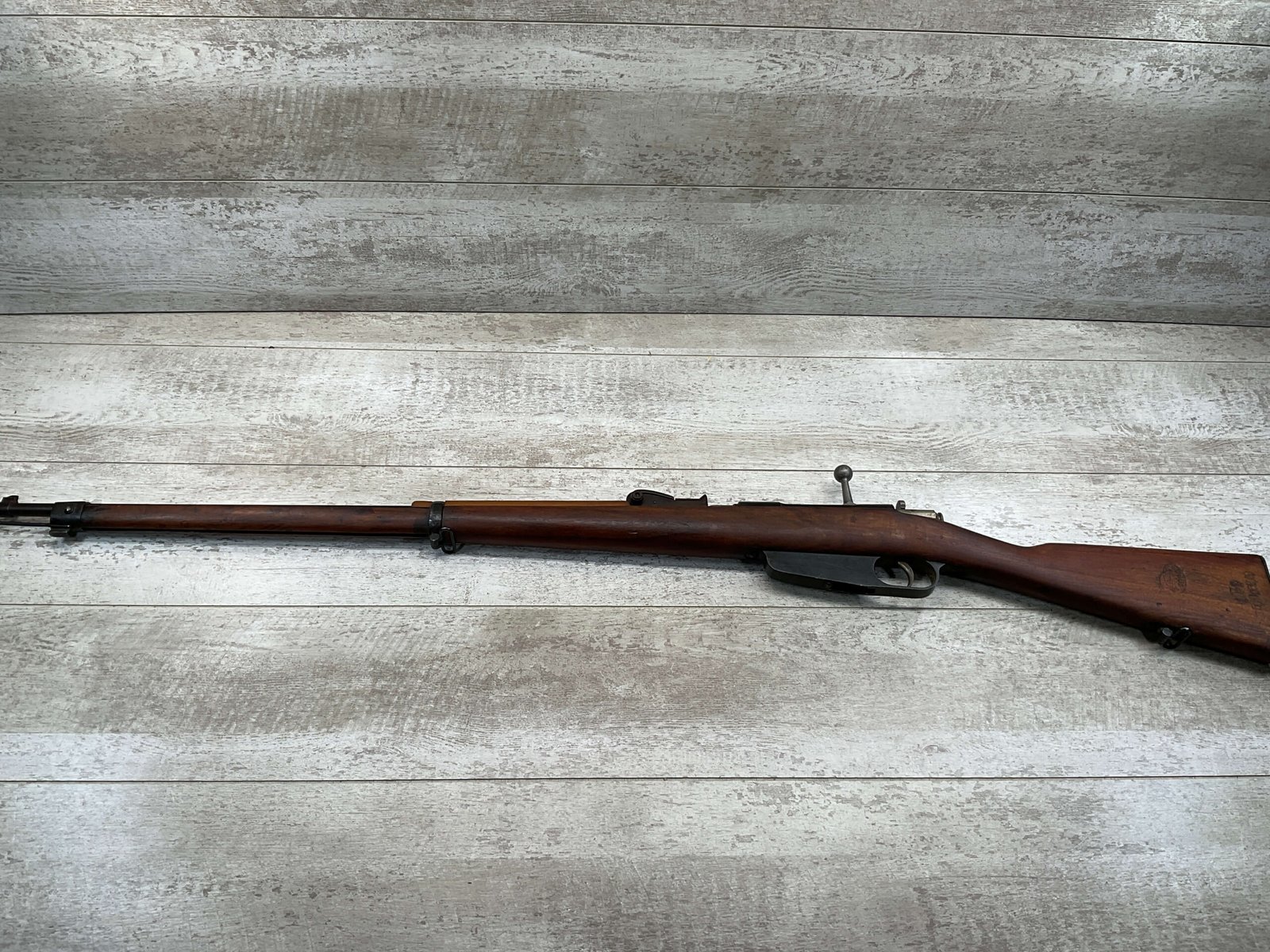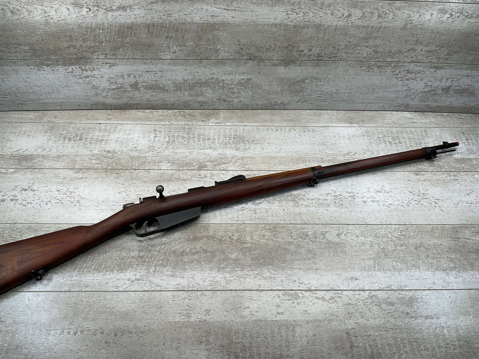 The antique Carcano Model 91 is characterized by its distinctive stock and handguard crafted from wood, showcasing the traditional craftsmanship of the era. The aged patina and wear on the wood and metal components tell a story of the rifle’s service life and contribute to its unique character as an antique firearm.