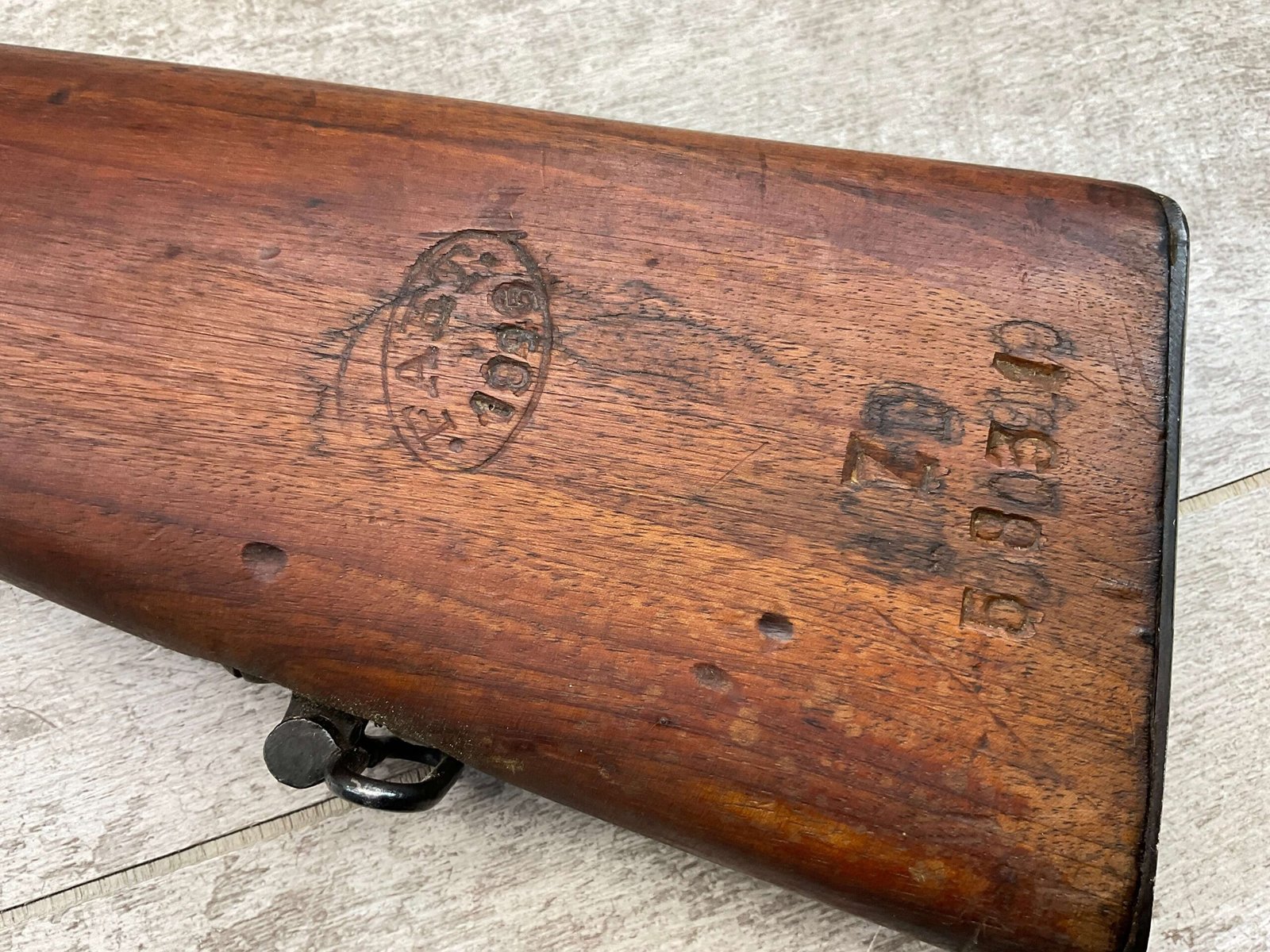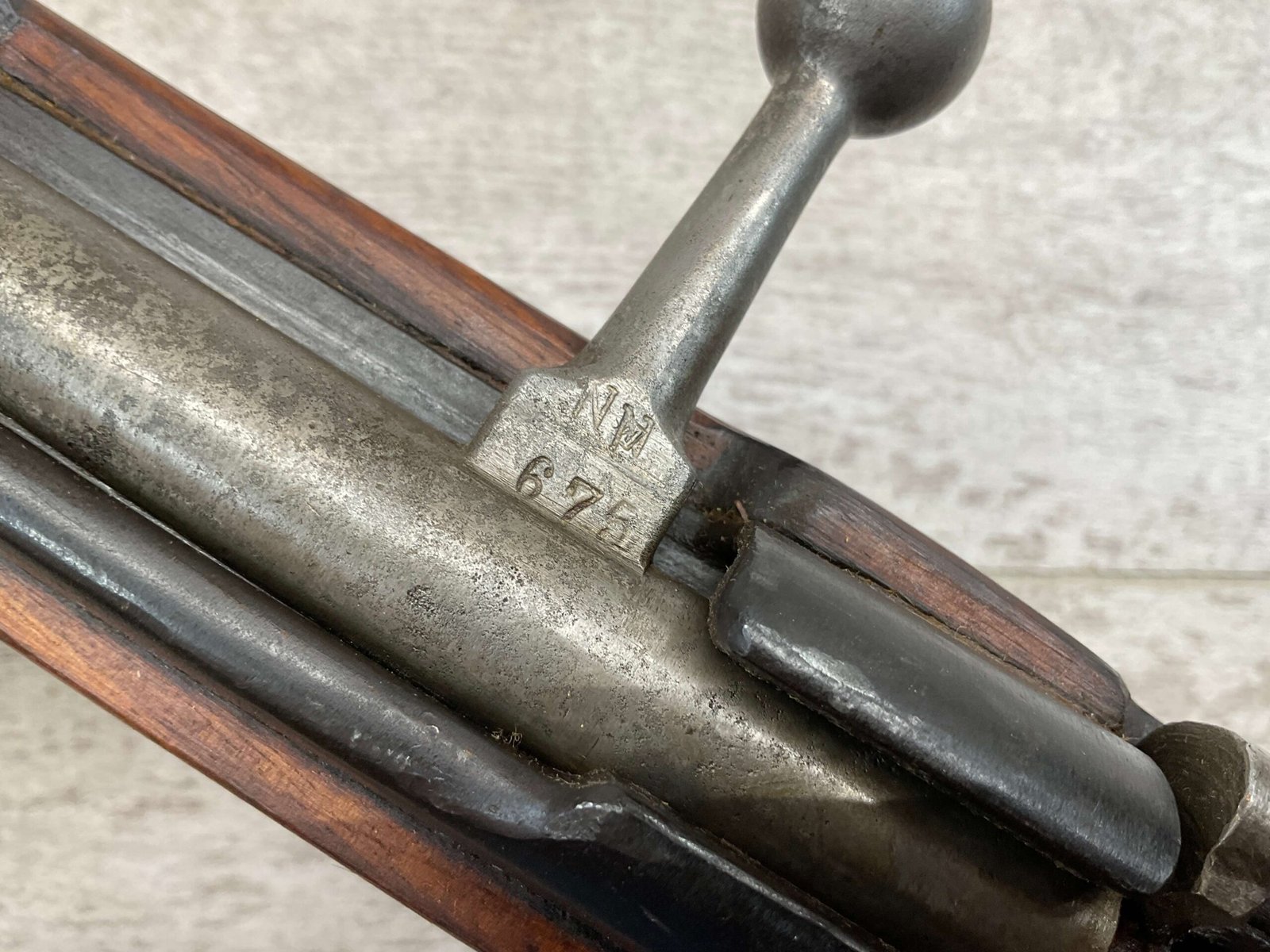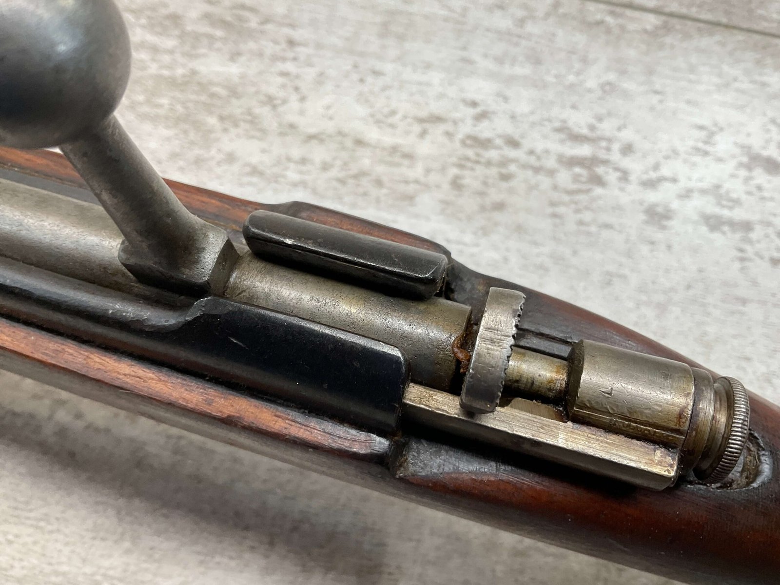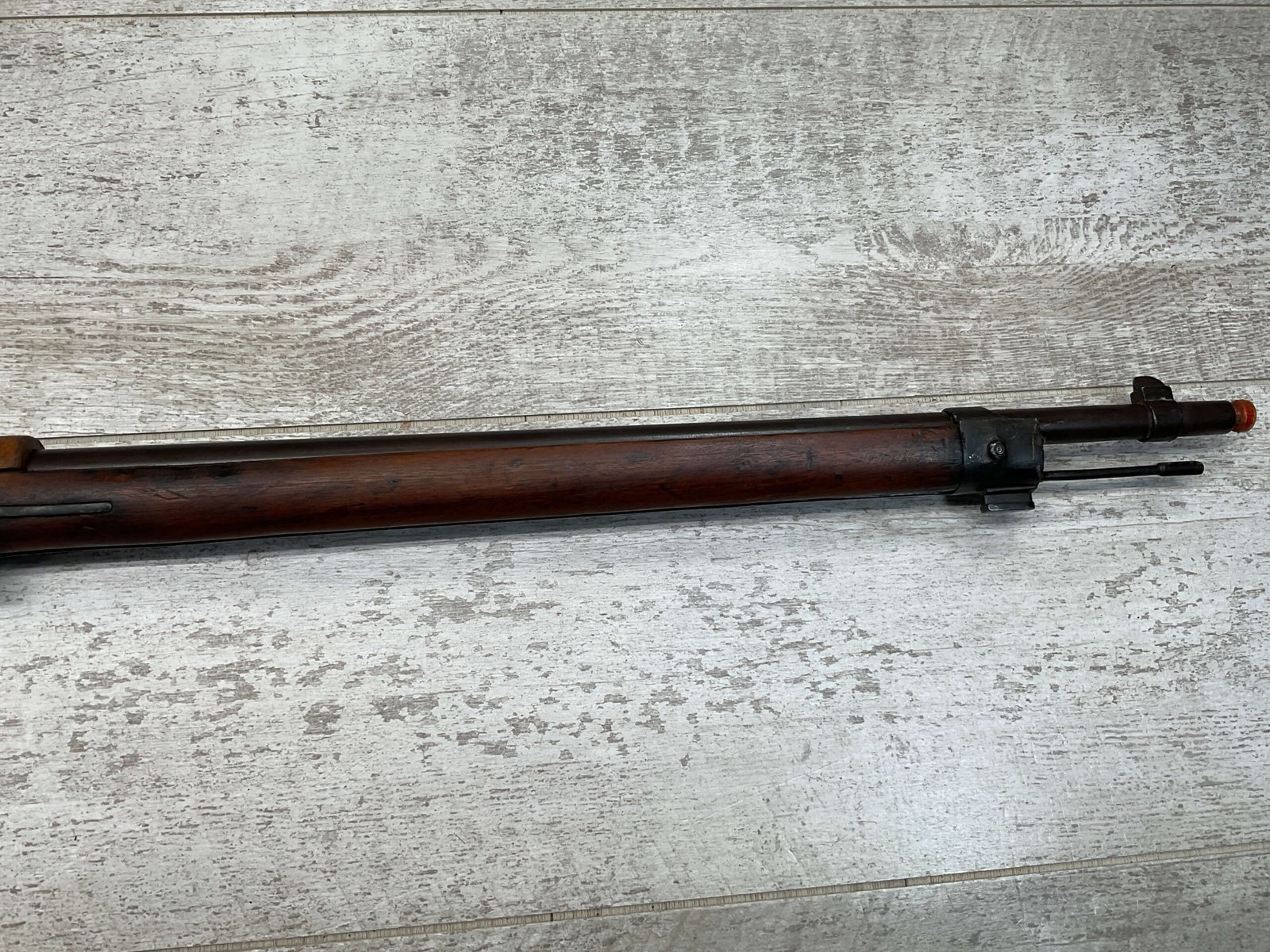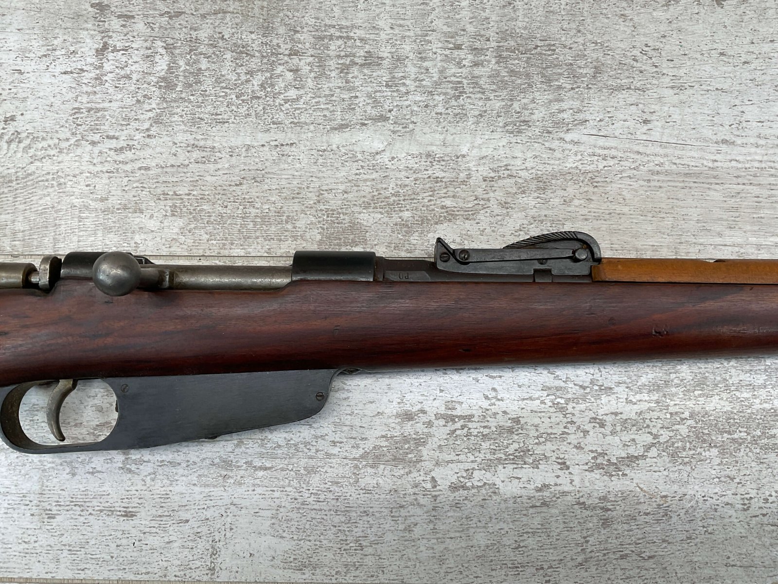 The antique Carcano Model 91 is characterized by its distinctive stock and handguard crafted from wood, showcasing the traditional craftsmanship of the era. The aged patina and wear on the wood and metal components tell a story of the rifle’s service life and contribute to its unique character as an antique firearm.