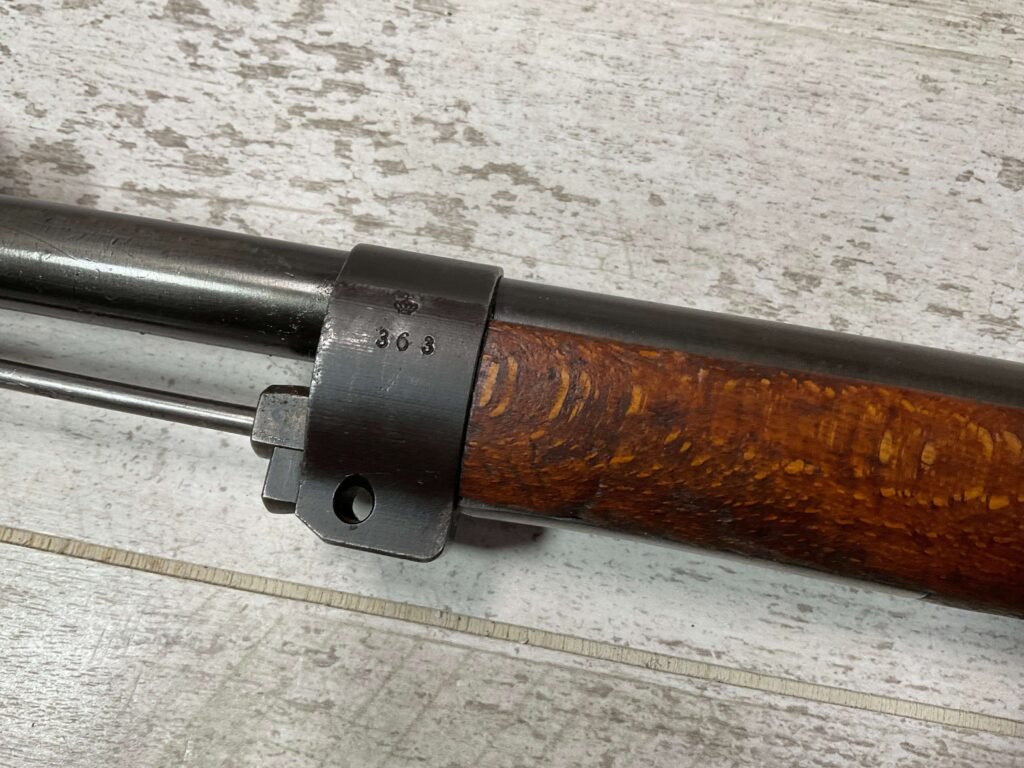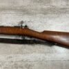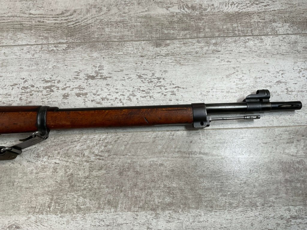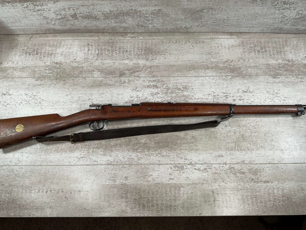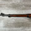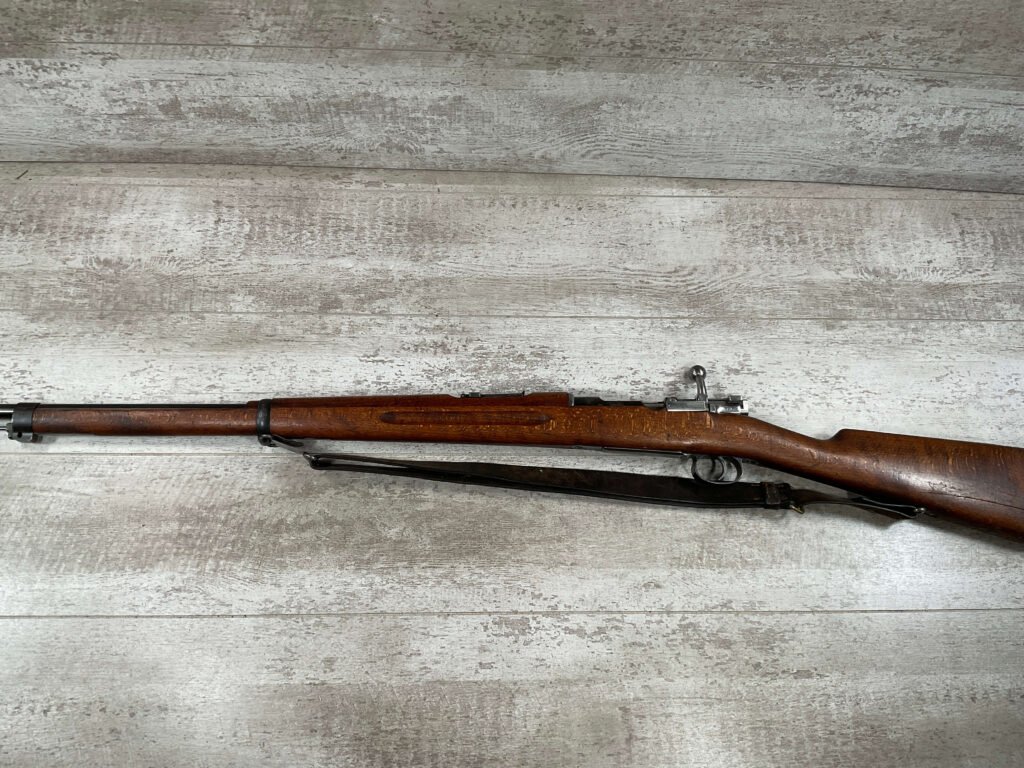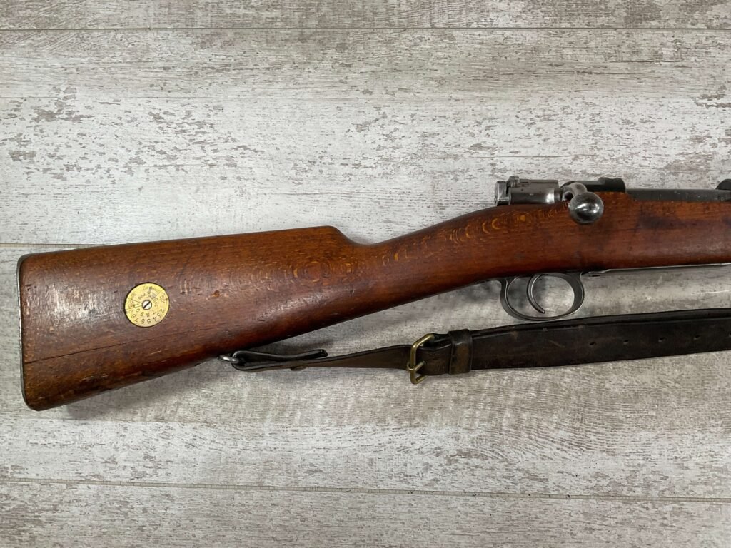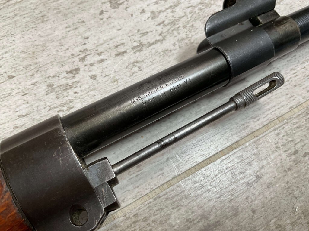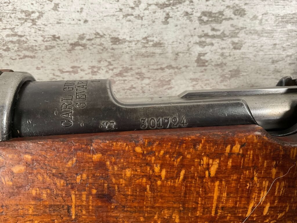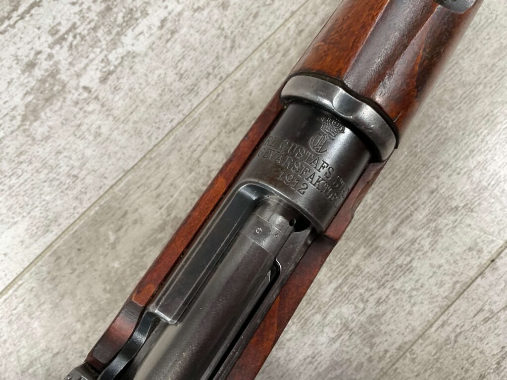 CARL GUSTAF 1896 DATED 1912 BOLT ACTION RIFLE IN 6.5×55 #YT 301724, 29″ BBL, GOOD BRIGHT BORE W/EXC RIFLING & SOME LIGHT FROSTING, EXC STOCK W/LIGHT DINGS & SCRATCHES, SMOOTH BUTTPLATE, RECEIVER AND BOLT MATCHING, FRONT SIGHT BLADE W/HOOD, REAR ELEVATION ADJUSTABLE SIGHT, LEATHER SLING, THREADED BARREL W/COMPENSATOR, NON-MATCHING CORRECT CLEANING ROD, LIGHT IMPORT MARK ON RIGHT SIDE OF BARREL, 90+%
