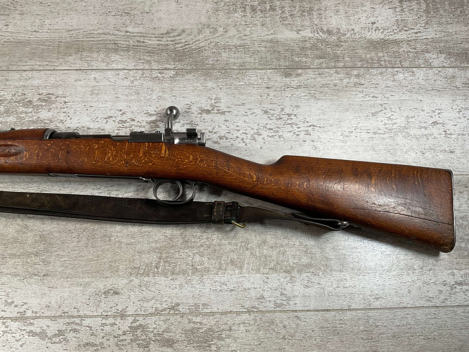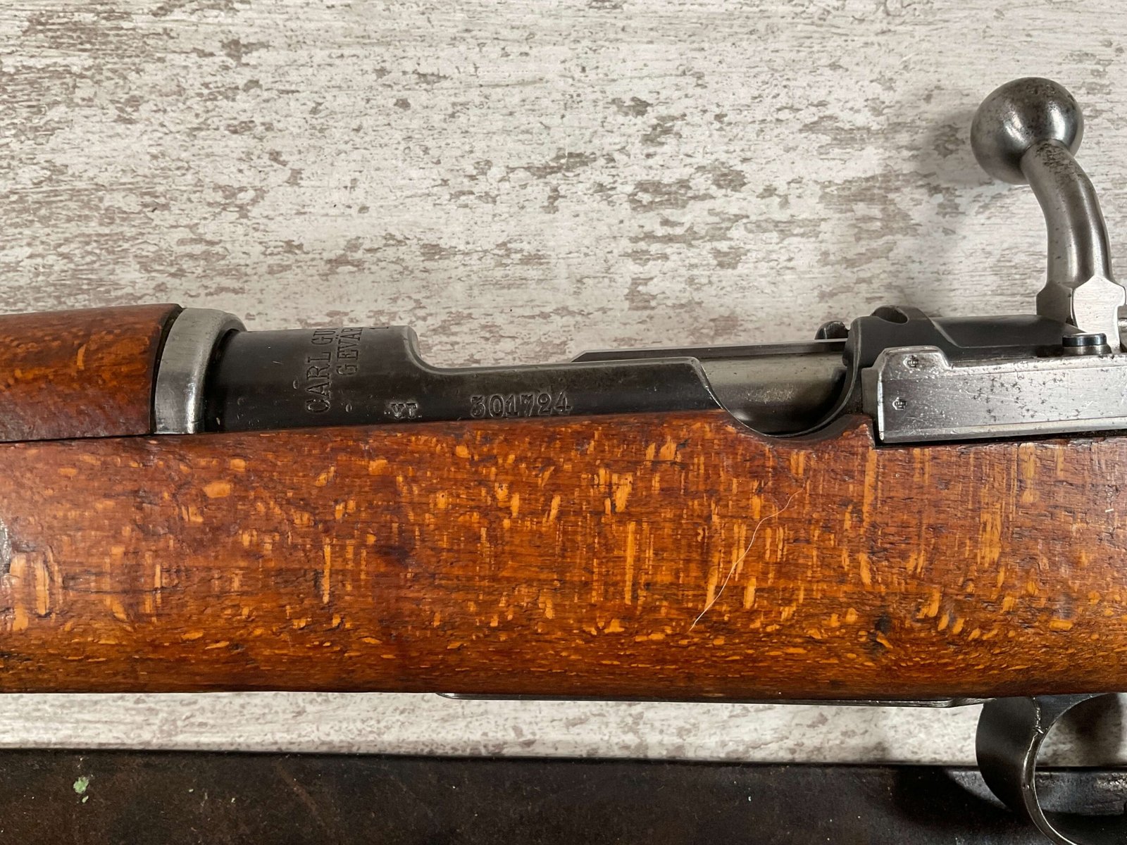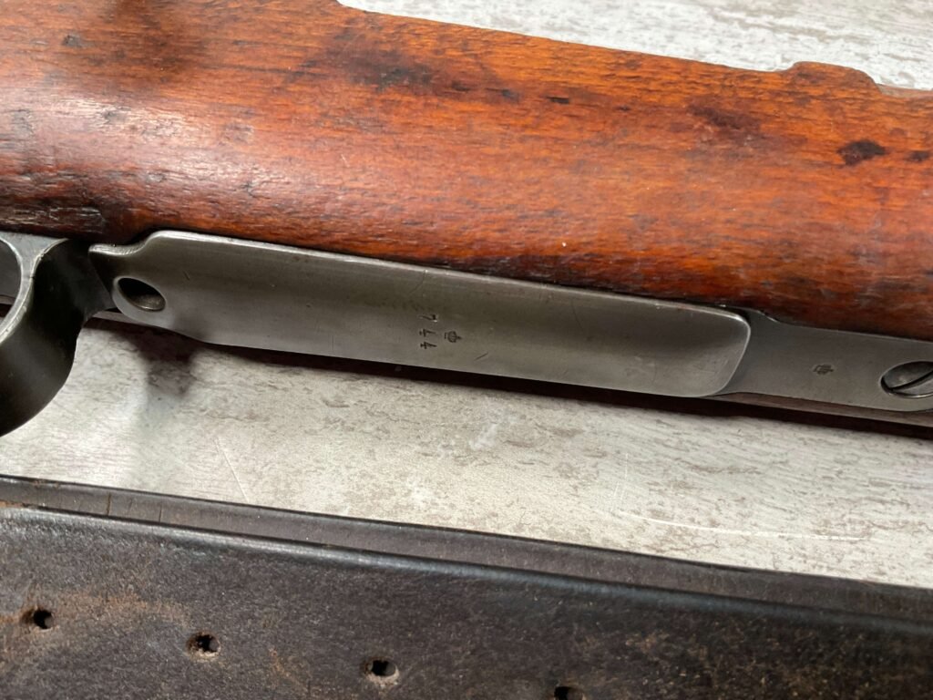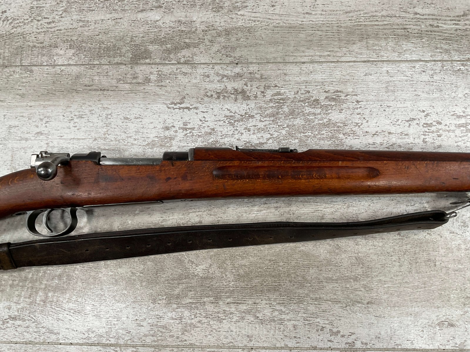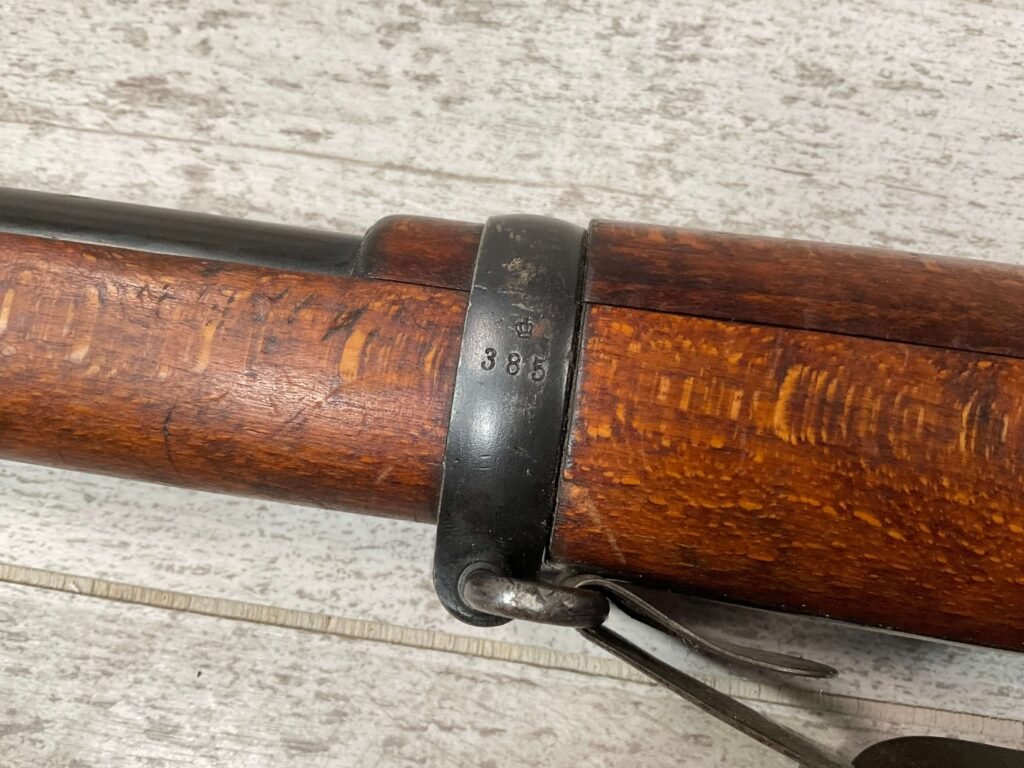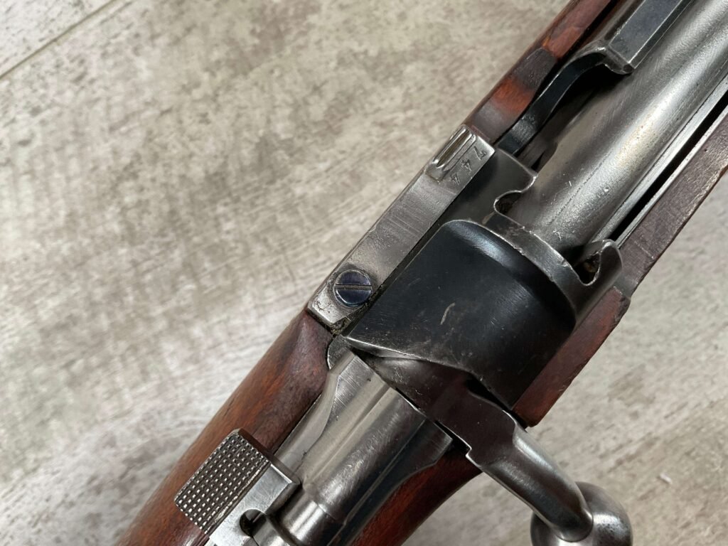 CARL GUSTAF 1896 DATED 1912 BOLT ACTION RIFLE IN 6.5×55 #YT 301724, 29″ BBL, GOOD BRIGHT BORE W/EXC RIFLING & SOME LIGHT FROSTING, EXC STOCK W/LIGHT DINGS & SCRATCHES, SMOOTH BUTTPLATE, RECEIVER AND BOLT MATCHING, FRONT SIGHT BLADE W/HOOD, REAR ELEVATION ADJUSTABLE SIGHT, LEATHER SLING, THREADED BARREL W/COMPENSATOR, NON-MATCHING CORRECT CLEANING ROD, LIGHT IMPORT MARK ON RIGHT SIDE OF BARREL, 90+%