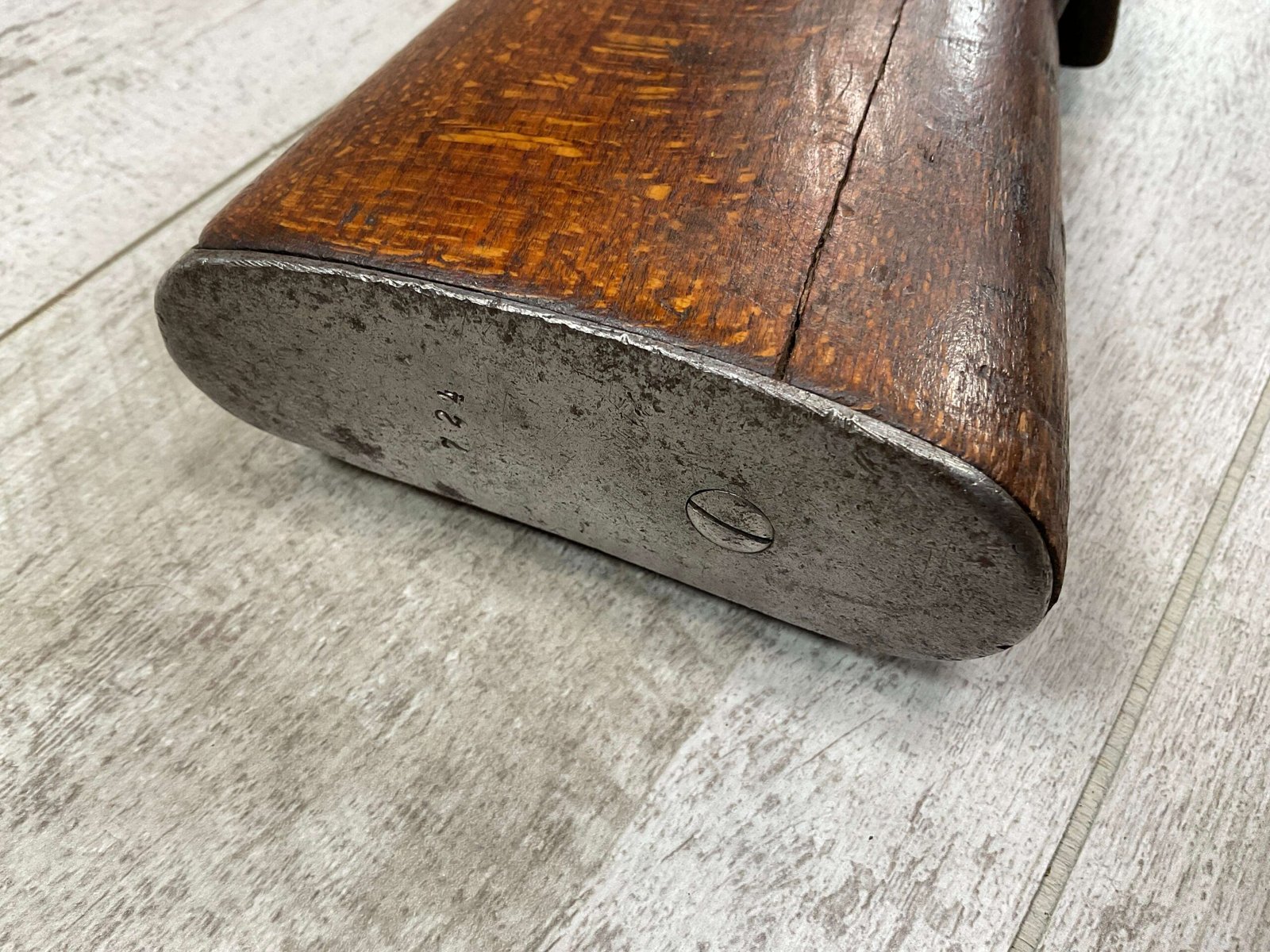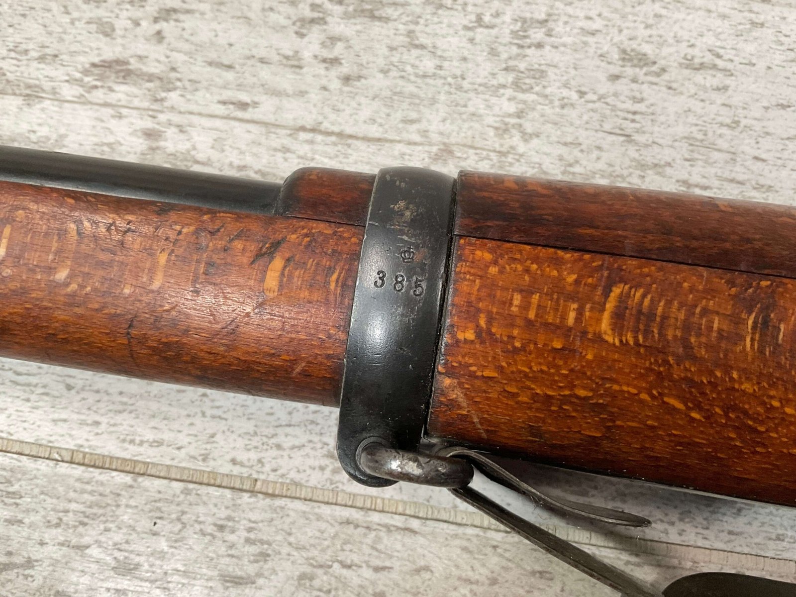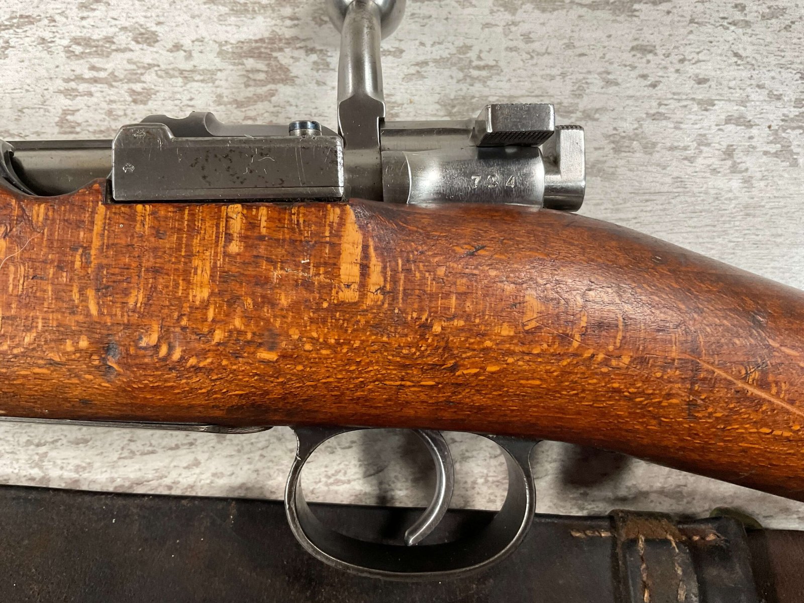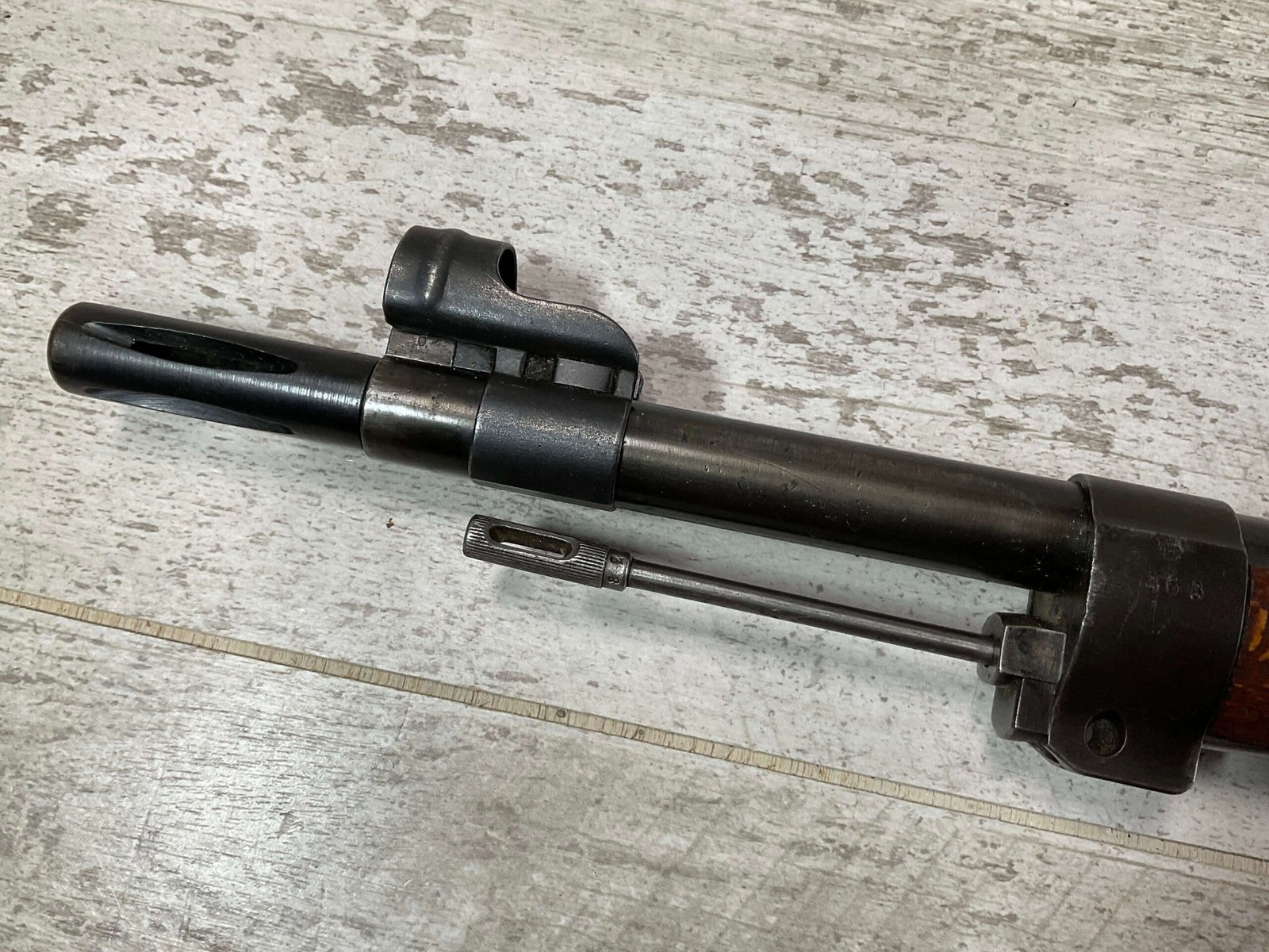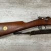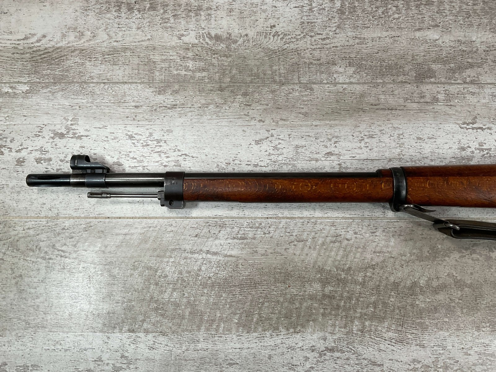CARL GUSTAF 1896 DATED 1912 BOLT ACTION RIFLE IN 6.5×55 #YT 301724, 29″ BBL, GOOD BRIGHT BORE W/EXC RIFLING & SOME LIGHT FROSTING, EXC STOCK W/LIGHT DINGS & SCRATCHES, SMOOTH BUTTPLATE, RECEIVER AND BOLT MATCHING, FRONT SIGHT BLADE W/HOOD, REAR ELEVATION ADJUSTABLE SIGHT, LEATHER SLING, THREADED BARREL W/COMPENSATOR, NON-MATCHING CORRECT CLEANING ROD, LIGHT IMPORT MARK ON RIGHT SIDE OF BARREL, 90+%