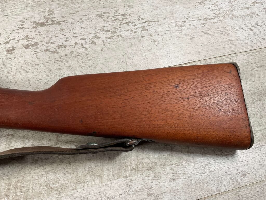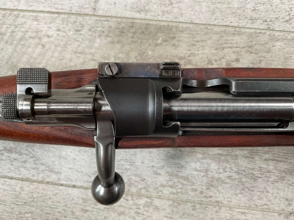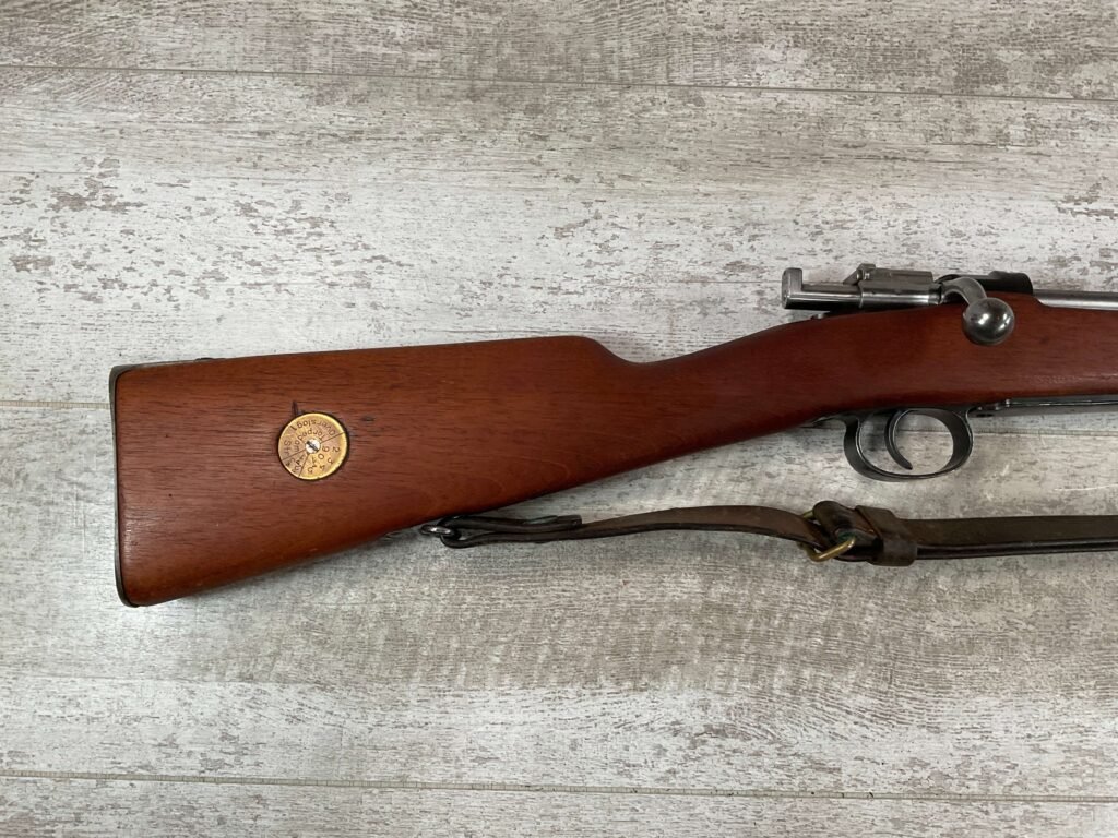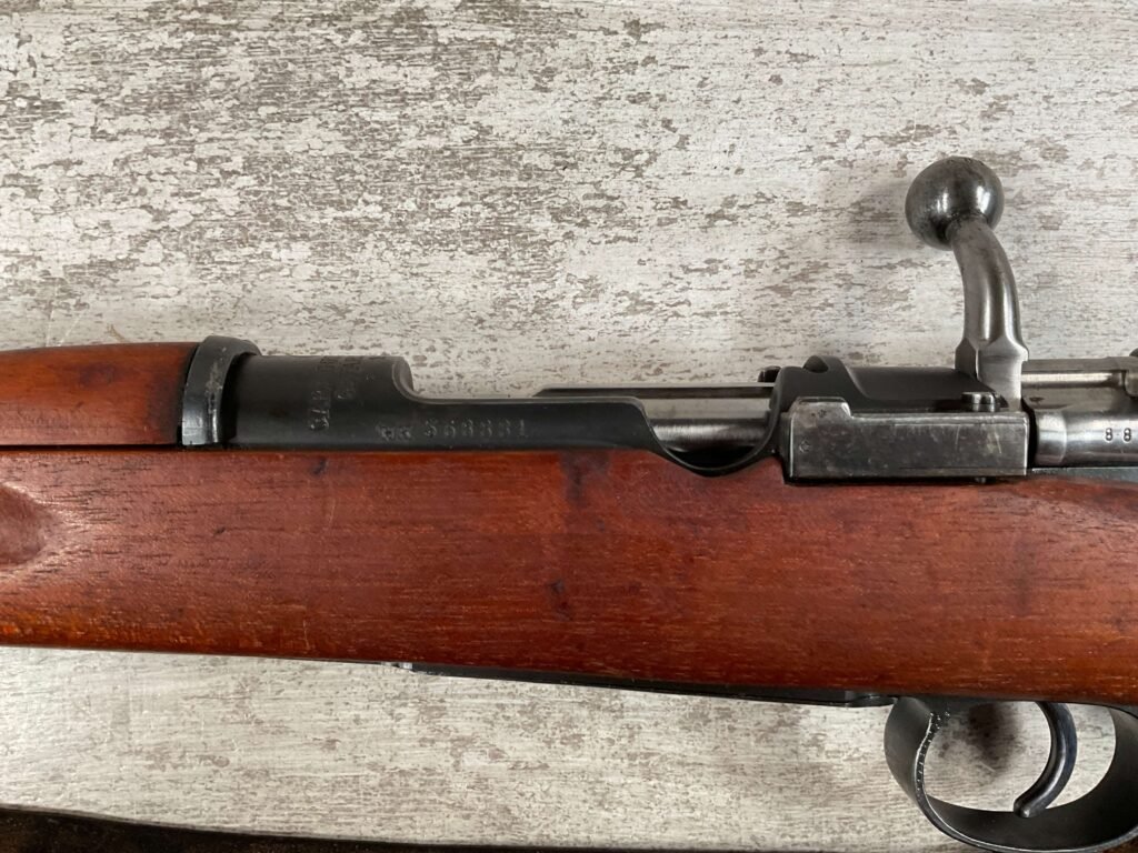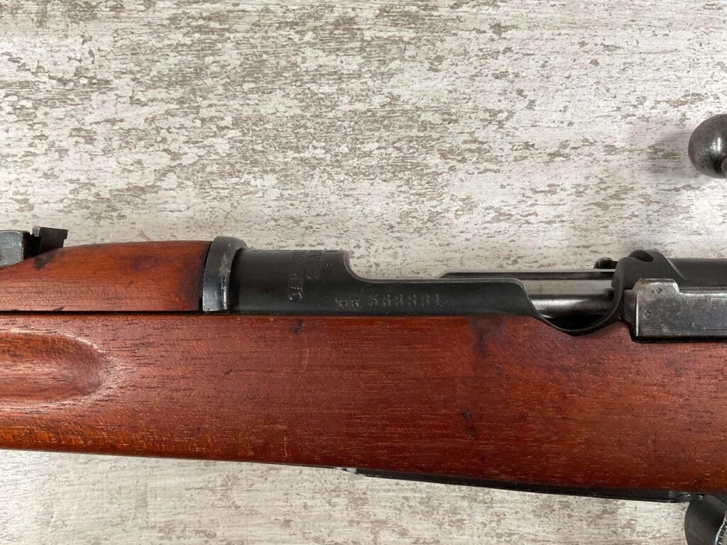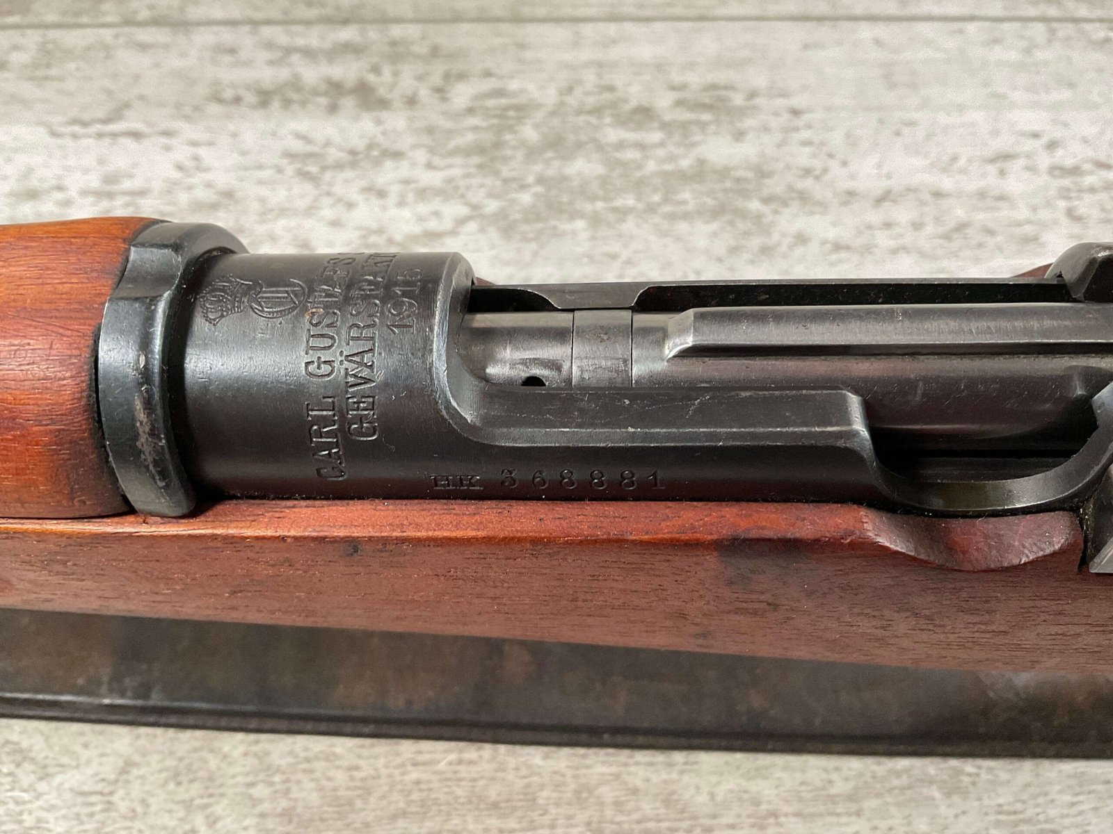 CARL GUSTAF 1896 DATED 1915 BOLT ACTION SHORT RIFLE IN 6.5×55 #HK 36881, 24″ BBL, GOOD BRIGHT BORE W/EXC RIFLING & SOME LIGHT FROSTING, EXC STOCK NICELY REFINISHED, SMOOTH BUTTPLATE, EVERYTHING MATCHING, FRONT SIGHT BLADE W/HOOD, REAR ELEVATION ADJUSTABLE SIGHT, LEATHER SLING, THREADED BARREL W/COMPENSATOR, NON-MARKED CORRECT CLEANING ROD, LIGHT IMPORT MARK ON RIGHT SIDE OF BARREL, 92+%