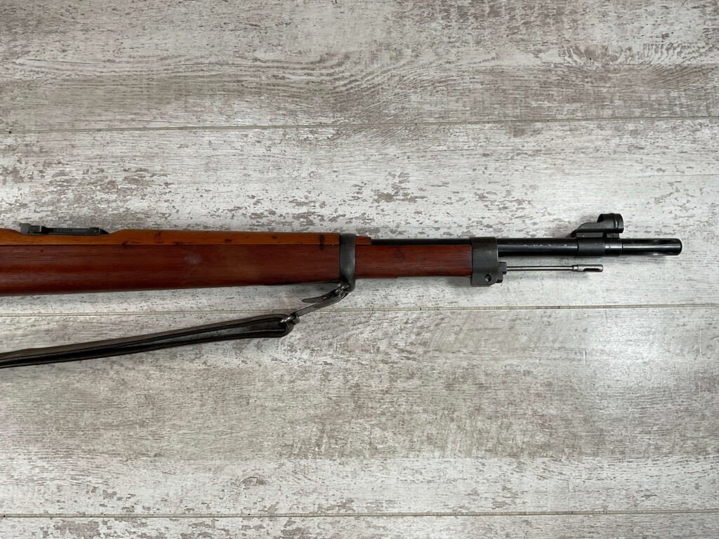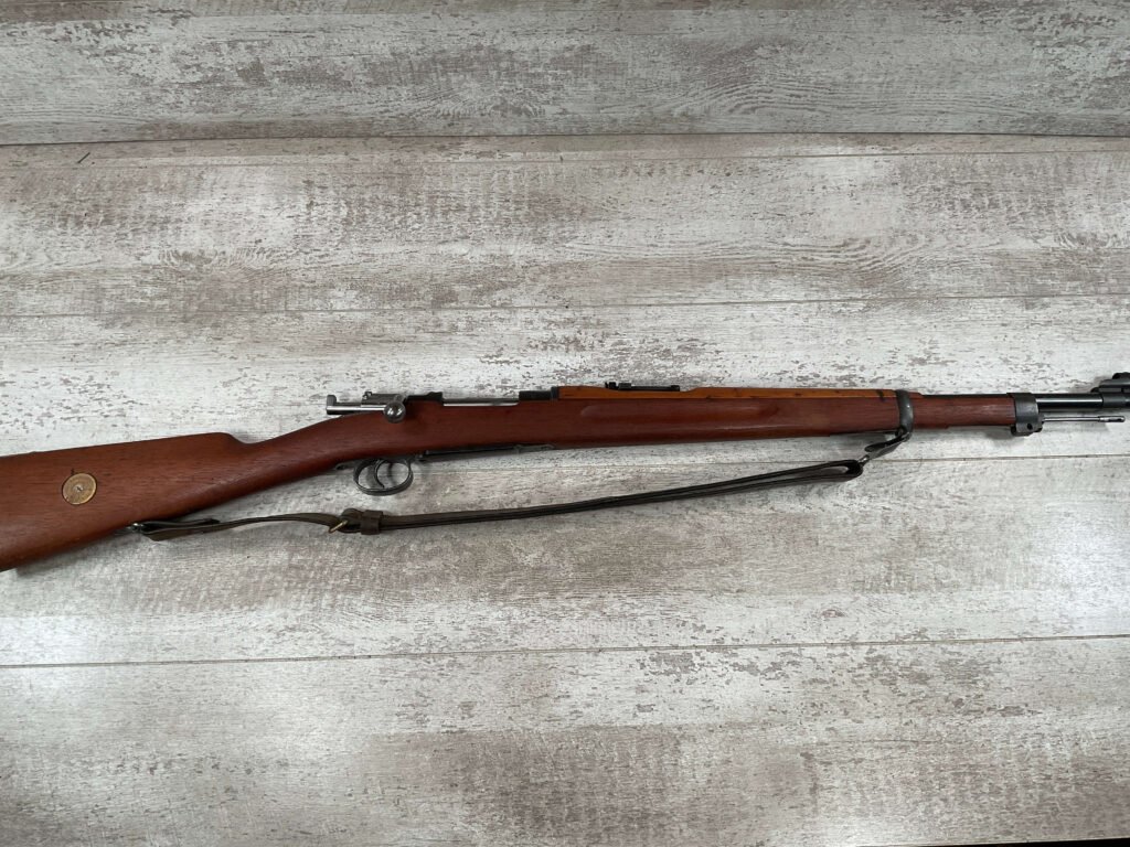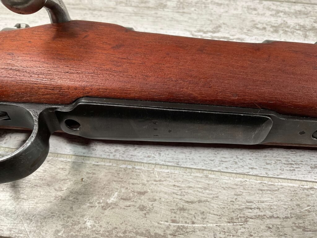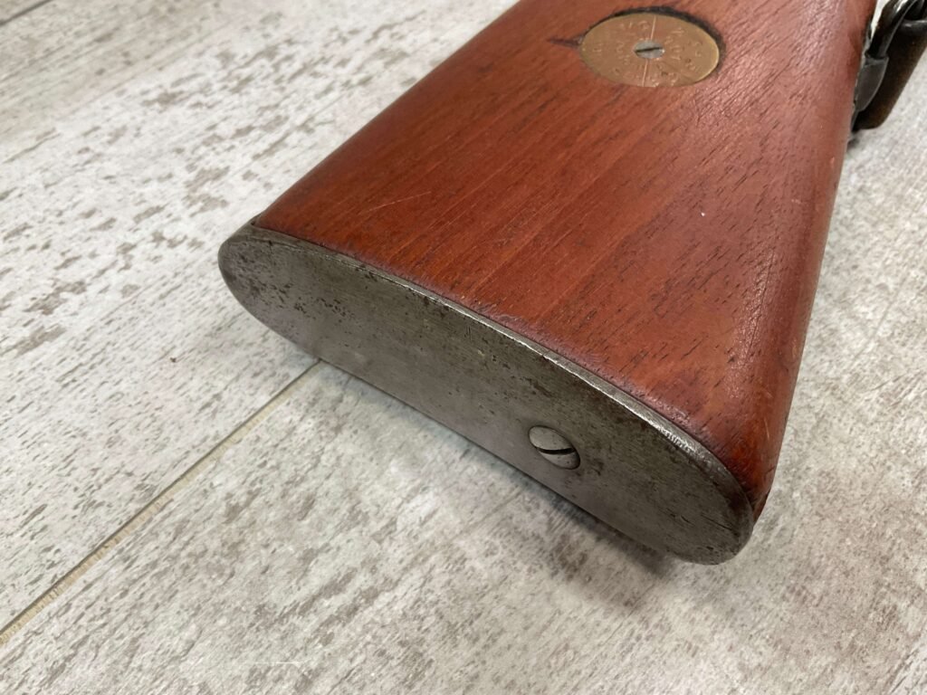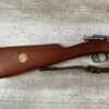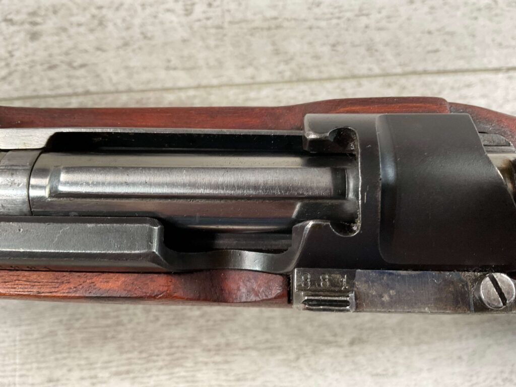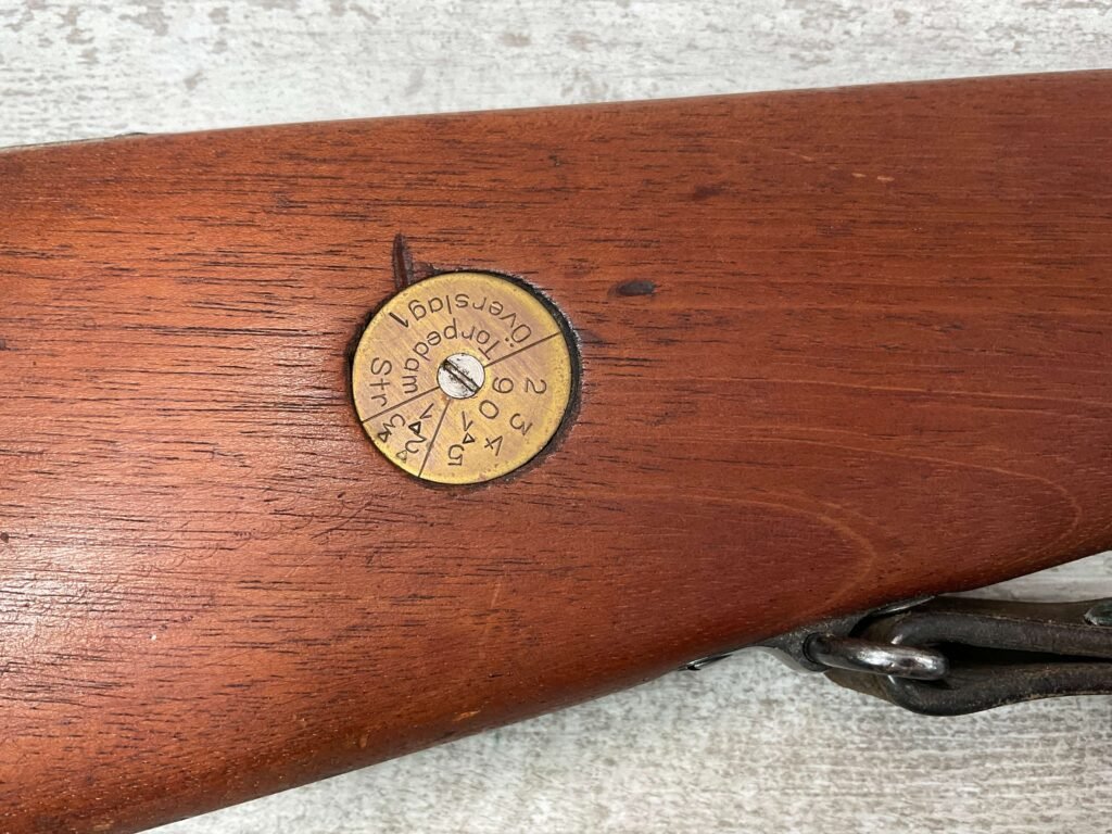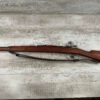 CARL GUSTAF 1896 DATED 1915 BOLT ACTION SHORT RIFLE IN 6.5×55 #HK 36881, 24″ BBL, GOOD BRIGHT BORE W/EXC RIFLING & SOME LIGHT FROSTING, EXC STOCK NICELY REFINISHED, SMOOTH BUTTPLATE, EVERYTHING MATCHING, FRONT SIGHT BLADE W/HOOD, REAR ELEVATION ADJUSTABLE SIGHT, LEATHER SLING, THREADED BARREL W/COMPENSATOR, NON-MARKED CORRECT CLEANING ROD, LIGHT IMPORT MARK ON RIGHT SIDE OF BARREL, 92+%