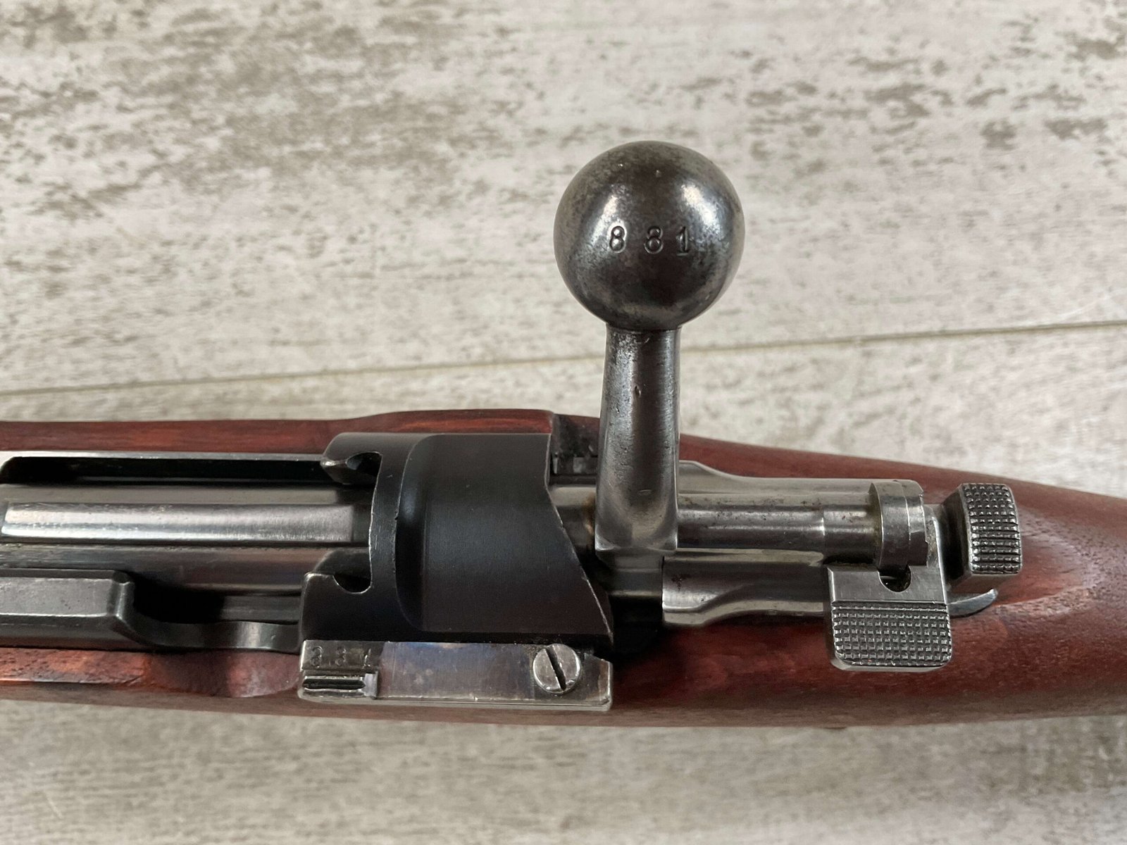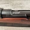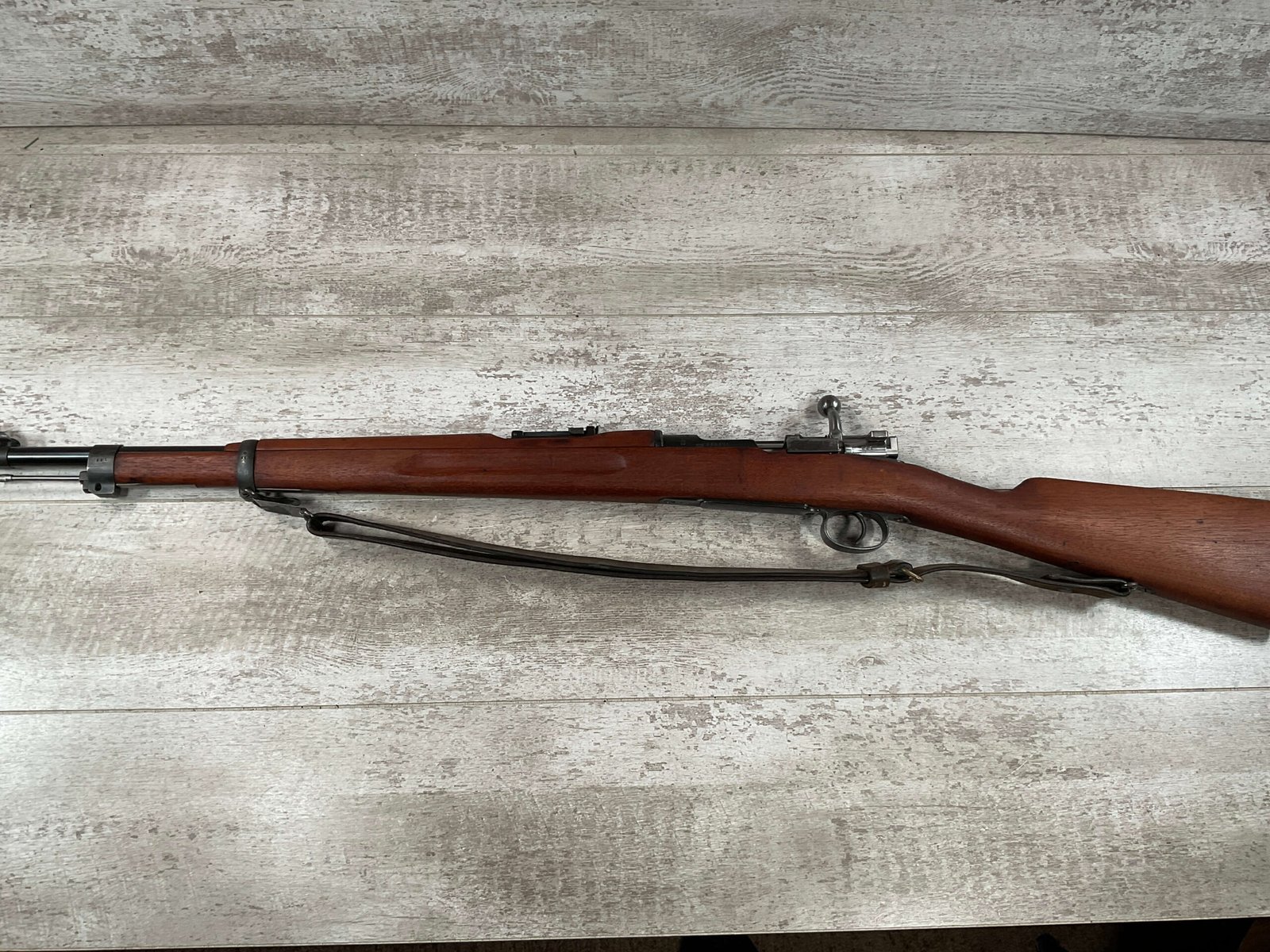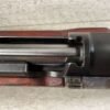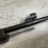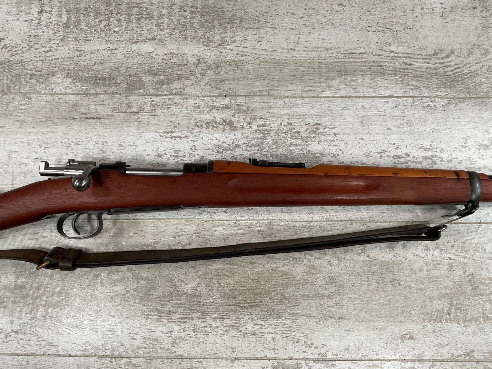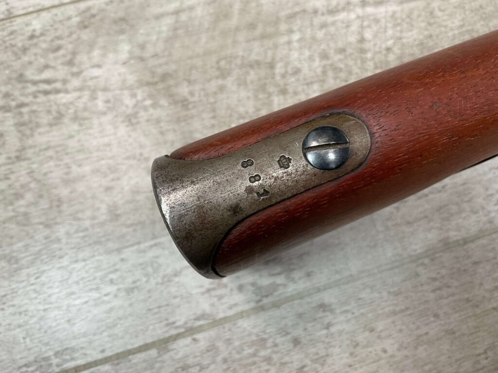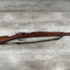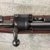 CARL GUSTAF 1896 DATED 1915 BOLT ACTION SHORT RIFLE IN 6.5×55 #HK 36881, 24″ BBL, GOOD BRIGHT BORE W/EXC RIFLING & SOME LIGHT FROSTING, EXC STOCK NICELY REFINISHED, SMOOTH BUTTPLATE, EVERYTHING MATCHING, FRONT SIGHT BLADE W/HOOD, REAR ELEVATION ADJUSTABLE SIGHT, LEATHER SLING, THREADED BARREL W/COMPENSATOR, NON-MARKED CORRECT CLEANING ROD, LIGHT IMPORT MARK ON RIGHT SIDE OF BARREL, 92+%