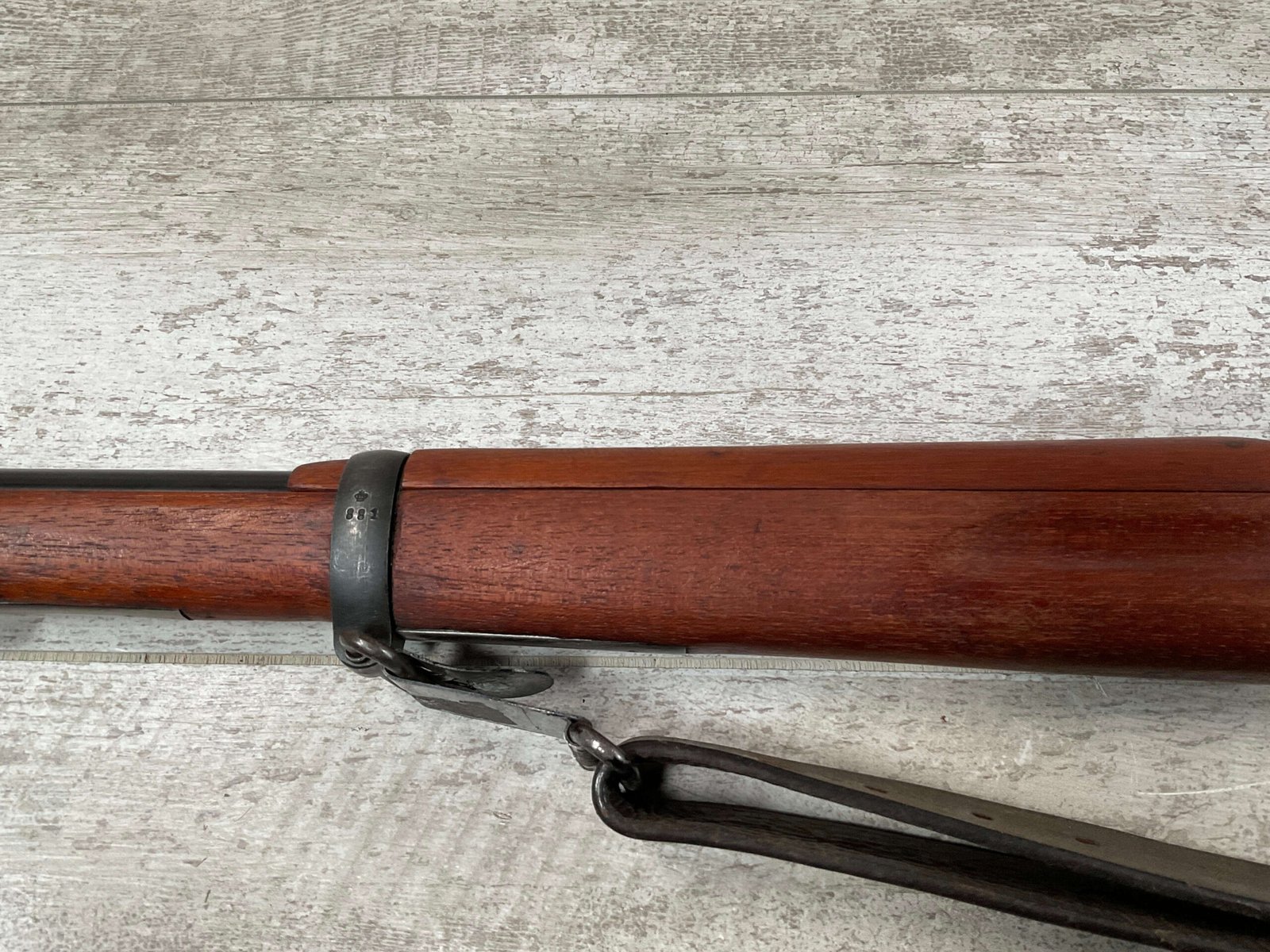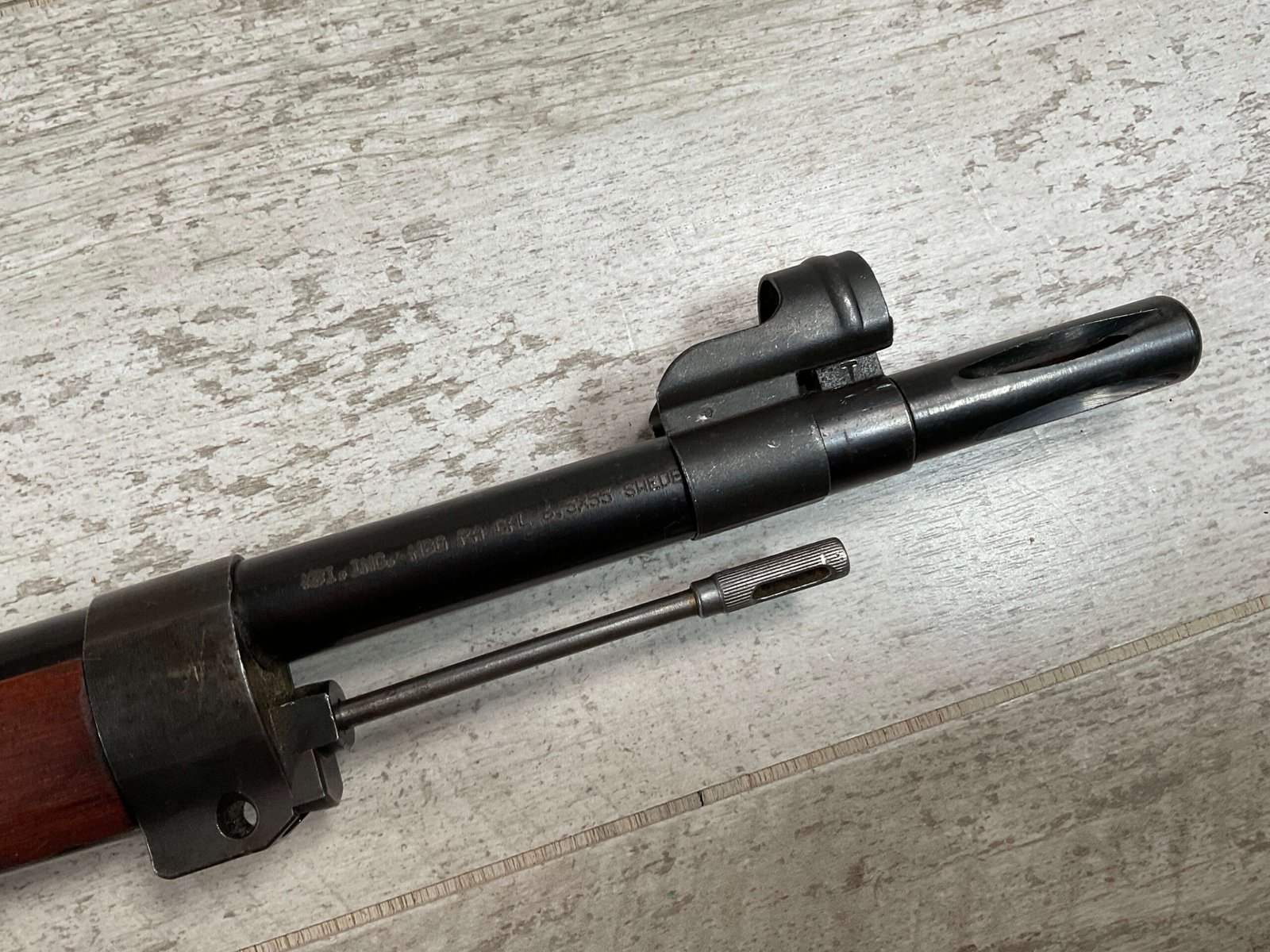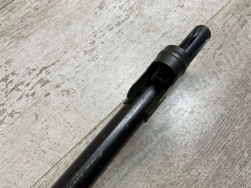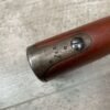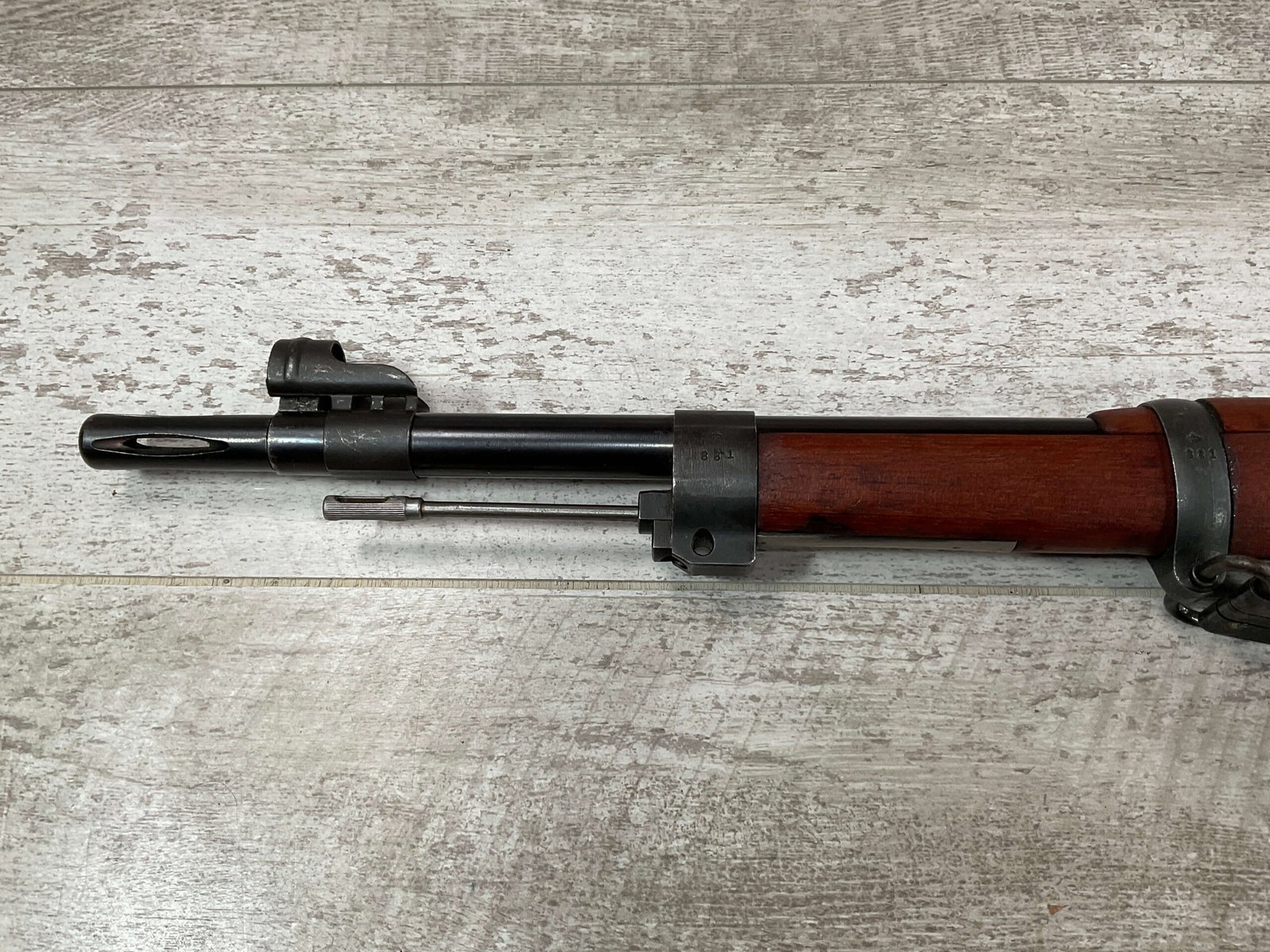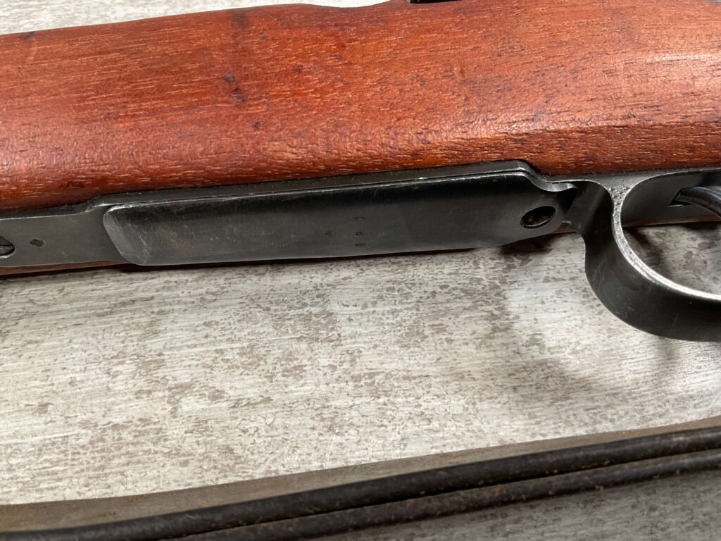 CARL GUSTAF 1896 DATED 1915 BOLT ACTION SHORT RIFLE IN 6.5×55 #HK 36881, 24″ BBL, GOOD BRIGHT BORE W/EXC RIFLING & SOME LIGHT FROSTING, EXC STOCK NICELY REFINISHED, SMOOTH BUTTPLATE, EVERYTHING MATCHING, FRONT SIGHT BLADE W/HOOD, REAR ELEVATION ADJUSTABLE SIGHT, LEATHER SLING, THREADED BARREL W/COMPENSATOR, NON-MARKED CORRECT CLEANING ROD, LIGHT IMPORT MARK ON RIGHT SIDE OF BARREL, 92+%