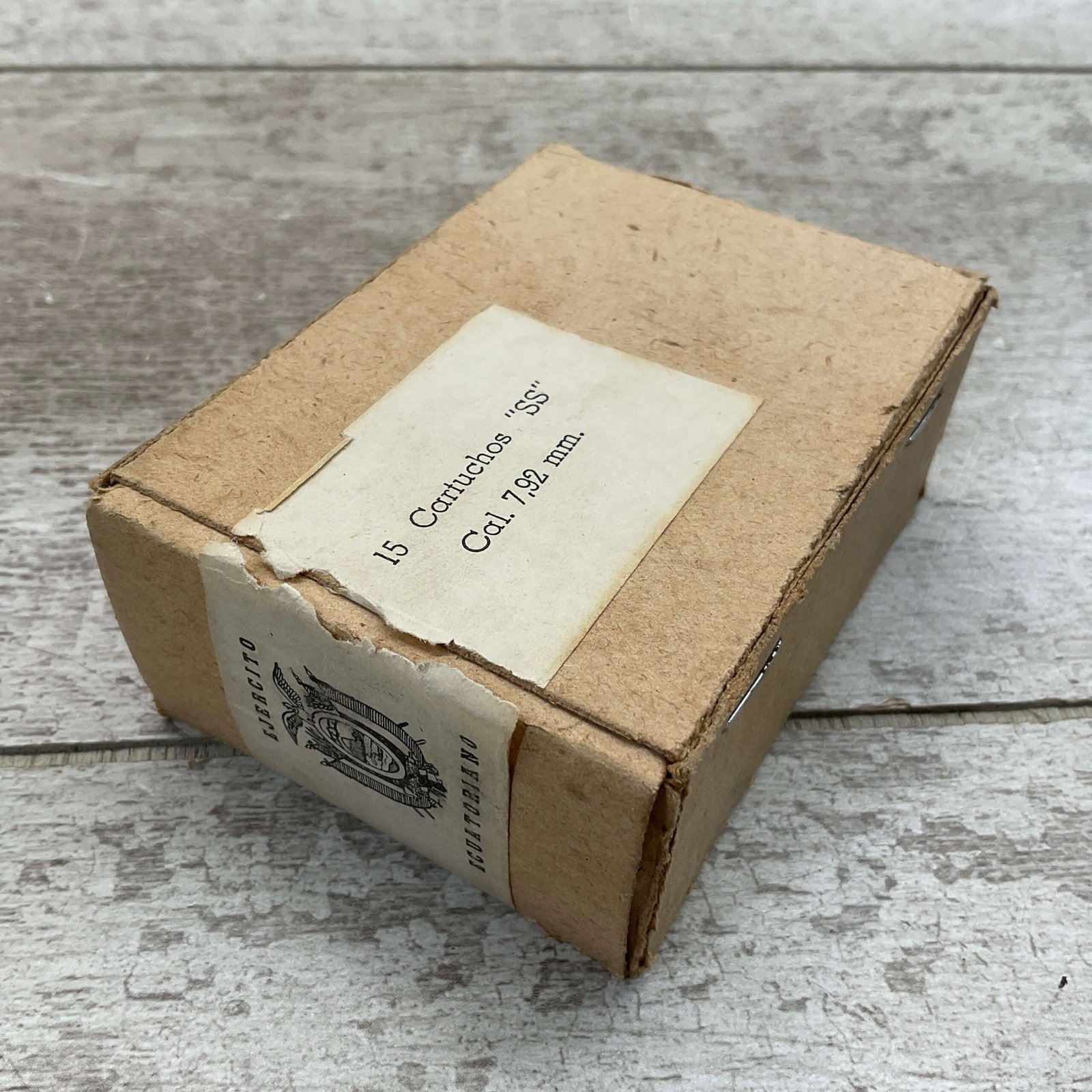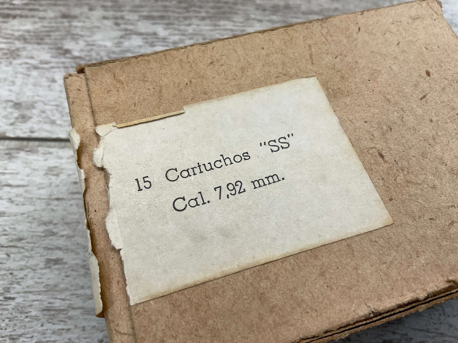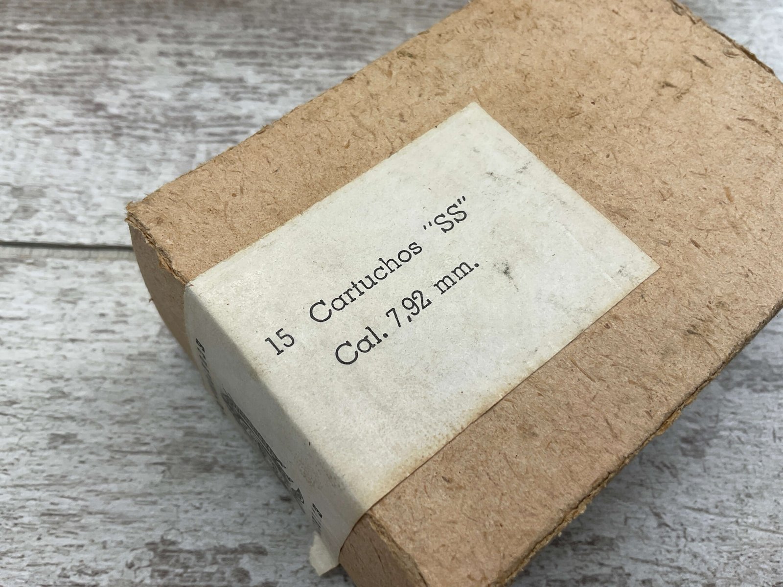 CARTUCHOS “SS” 7.92 CAL. 15 ROUNDS PER BOX SET IN 3 ZIPPER STRIPS, BOXES STAMPED WITH EJERCITO OVER ECUATORIANO, BOXES ARE IN EXCELLENT CONDITION.