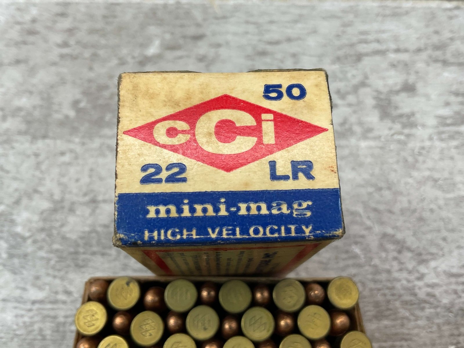 CCI MINI-MAG .22LR HIGH VELOCITY AMMO, FULL BOX, VINTAGE, BOX IS IN DECENT CONDITION WITH SOME DISCOLORATION AND WEAR, STILL FUNCTIONS WELL.