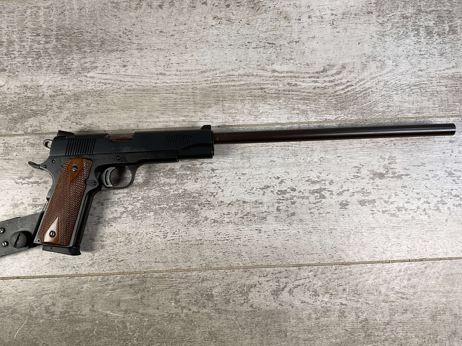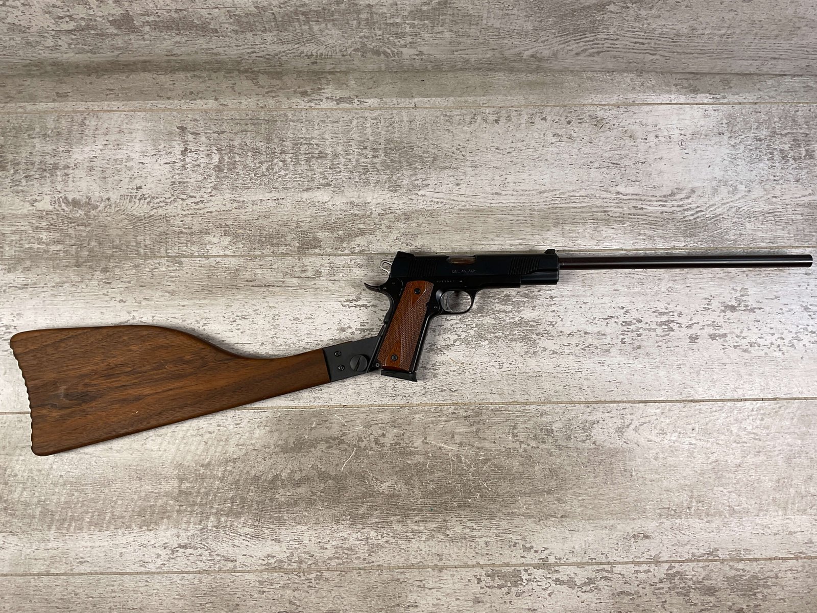CHARLES DALY 1911A1 45ACP SEMI AUTO RIFLE/PISTOL, JAMES EARL JONES COLLECTION #CD013647, 16.2″ BARREL, EXC BORE & RIFLING, EXC LIKE NEW CONDITION, EXC WOODEN STOCK W/VIRTUALY NO SIGNS OF USE, 1 SINGLE STACK MAGAZINE, CONDITION AS SHOWN IN PICUTRES, FROM THE JAMES EARL JONES “FAVORITES” COLLECTION W/ CERTIFICATE OF AUTHENTICITY.