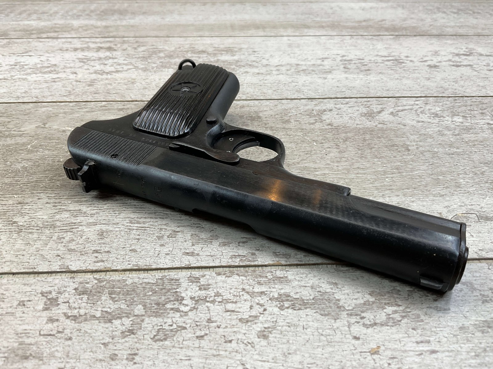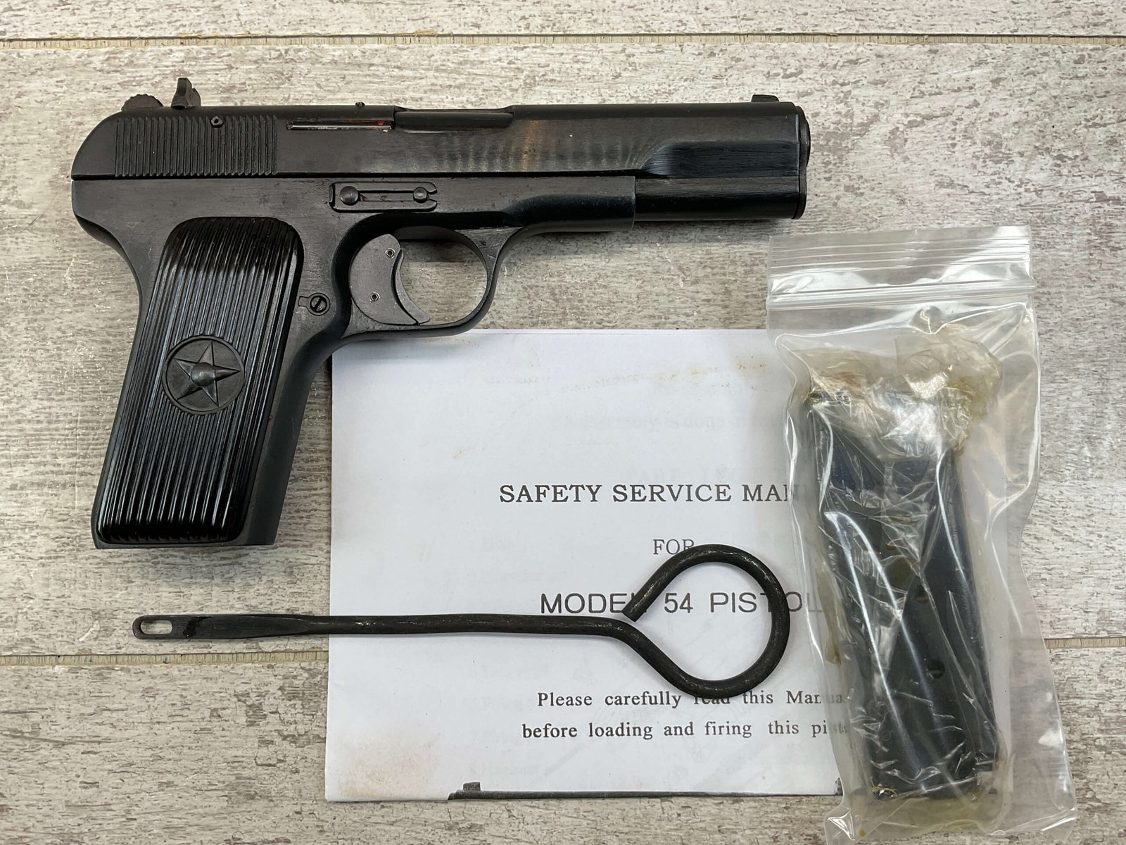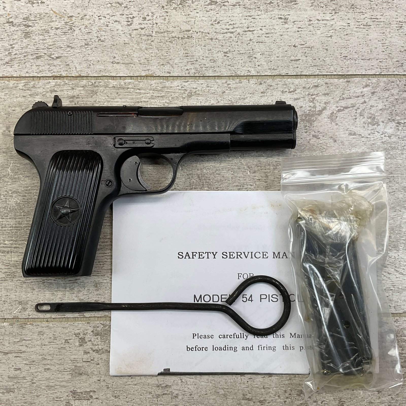 CHINESE TYPE 54 7.62X25(.30) FULL MILITARY, 1959 DATE, MATCHING FRAME/SLIDE/BARREL, HAND SELECT, EXC. GRIPS, EXC. BORE, RECENT IMPORT, TASTEFUL GLOCK-TYPE TRIGGER SAFETY, IN BOX W/CLEANING ROD & MANUAL, EXC. CONDITION, C&R OK (ADD $25 FOR EXC. EXTRA MAG)($10 EXTRA FOR 16RD.BX. BULK AMMO)