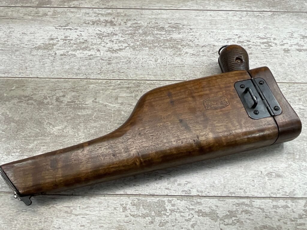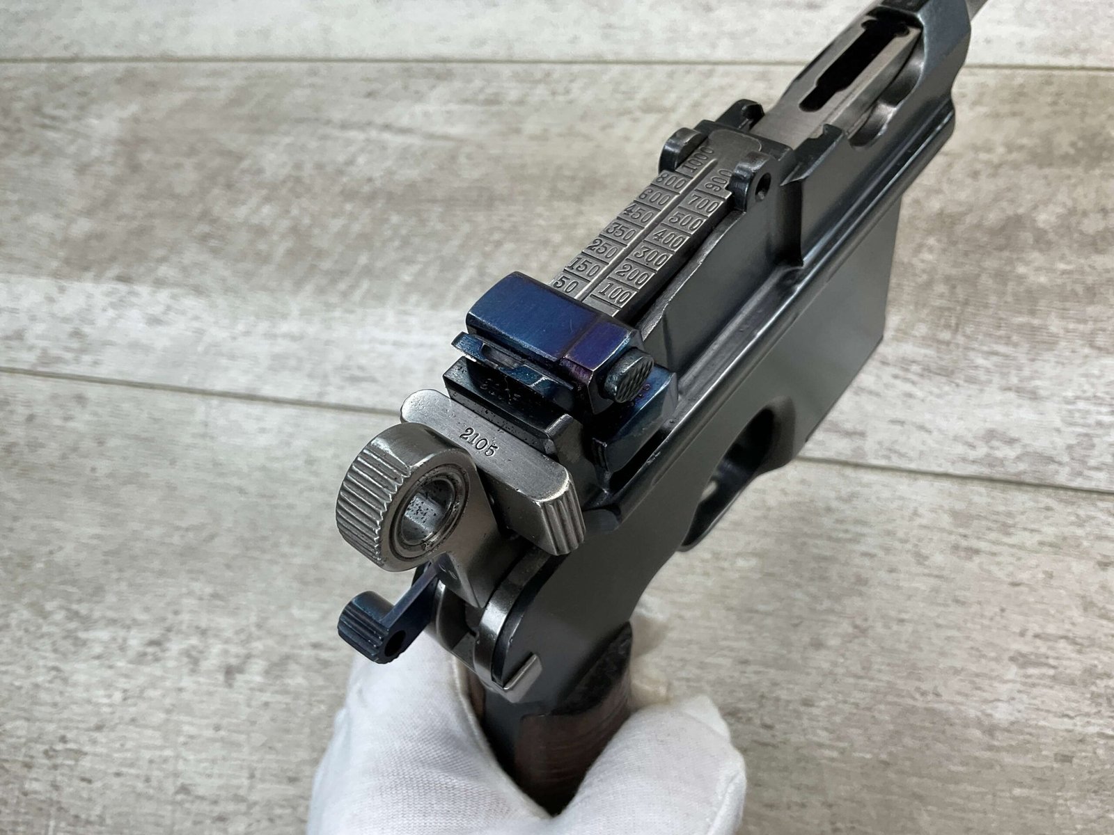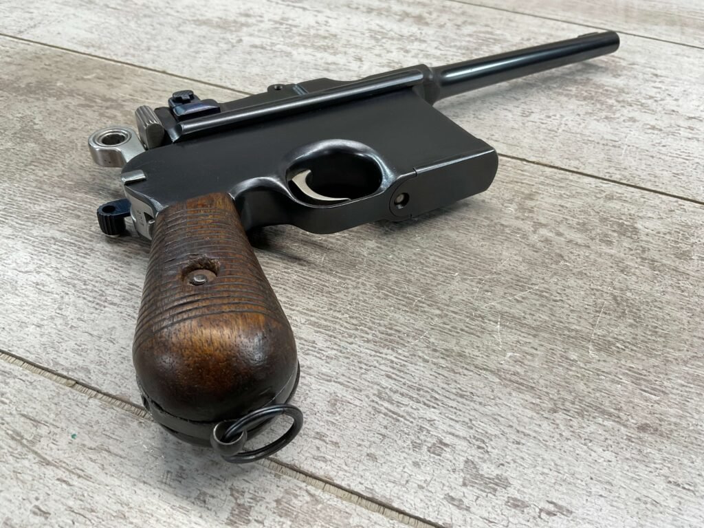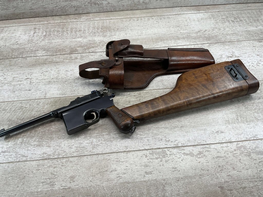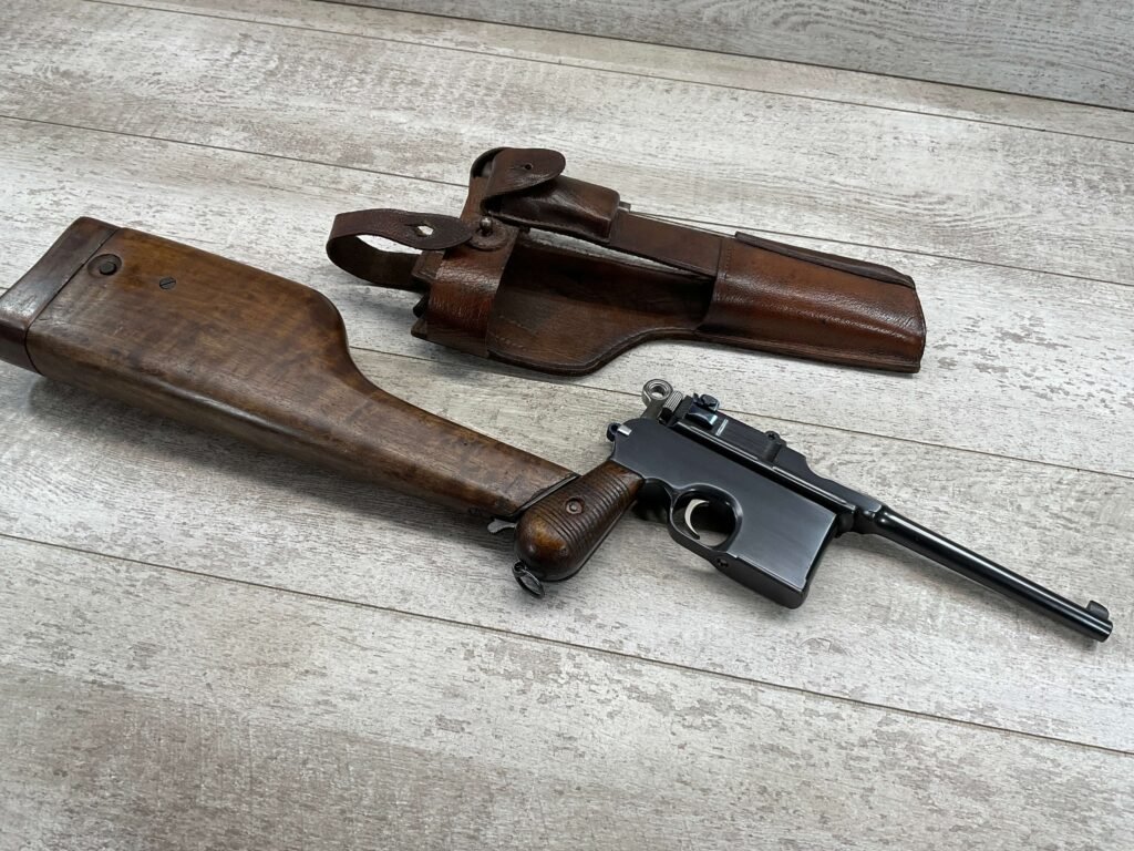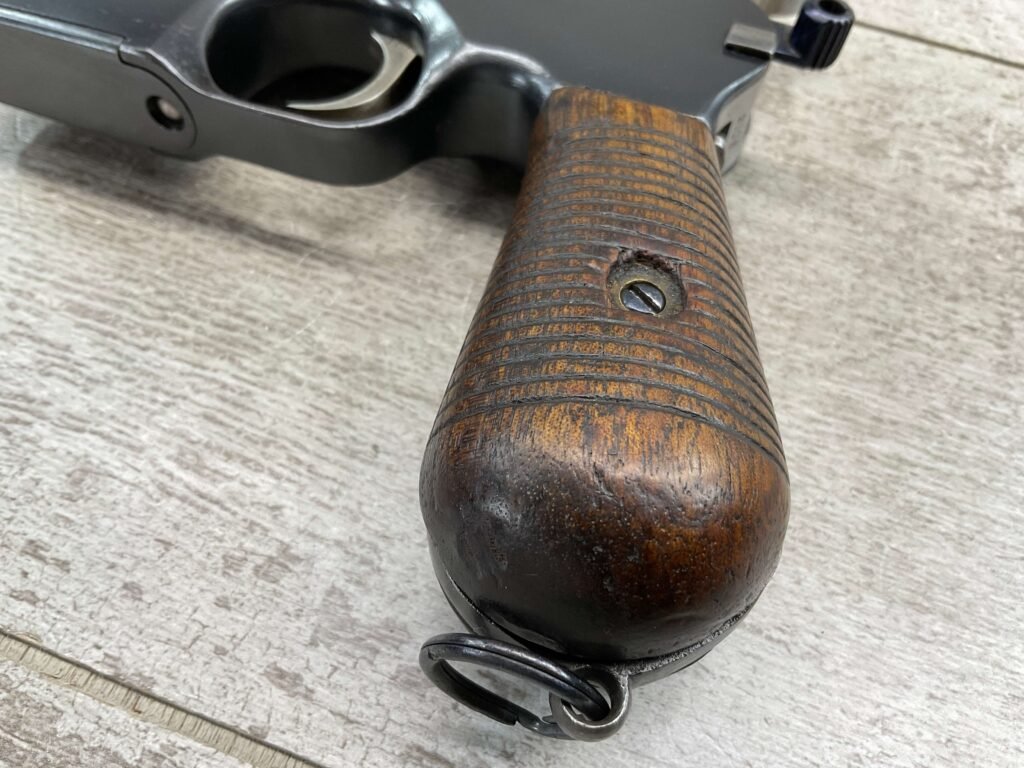 CHINESE TAKU NAVAL DOCKYARD C96 LARGE RING FLATSIDE PISTOL RIG, MATCHING #2105, 5.5″ BARREL, 98%+ BLUE, VG WOODEN GRIPS (UNMARKED) W/19 GROOVES, 50-1000 GRADUATED REAR SIGHT W/FIXED FRONT SIGHT, CHAMBER MARKED “TAKU NAVAL/DOCKYARD”, NO WAVES IN FINISH & HAS BEEN PROFESSIONALLY RESTORED, DARKER BORE W/ LIGHT FROSTING, 7.63mm, MAUSER BANNER MARKED WOODEN STOCK IN EXC CONDITION & FITS THE FIREARM PERFECTLY, LEATHER ALSO EXCELLENT, ORIGINAL CLEANING ROD INCLUDED, LANYARD RING, NOT SURE YOU’LL FIND ANOTHER IN THIS CONDITION!! GREAT INVESTMENT PIECE