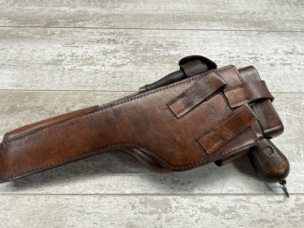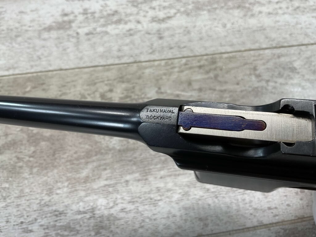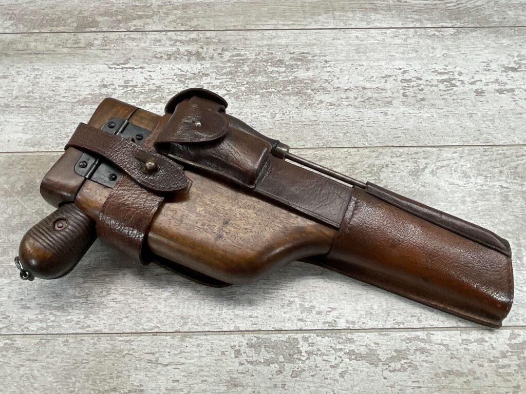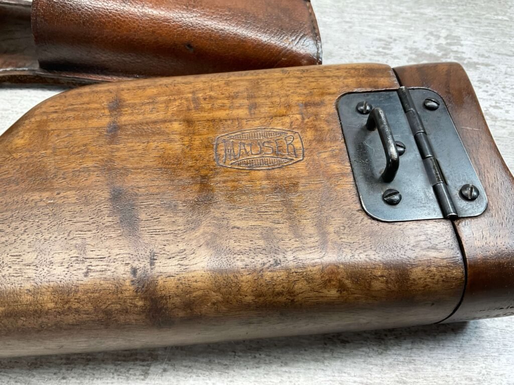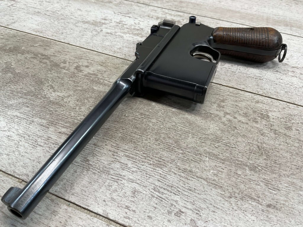 CHINESE TAKU NAVAL DOCKYARD C96 LARGE RING FLATSIDE PISTOL RIG, MATCHING #2105, 5.5″ BARREL, 98%+ BLUE, VG WOODEN GRIPS (UNMARKED) W/19 GROOVES, 50-1000 GRADUATED REAR SIGHT W/FIXED FRONT SIGHT, CHAMBER MARKED “TAKU NAVAL/DOCKYARD”, NO WAVES IN FINISH & HAS BEEN PROFESSIONALLY RESTORED, DARKER BORE W/ LIGHT FROSTING, 7.63mm, MAUSER BANNER MARKED WOODEN STOCK IN EXC CONDITION & FITS THE FIREARM PERFECTLY, LEATHER ALSO EXCELLENT, ORIGINAL CLEANING ROD INCLUDED, LANYARD RING, NOT SURE YOU’LL FIND ANOTHER IN THIS CONDITION!! GREAT INVESTMENT PIECE
