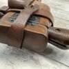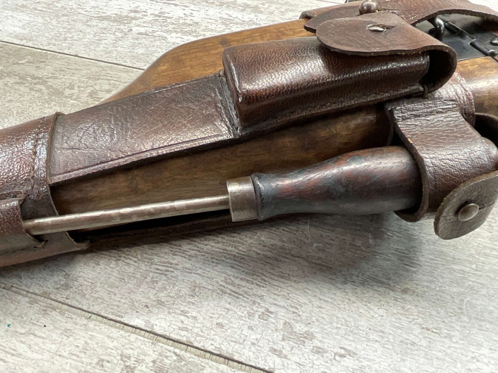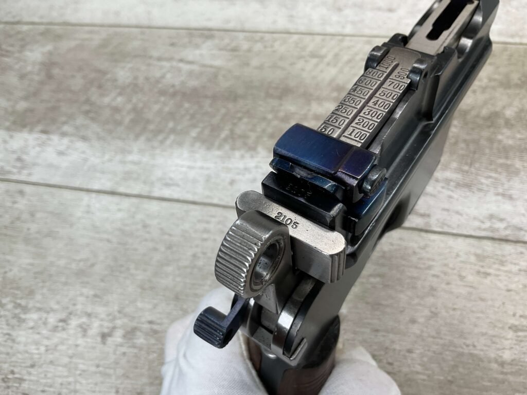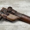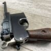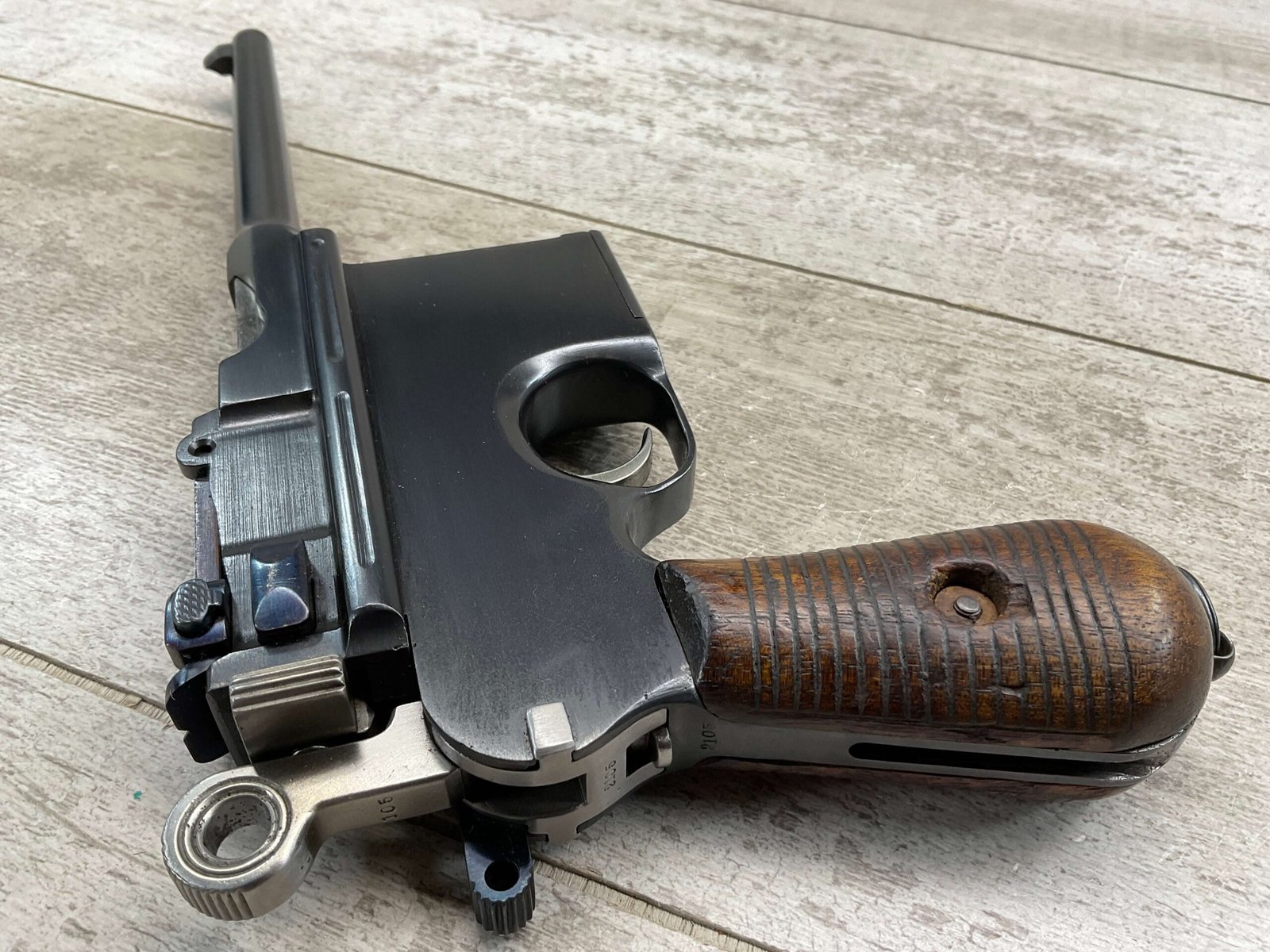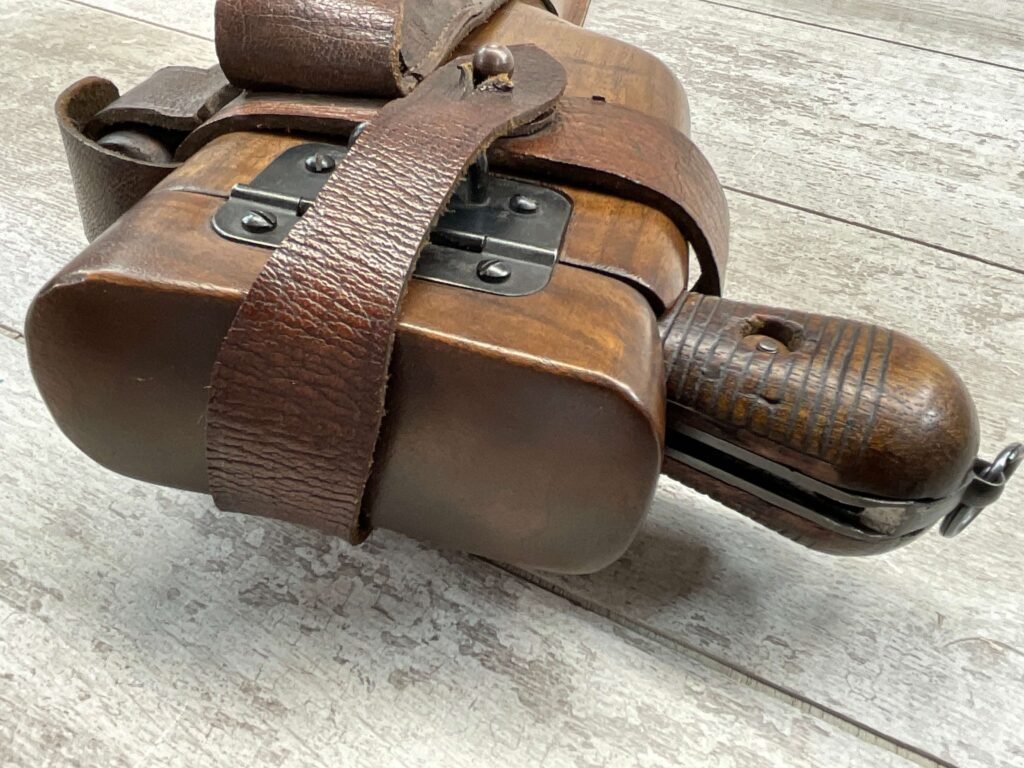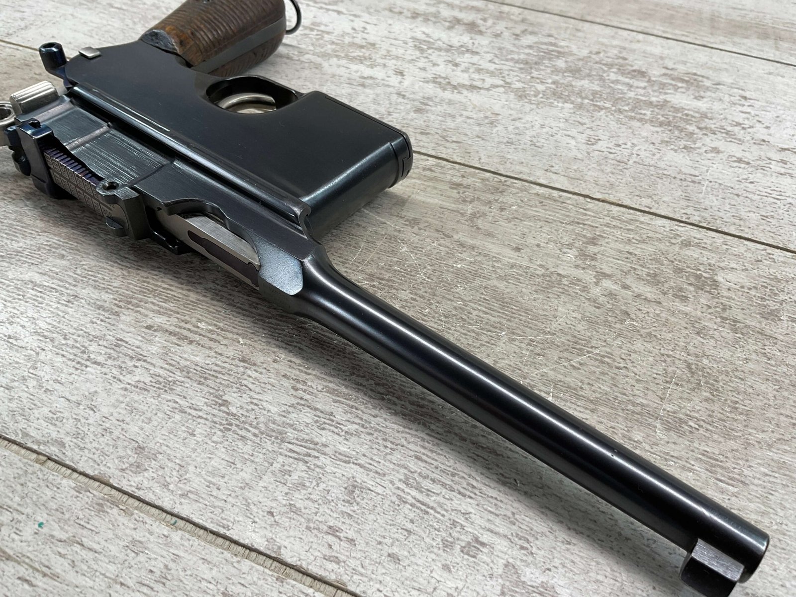 CHINESE TAKU NAVAL DOCKYARD C96 LARGE RING FLATSIDE PISTOL RIG, MATCHING #2105, 5.5″ BARREL, 98%+ BLUE, VG WOODEN GRIPS (UNMARKED) W/19 GROOVES, 50-1000 GRADUATED REAR SIGHT W/FIXED FRONT SIGHT, CHAMBER MARKED “TAKU NAVAL/DOCKYARD”, NO WAVES IN FINISH & HAS BEEN PROFESSIONALLY RESTORED, DARKER BORE W/ LIGHT FROSTING, 7.63mm, MAUSER BANNER MARKED WOODEN STOCK IN EXC CONDITION & FITS THE FIREARM PERFECTLY, LEATHER ALSO EXCELLENT, ORIGINAL CLEANING ROD INCLUDED, LANYARD RING, NOT SURE YOU’LL FIND ANOTHER IN THIS CONDITION!! GREAT INVESTMENT PIECE