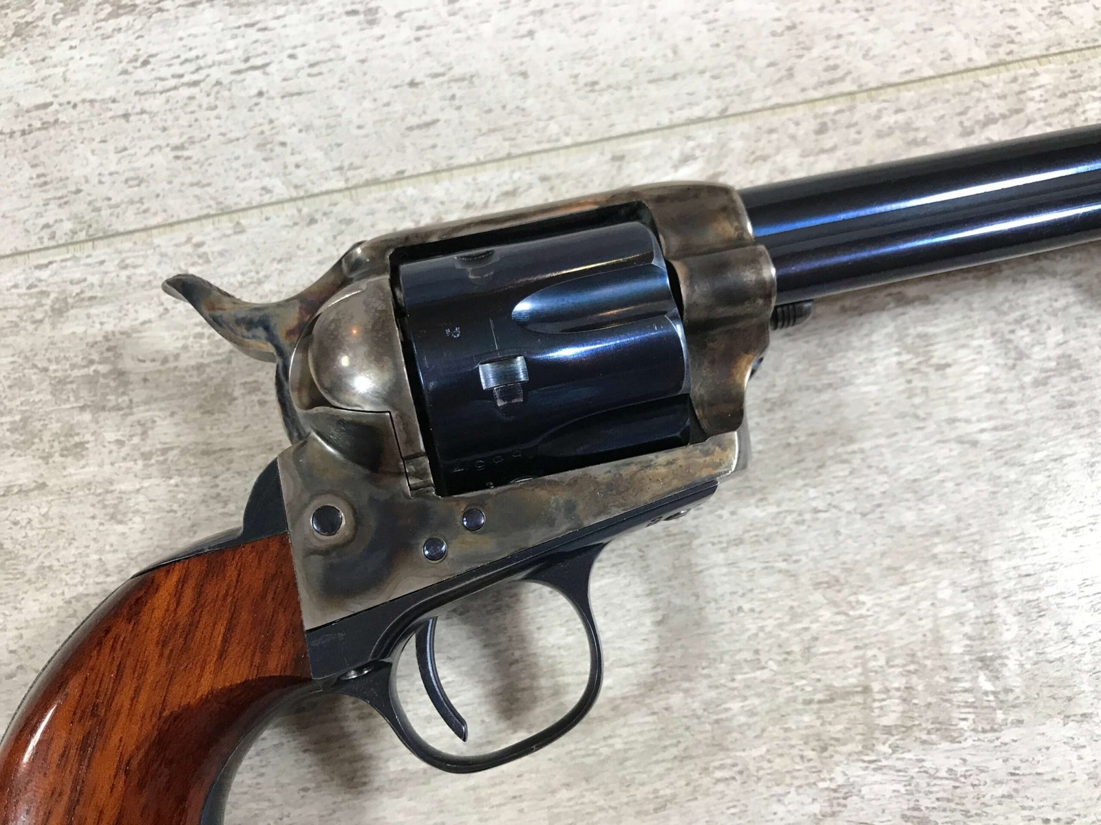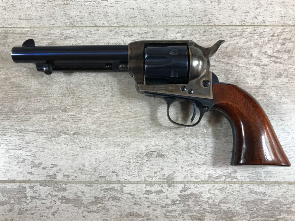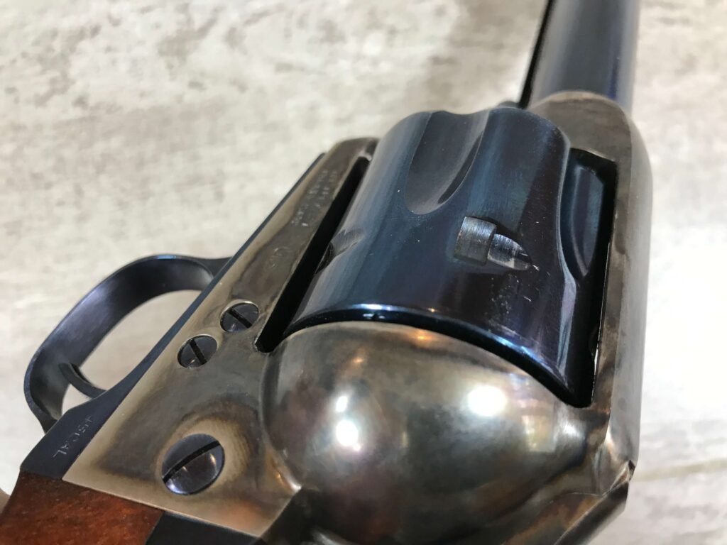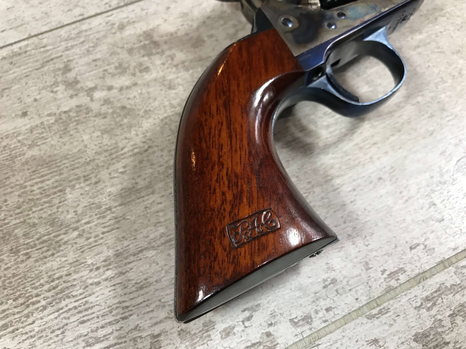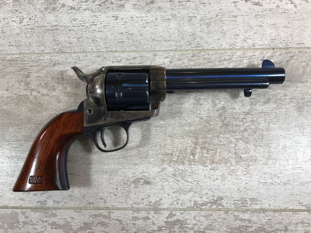 SKU#110 CIMARRON P-MODEL .45LC FS REVOLVER #C126857 CC/CHARCOAL BL WALNUT, 5.5″ BARREL, 6 SHOT, CASE COLOR HARDENED FRAME, CHARCOAL BLUED BARREL, PAC MARKING ON RIGHT GRIP, 98%