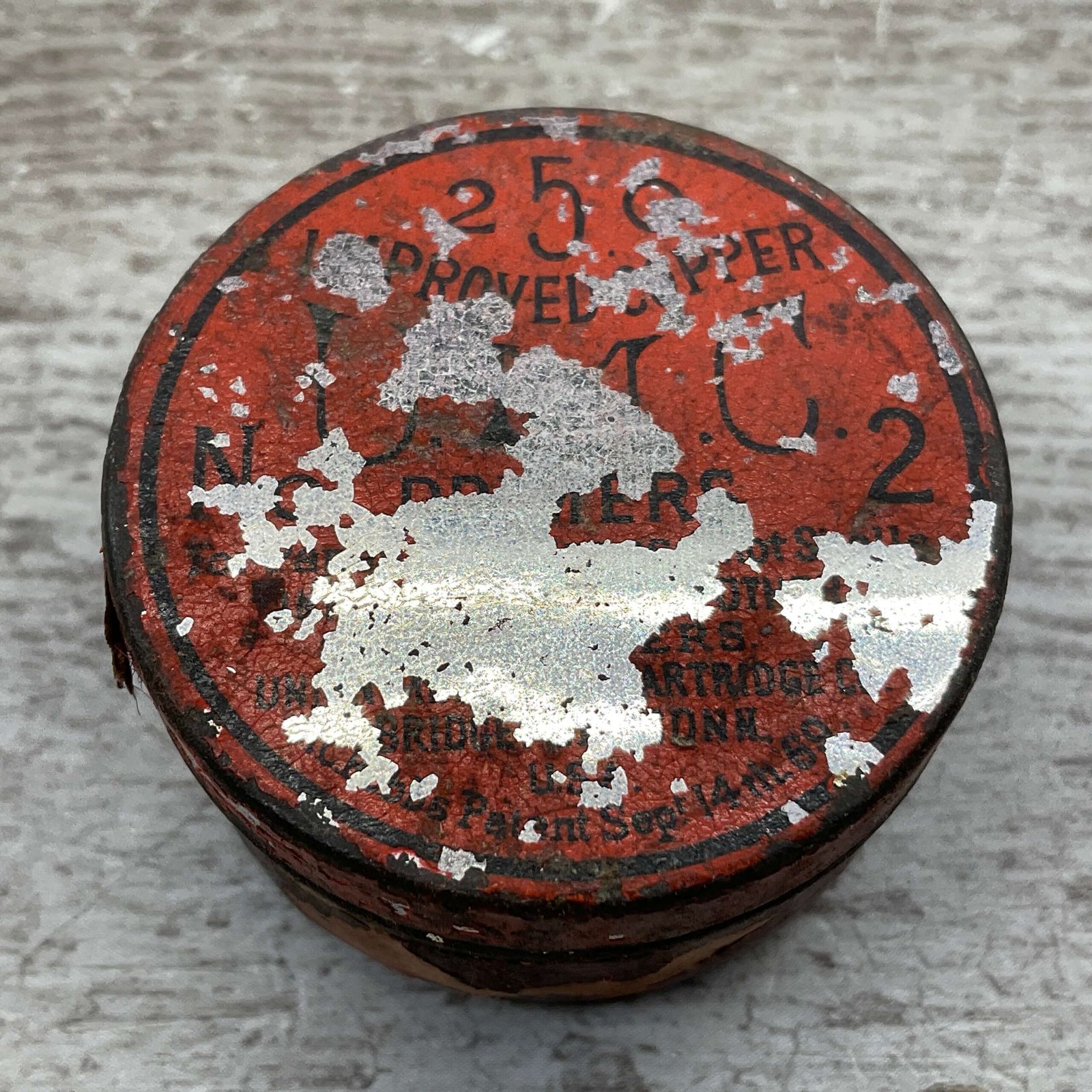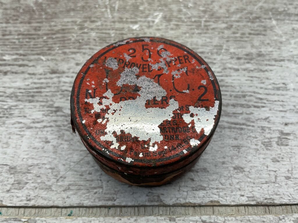 CIVIL WAR ERA UMC NO. 2 PRIMERS TIN, FULL, VINTAGE #5-03013-1-PF, HAS PAINT LOSS AND IS CONTINUING TO LOSE THE PAINT IN CLEAR SLEEVE. OVERALL NICE CONDITION.
