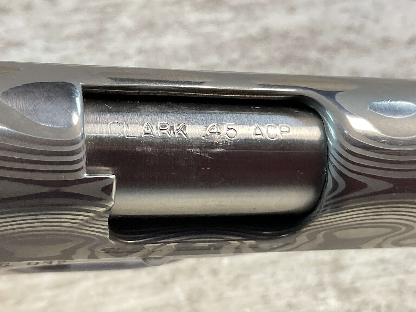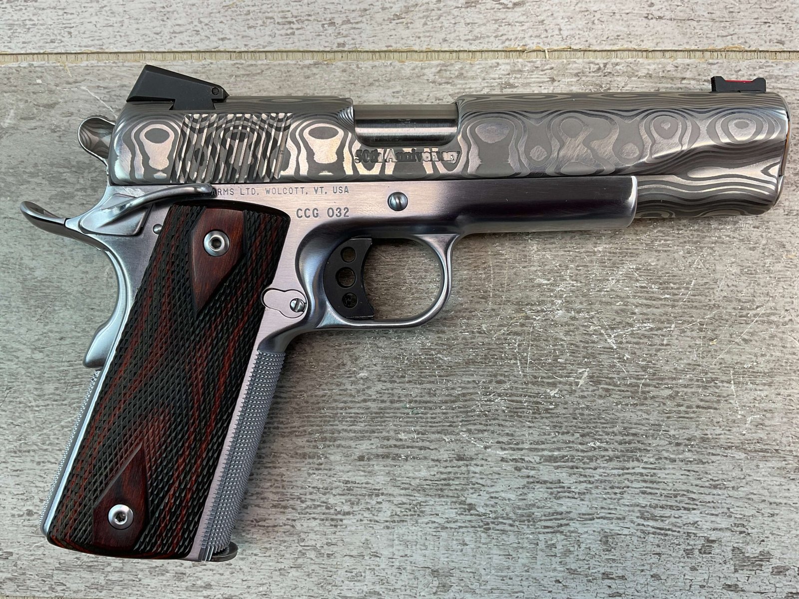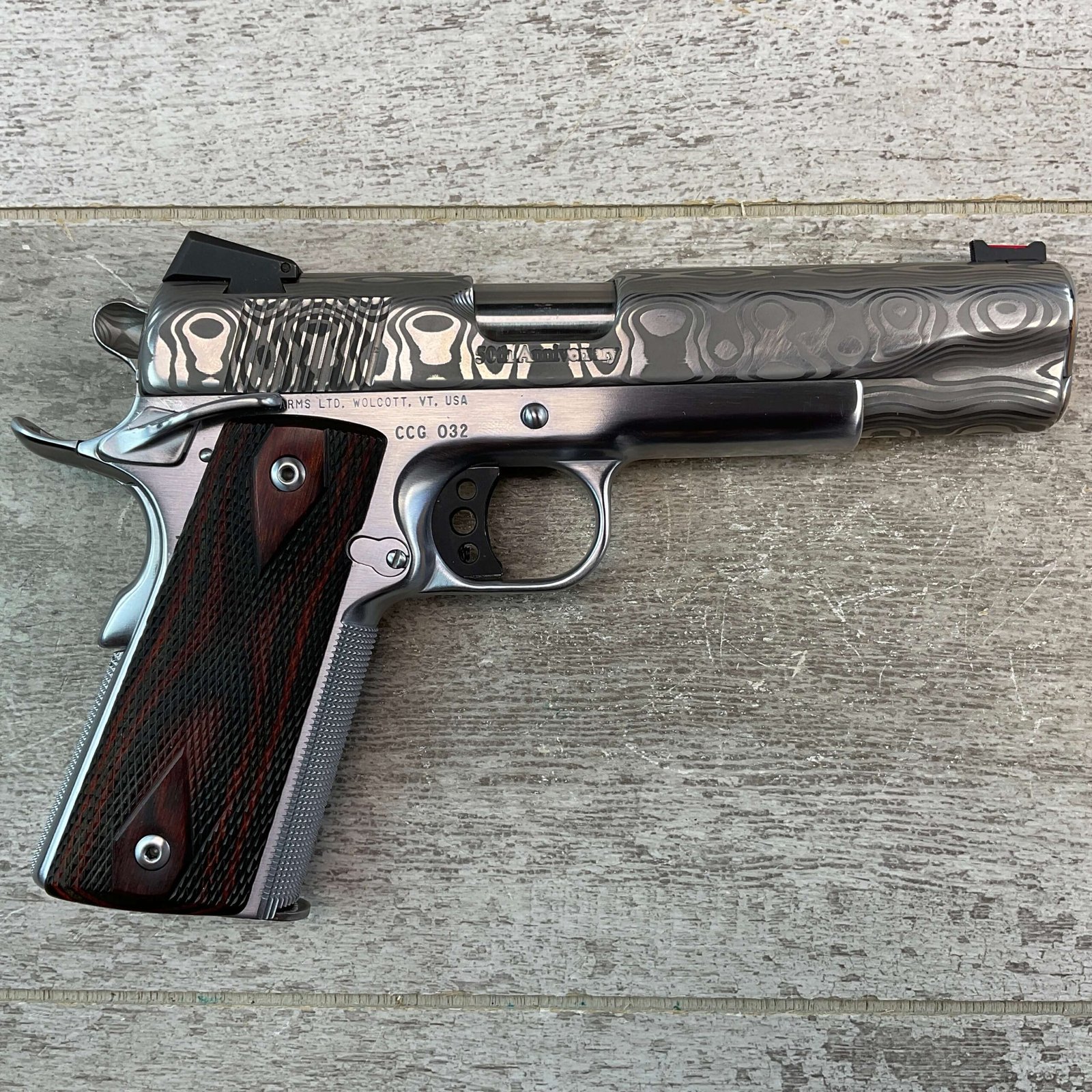 CLARK CUSTOM 50TH ANNIVERSARY MILLENNIUM MELTDOWN .45ACP SEMI AUTO PISTOL, JAMES EARL JONES COLLECTION #CCG-032, 5″ BARREL, MATCH BARREL, DAMASCUS SLIDE, DAMASCUS HAMMER, LO MOUNT NOVAK REAR SIGHT, FIBER FRONT SIGHT, KING AMBI EXTENDED THUMB SAFETY, KING BLACK LONG LITE TRIGGER, DOUBLE DIAMOND CHECKERED GRIPS, ACCURACY & TRIGGER JOB, HARD CHROMED LOWER, VERY CUSTOM & ONLY 50 MADE!!, CONDITION AS SHOWN IN PICTURES, FROM THE JAMES EARL JONES “FAVORITES” COLLECTION W/ CERTIFICATE OF AUTHENTICITY.