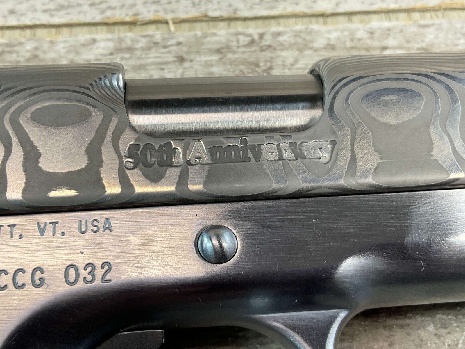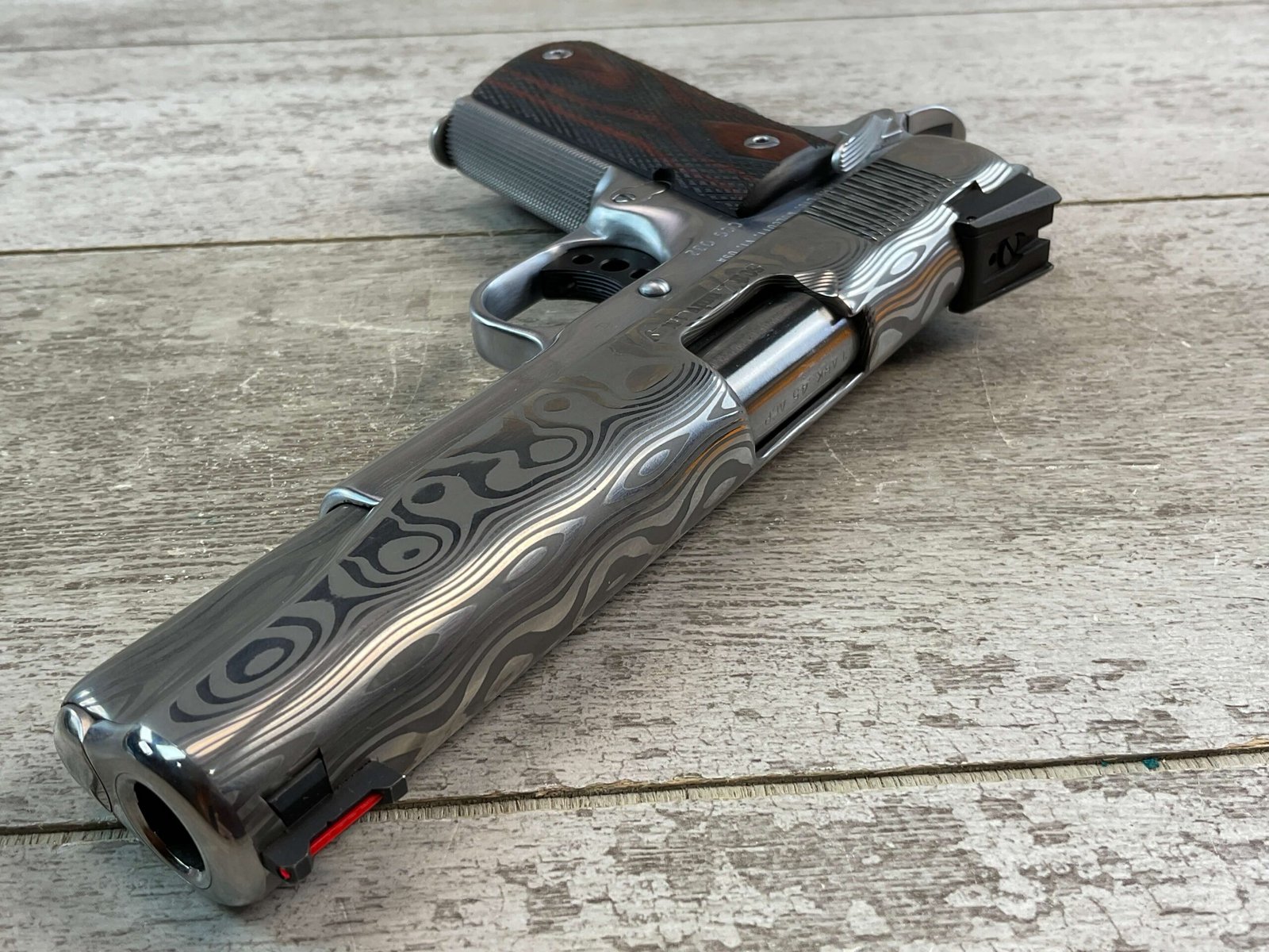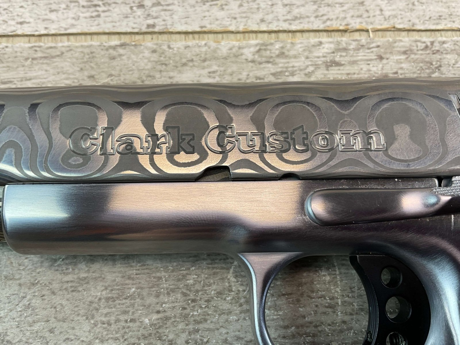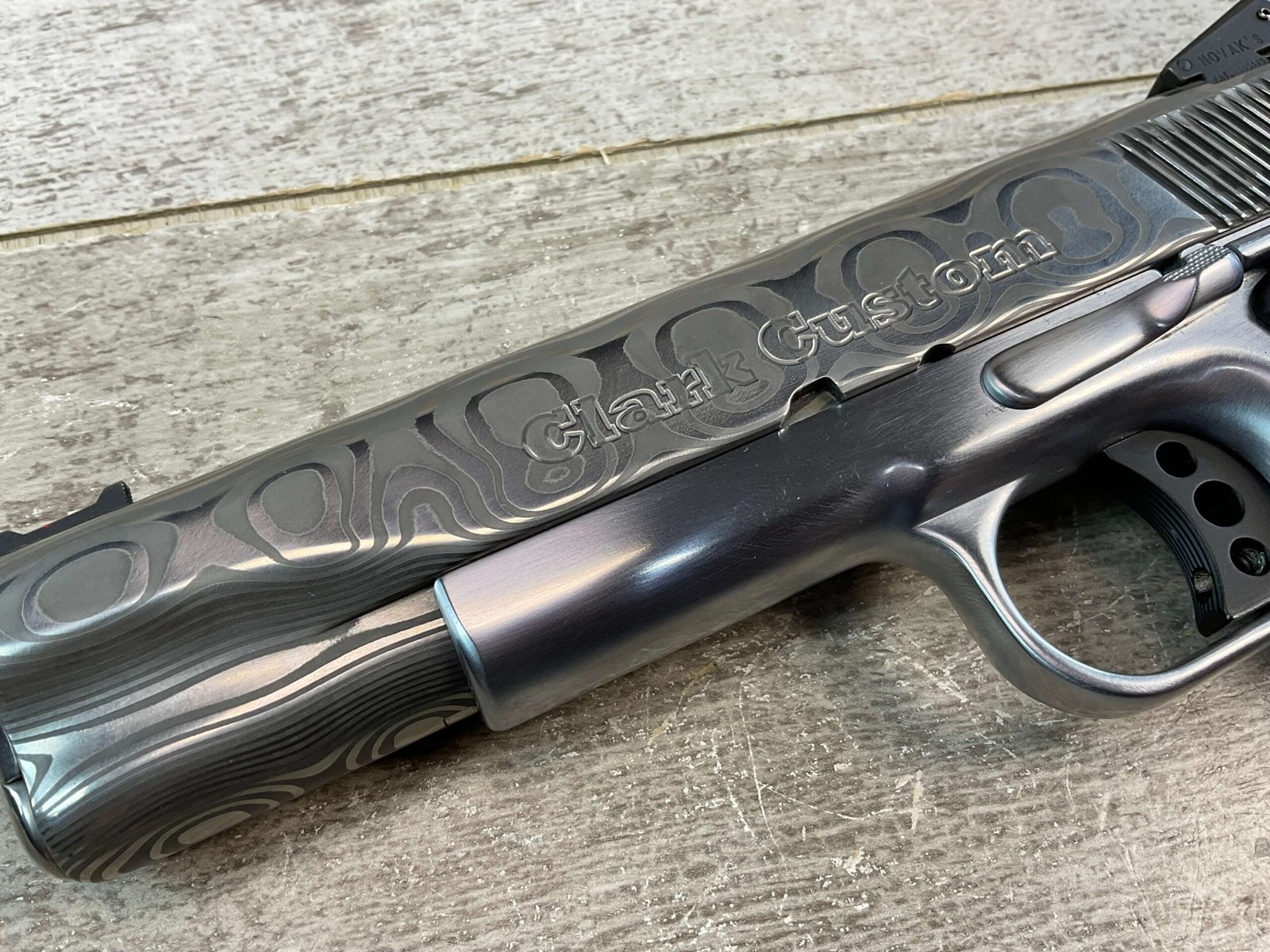 CLARK CUSTOM 50TH ANNIVERSARY MILLENNIUM MELTDOWN .45ACP SEMI AUTO PISTOL, JAMES EARL JONES COLLECTION #CCG-032, 5″ BARREL, MATCH BARREL, DAMASCUS SLIDE, DAMASCUS HAMMER, LO MOUNT NOVAK REAR SIGHT, FIBER FRONT SIGHT, KING AMBI EXTENDED THUMB SAFETY, KING BLACK LONG LITE TRIGGER, DOUBLE DIAMOND CHECKERED GRIPS, ACCURACY & TRIGGER JOB, HARD CHROMED LOWER, VERY CUSTOM & ONLY 50 MADE!!, CONDITION AS SHOWN IN PICTURES, FROM THE JAMES EARL JONES “FAVORITES” COLLECTION W/ CERTIFICATE OF AUTHENTICITY.