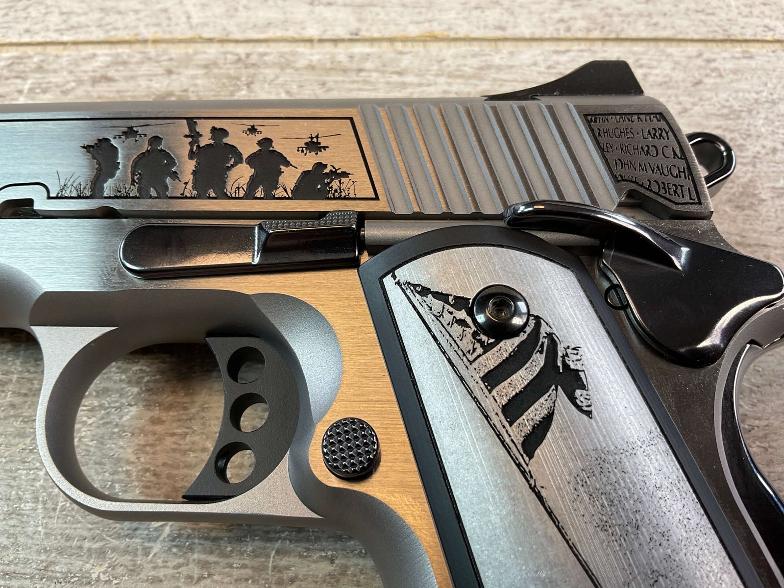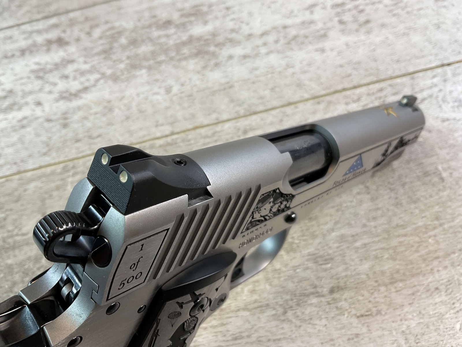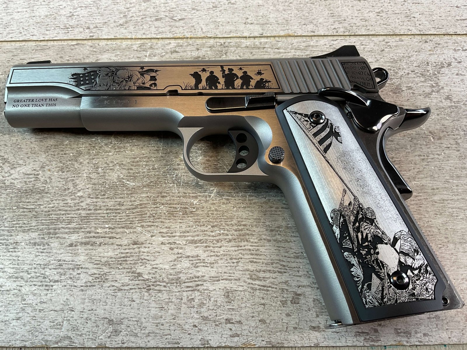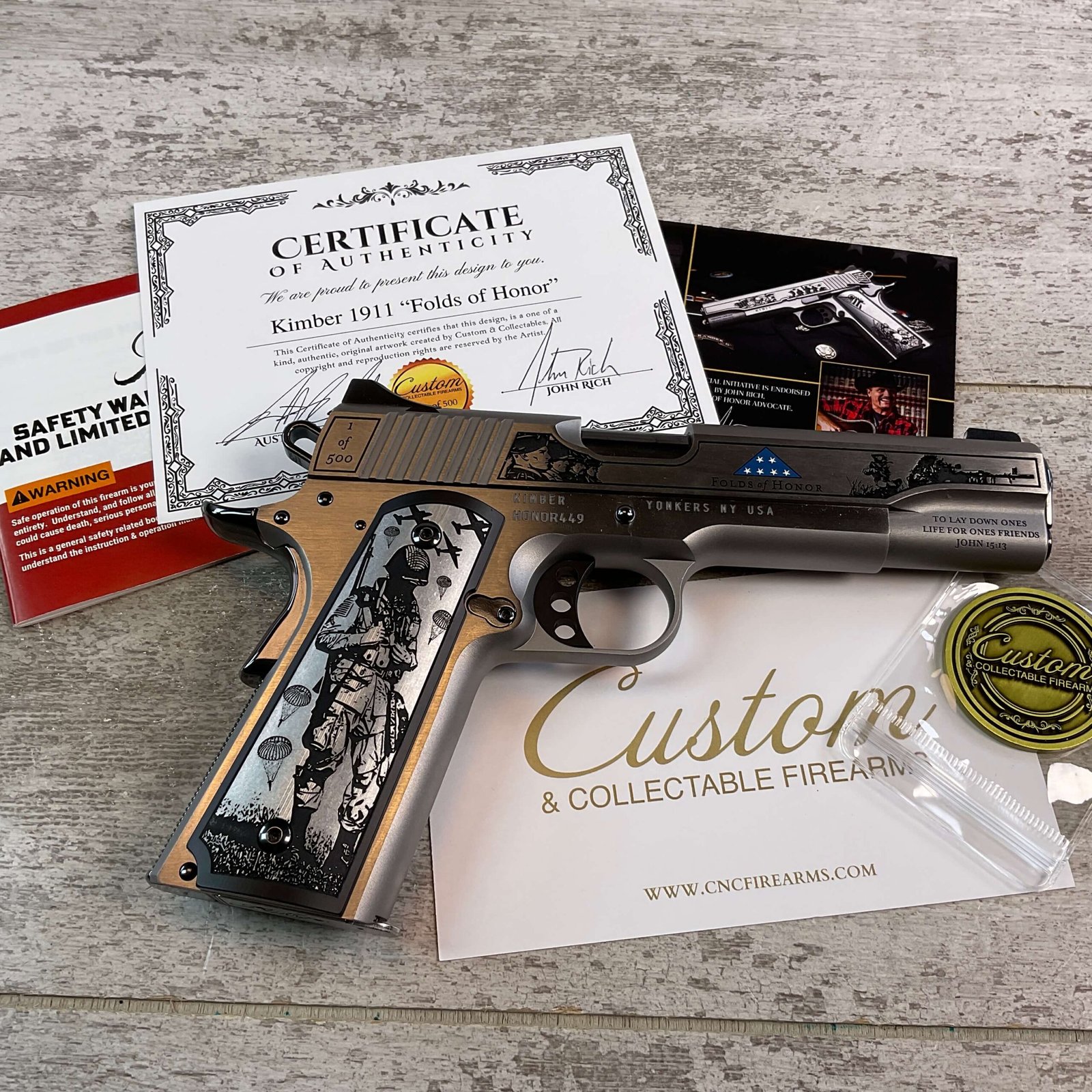 Custom & Collectable Firearms is proud to partner with Folds of Honor, a nonprofit organization that provides educational scholarships to the families of fallen or disabled U.S. service members and first responders. This limited-edition firearm is a true collector’s piece, engraved with historic war scenes and produced in a run of just 500 sequentially numbered Kimber 1911 pistols—each with an exclusive serial number run. This special series is proudly endorsed by country music star John Rich, a passionate supporter of Folds of Honor foundation.